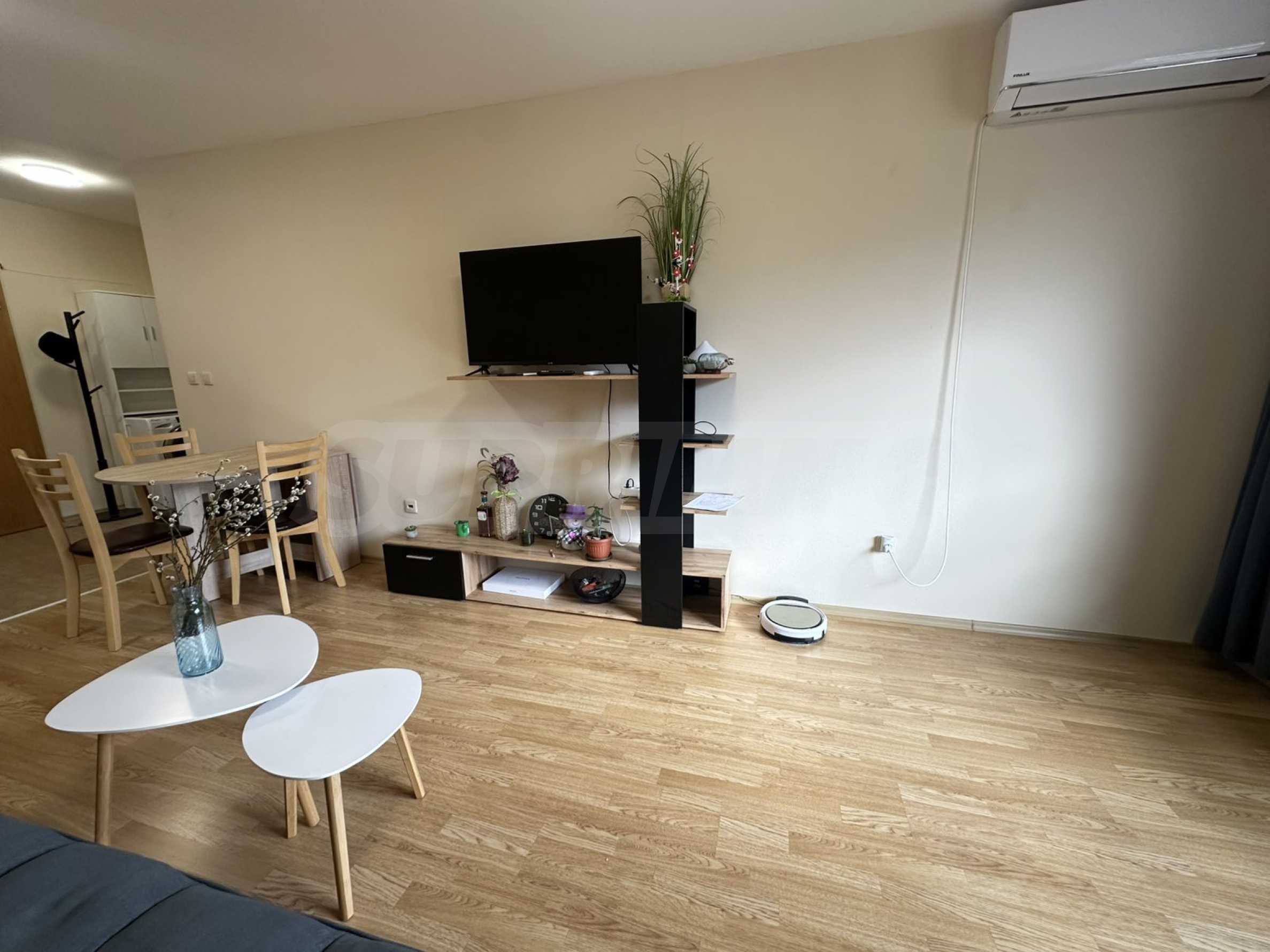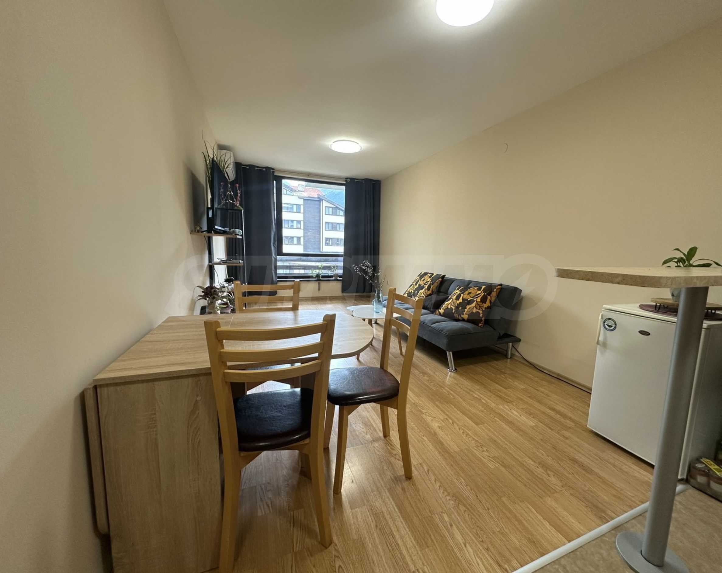 • Светла и уютна дневна с големи прозорци, създаващи усещане за простор и комфорт. Обзаведена с удобен разтегателен диван, холна маса и телевизор;
