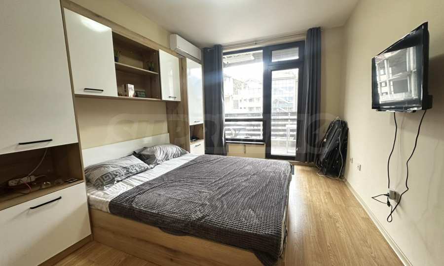 • Самостоятелна спалня, предлагаща голямо легло с качествен матрак, гардероб с достатъчно място за съхранение, плазмен телевизор и балкон;