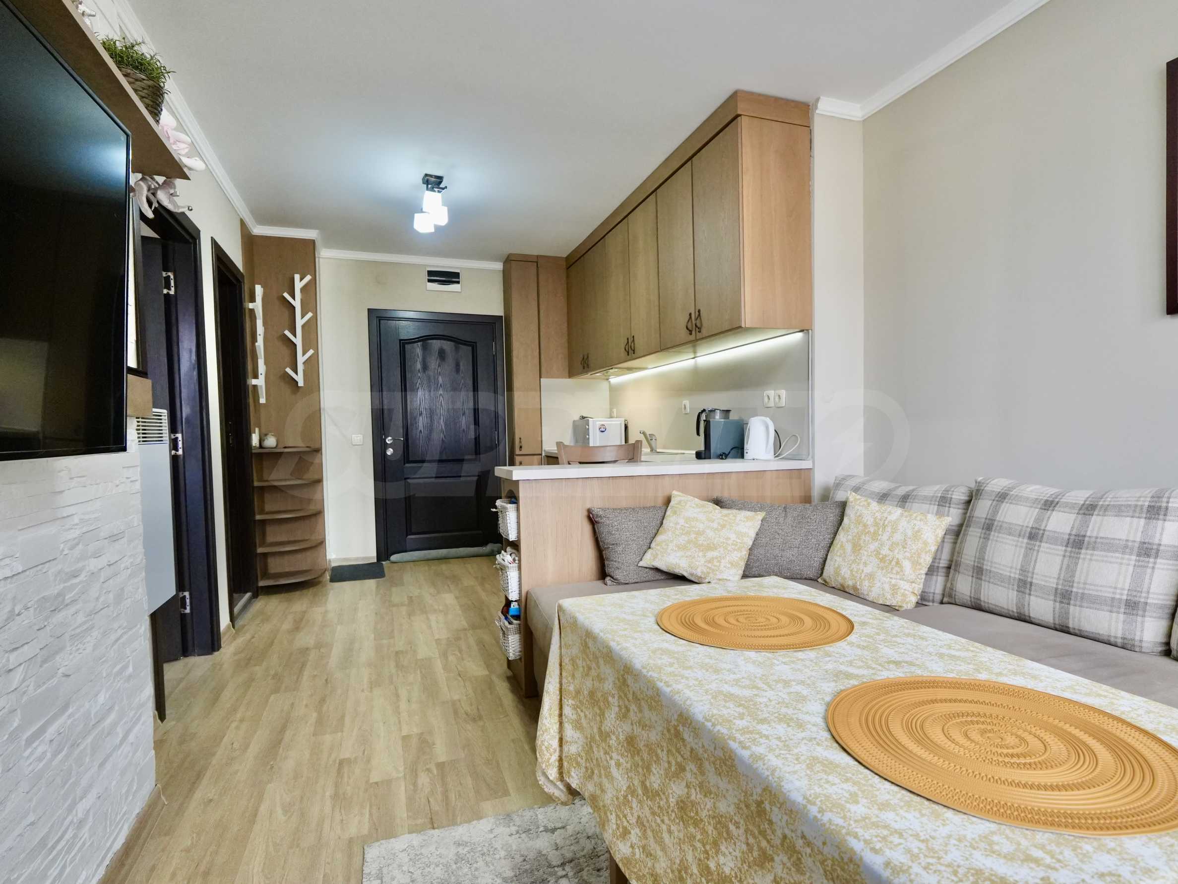 Светла и уютна дневна зона с ъглов диван, холна маса и телевизор, с излаз към балкон, напълно оборудвана модерна кухня, комфортна самостоятелна спалня с гардероб и телевизор, както и стилна баня с душ кабина и тоалетна