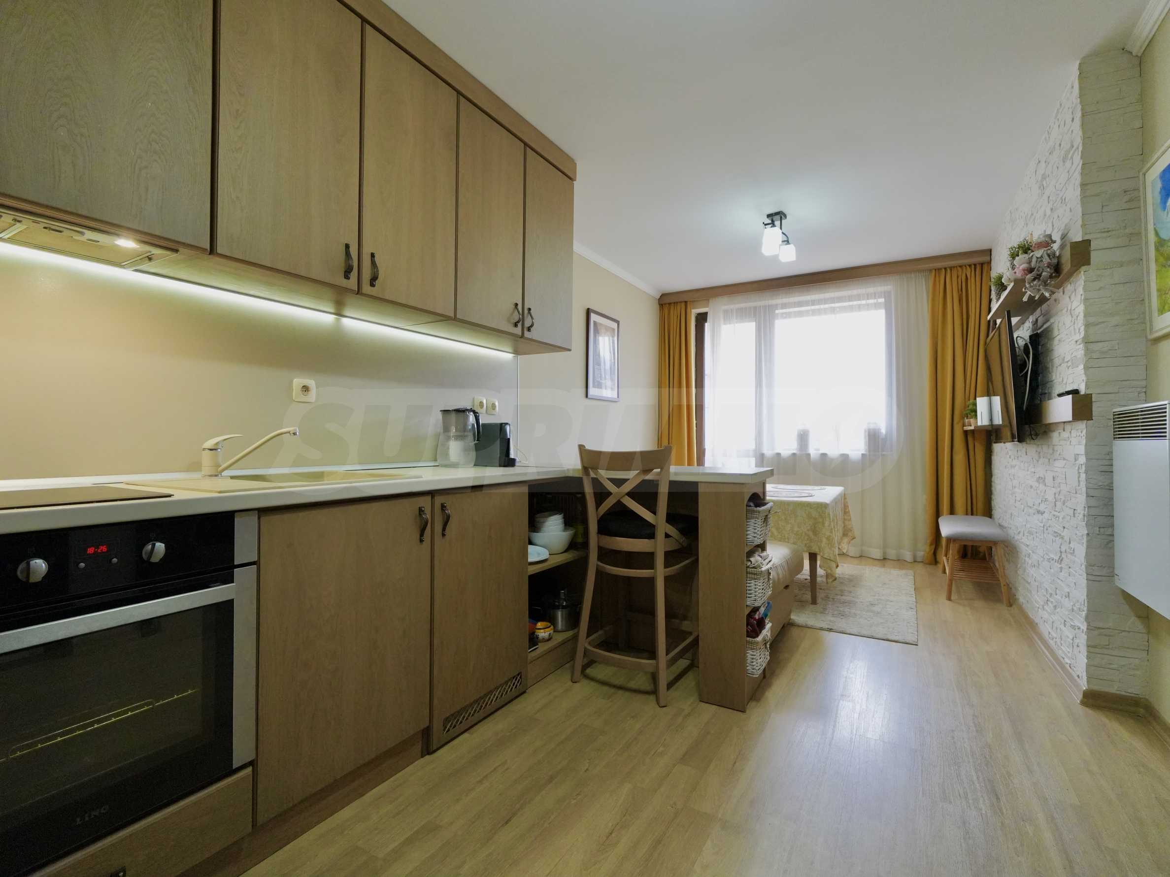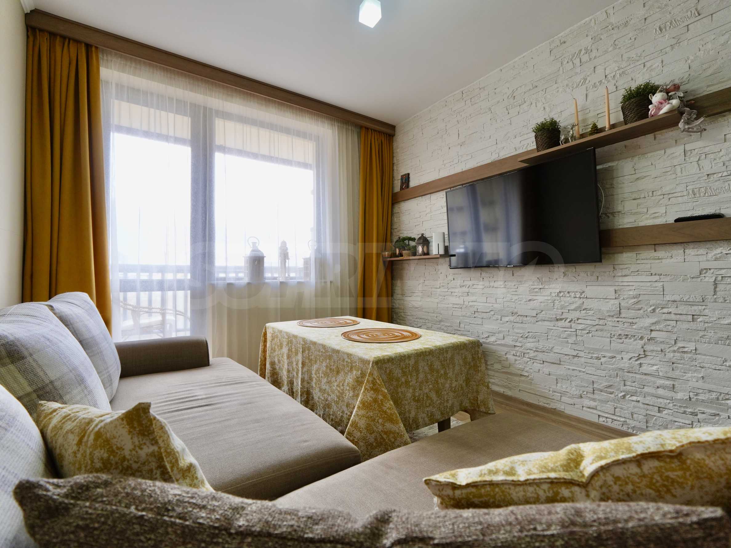 Представяме реновиран двустаен апартамент, разположен в един от най-предпочитаните комплекси в Банско – „Мария-Антонета“, само на няколко минути пеша от кабинковия лифт.