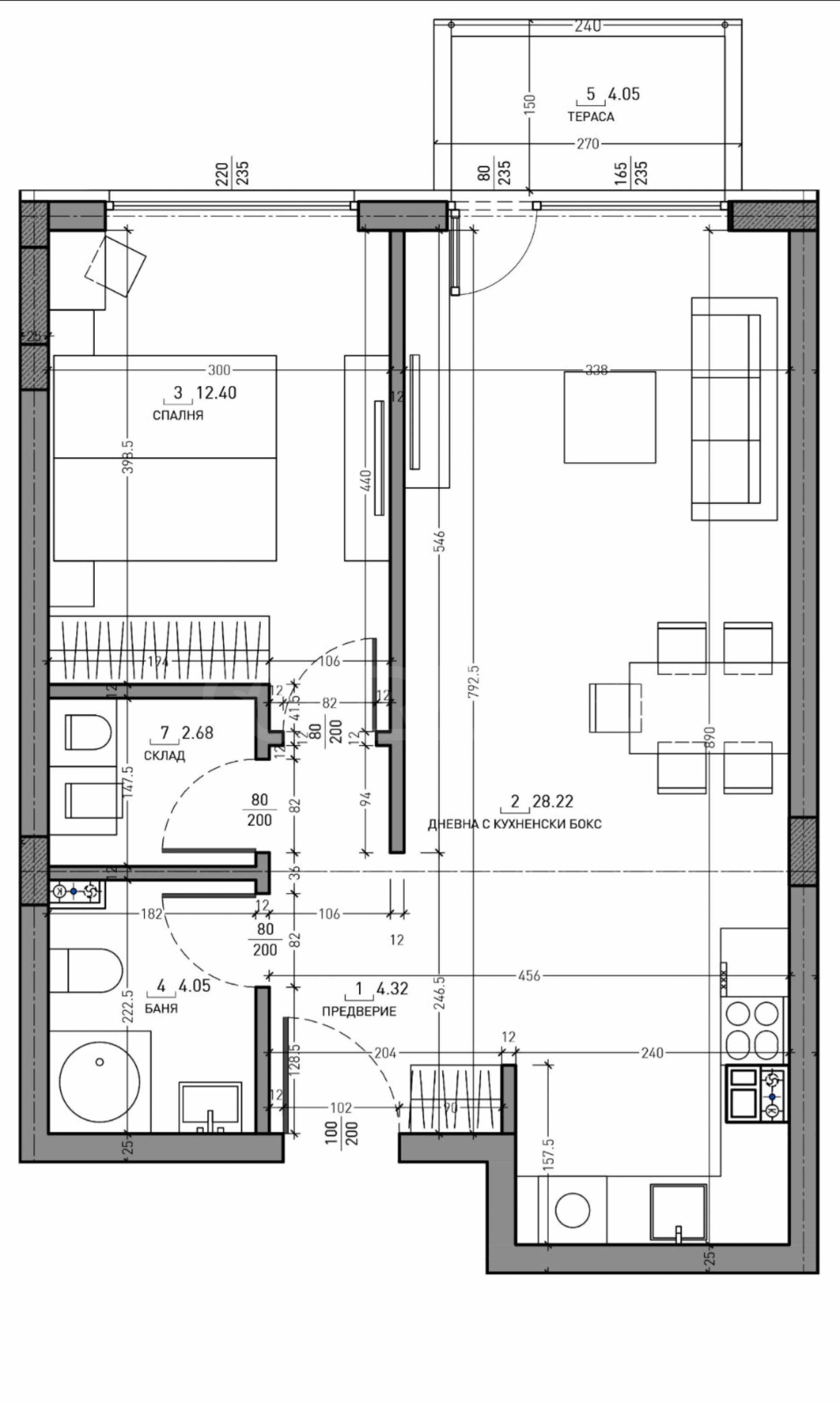 дневна с кухня и трапезария - 28,22 кв.м.;