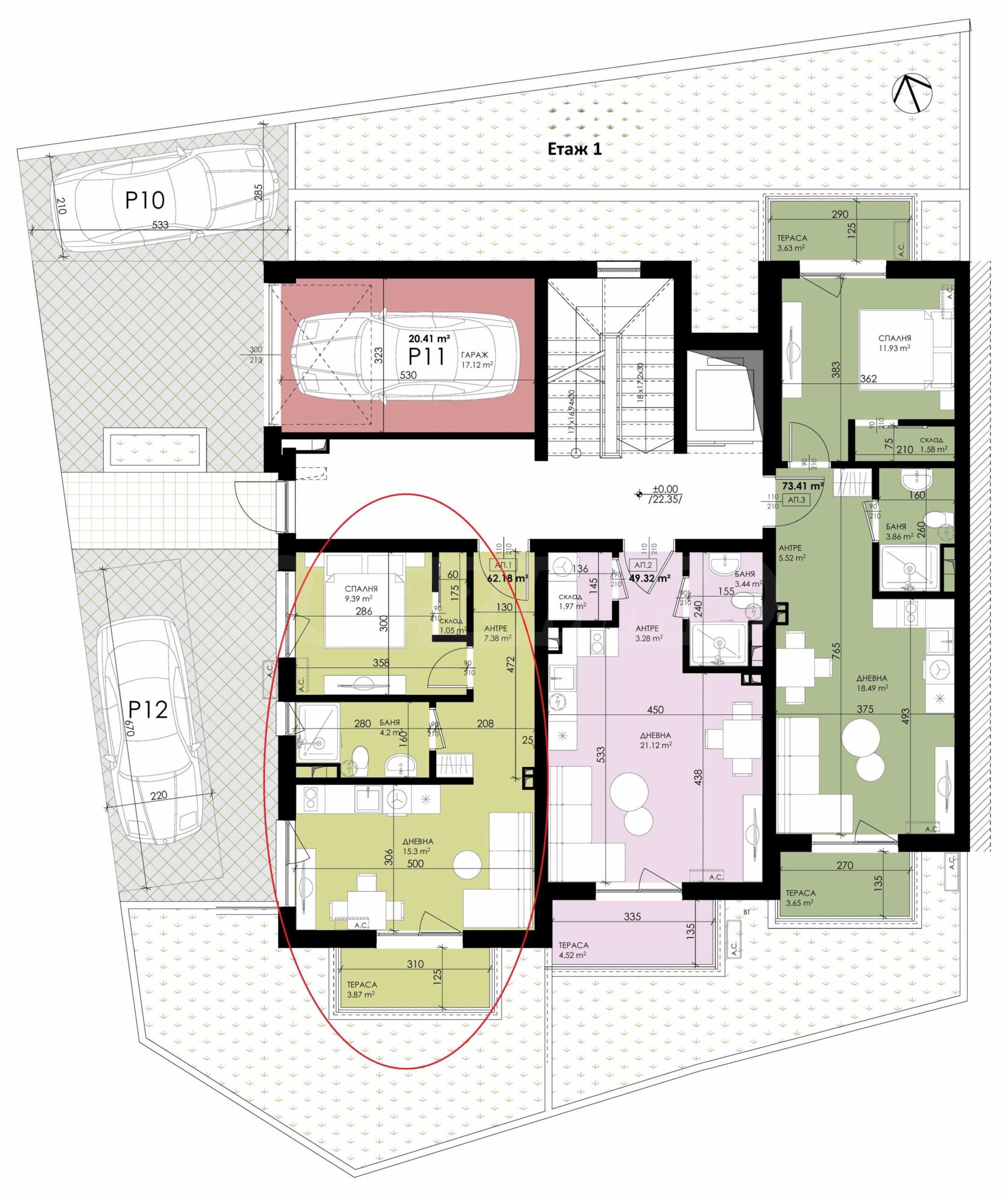 Имотът е с обща площ от 73,92 кв.м, разположен на първи етаж, със собствен двор с площ от 11,70 кв.м и изложение юг/запад.
