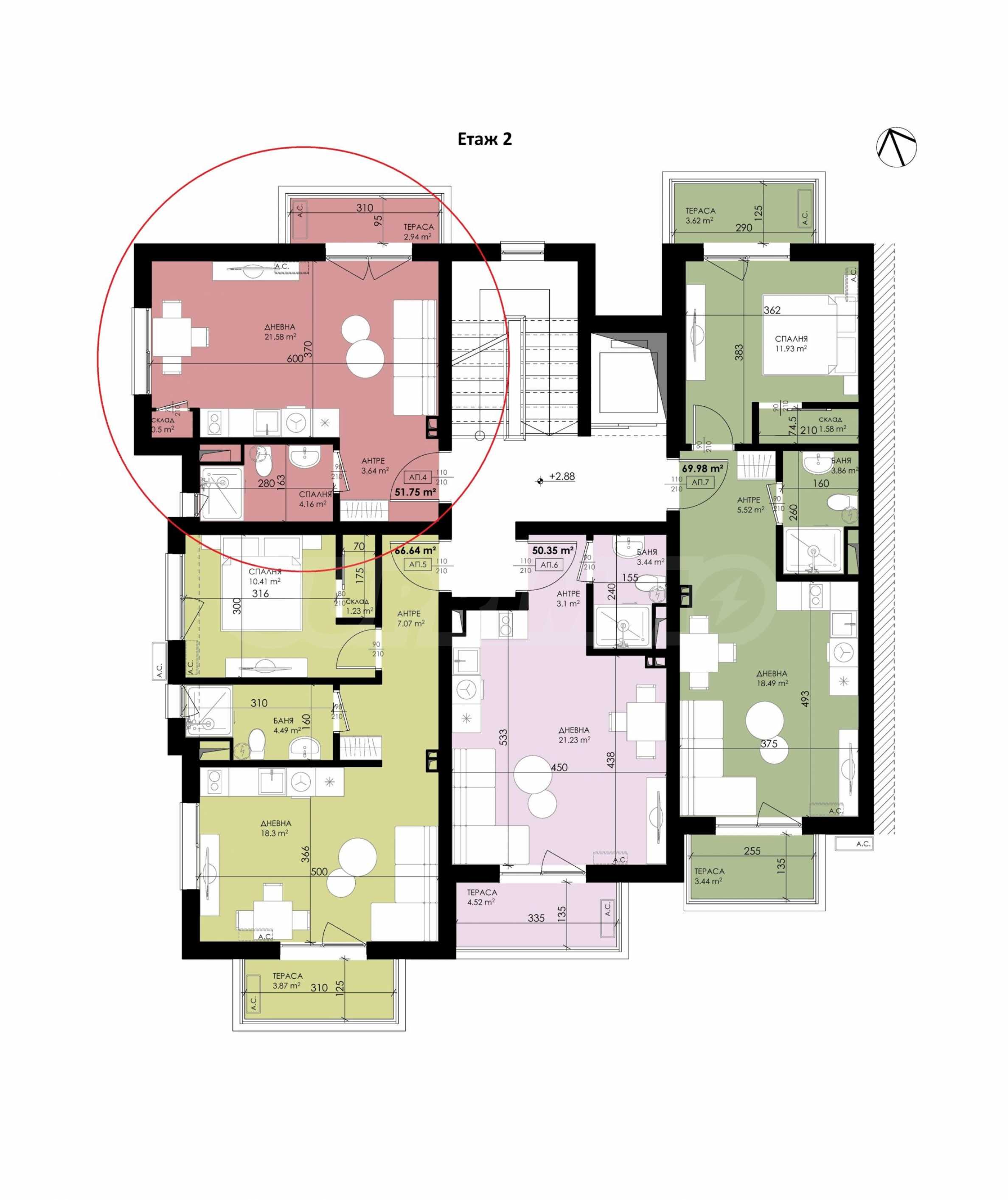 Имотът е с обща площ от 51,77 кв.м, разположен на втори етаж с изложение север/запад. Разпределението включва антре, дневна с кухня, баня с тоалет и тераса. Към жилището има прилежащ склад с площ от 2,82 кв.м в подземния етаж на сградата.