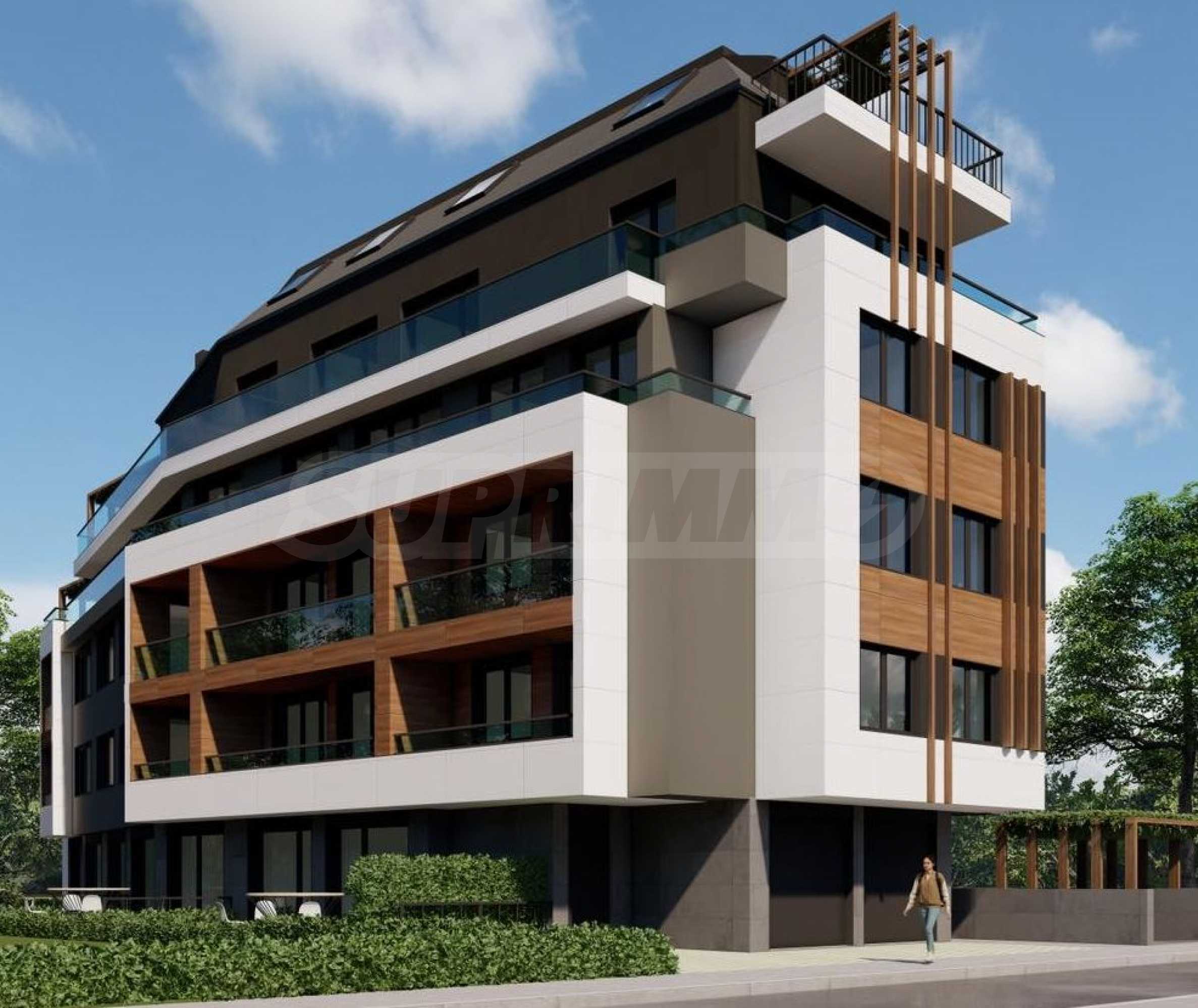 Сградата впечатлява със своята модерна архитектурна визия, съчетаваща изчистени линии, елегантни фасадни решения и внимателно подбрани материали, които придават усещане за стил, престиж и съвременен градски комфорт. Проектът е проектиран с внимание към всеки детайл, като акцентът е поставен върху функционалните разпределения, оптималното използване на пространството и максималния достъп на естествена светлина чрез големи френски прозорци.