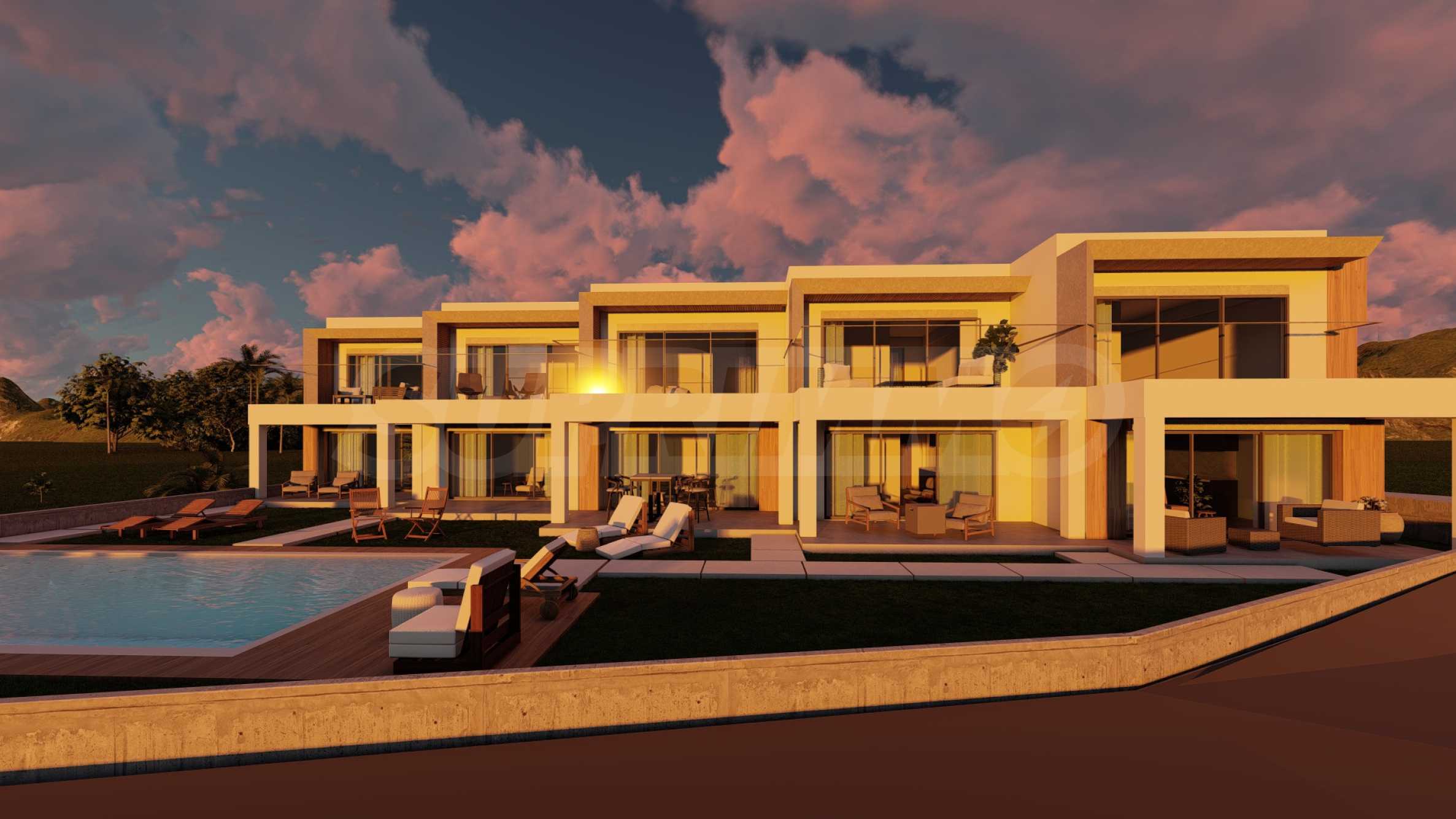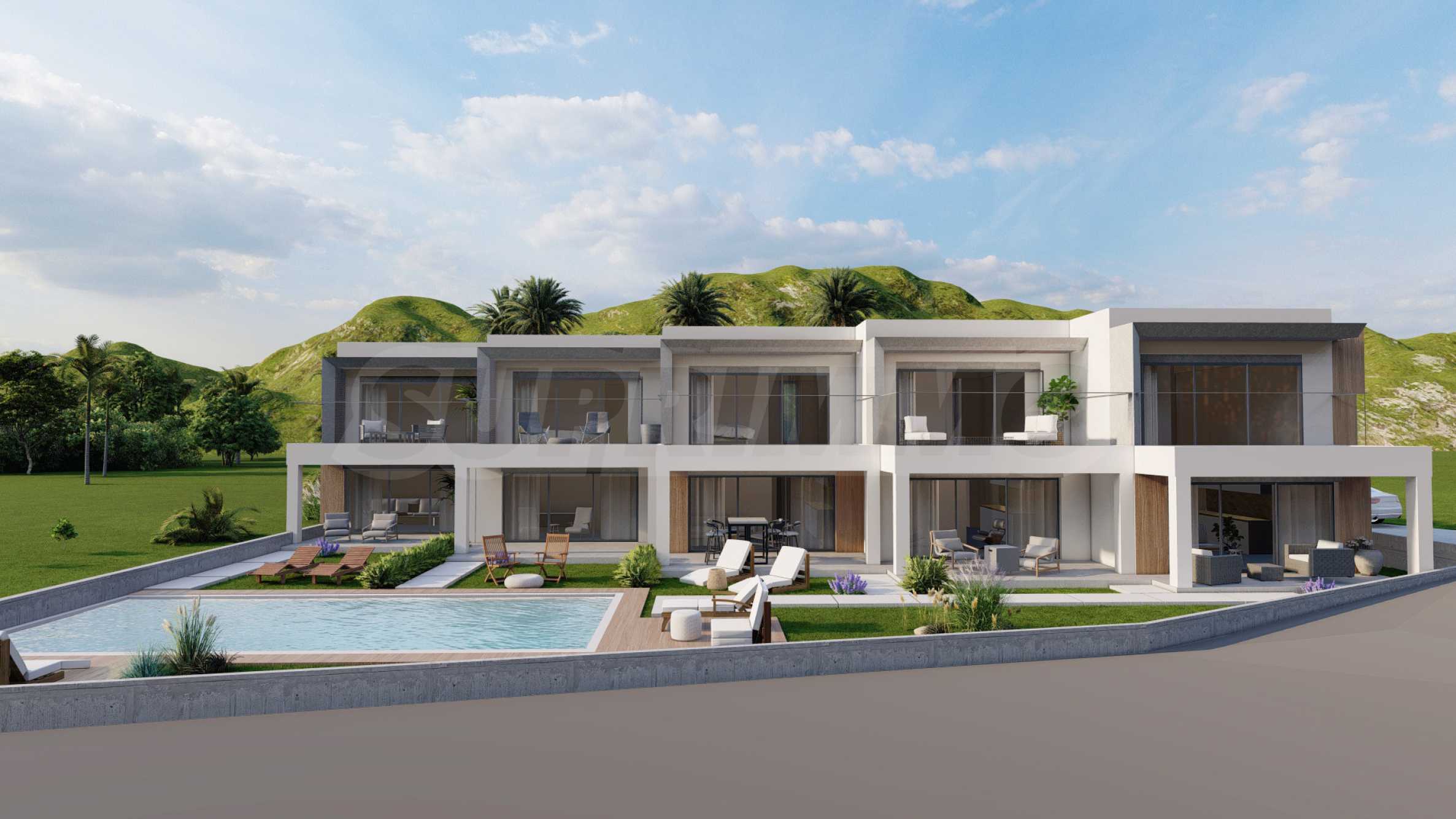 Комплексът е разположен на върха на хълм в Кариани, което осигурява впечатляваща панорамна гледка към морето. Екстериорът е проектиран с внимание към детайла, с изчистени линии и съвременна визия, характерна за модерната архитектура. При строителството са използвани висококачествени материали, гарантиращи устойчивост и дълготрайност, а озелененият и добре поддържан двор допълва усещането за комфорт и завършеност.
