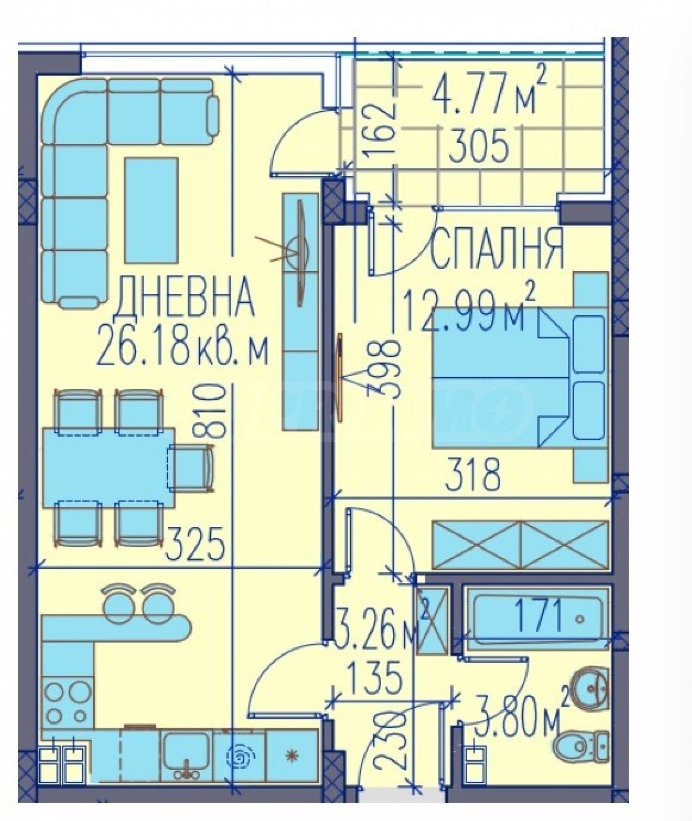 Апартаментът се продава в степен на завършеност по БДС, на шпакловка и замазка. Има прилежащо мазе с площ 2,5 кв.м.