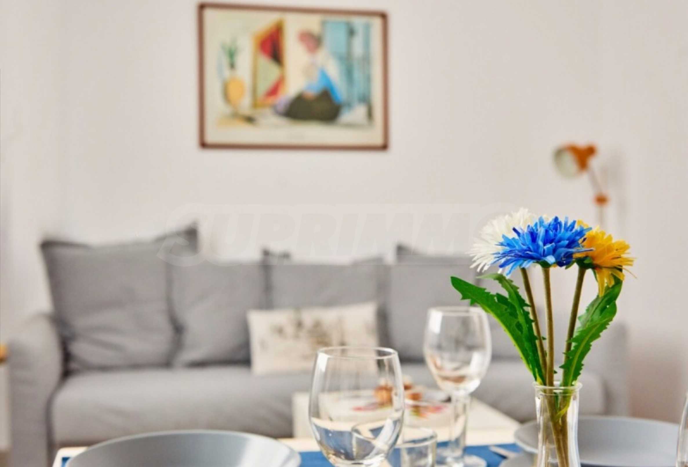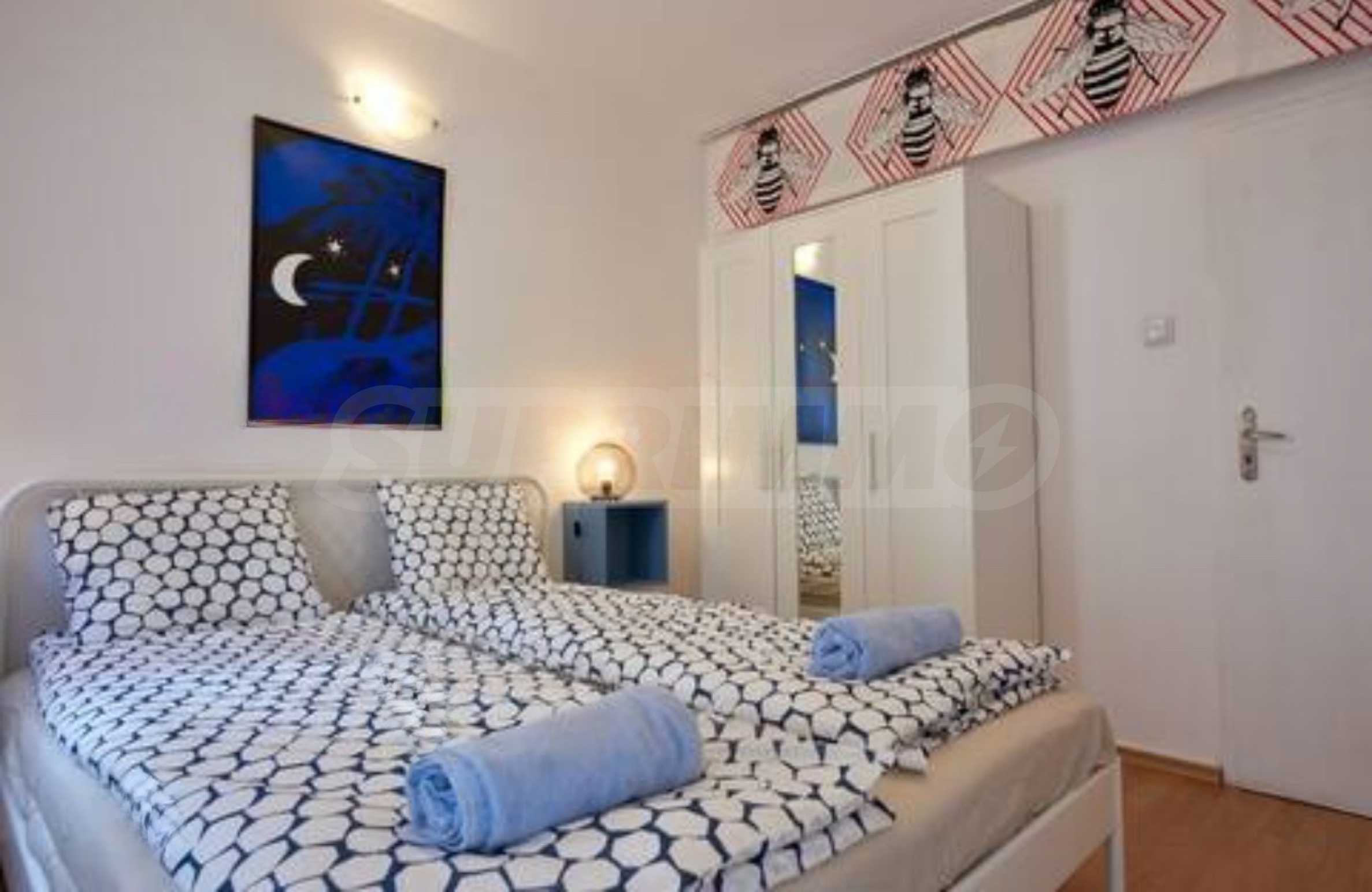 Жилището разполага с две самостоятелни спални, обзаведени с удобни легла и достатъчно пространство за съхранение. Просторният хол е съчетан с модерна и напълно оборудвана кухня, включваща всички необходими електроуреди за едно домакинство - хладилник, фурна, котлони, аспиратор и съдомиялна машина. В дневната зона ще откриете уютна мека мебел и телевизор, създаващи идеална атмосфера за почивка и развлечения. За допълнително удобство на наемателите е осигурена пералня със сушилня. Банята с тоалетна е стилно завършена и функционално оборудвана. Имотът разполага и с два балкона, които предоставят възможност за отдих на открито и допълнителна светлина в помещенията.