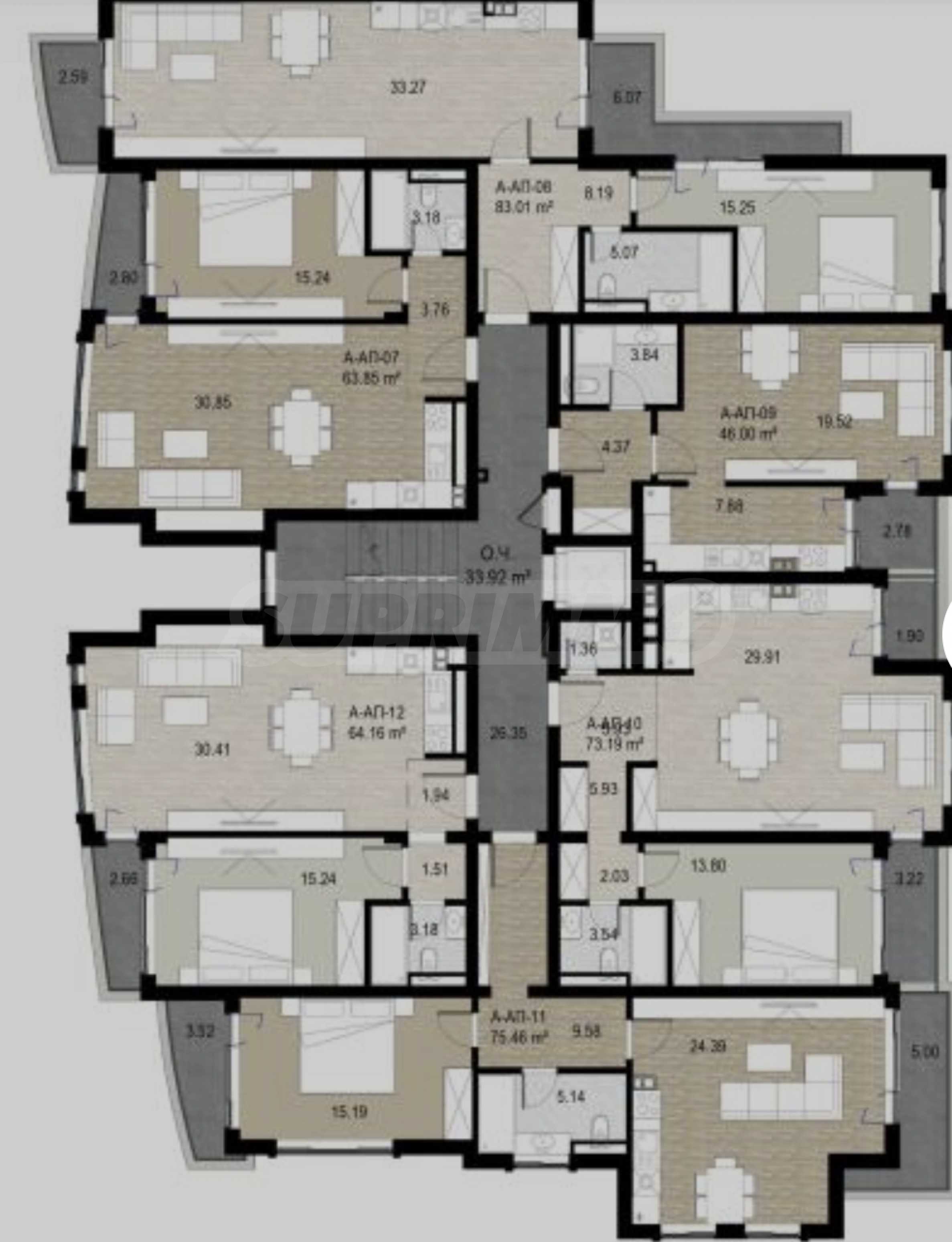 Апартаментът е разположен на трети етаж и предлага тристранно изложение – юг, изток и запад, което осигурява отлична осветеност през целия ден.