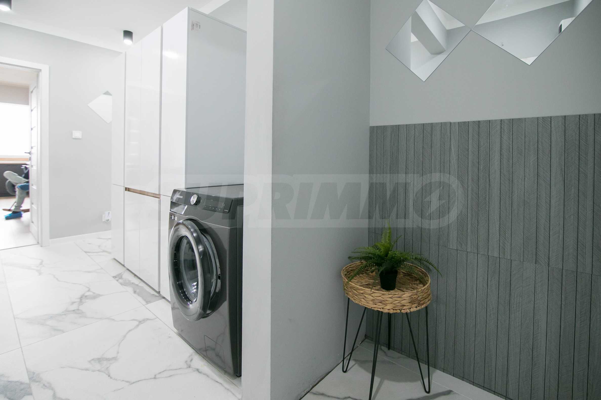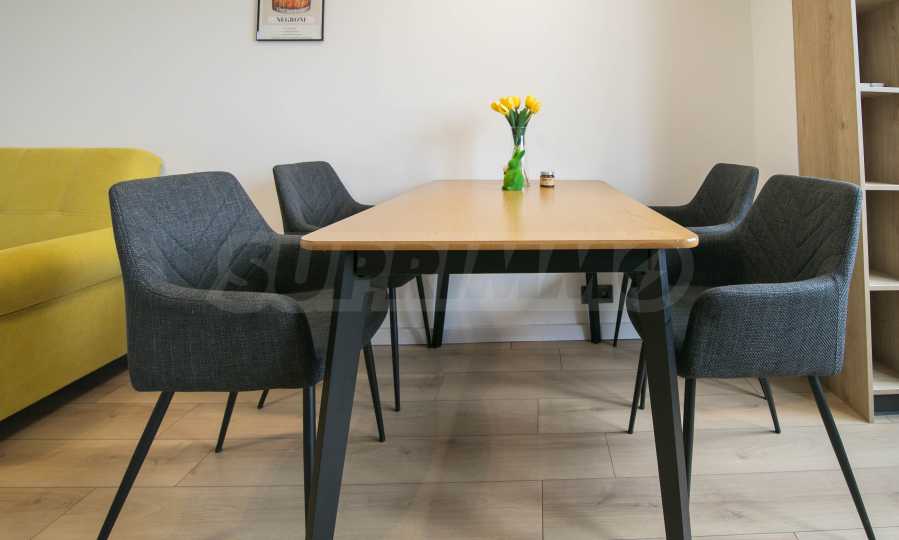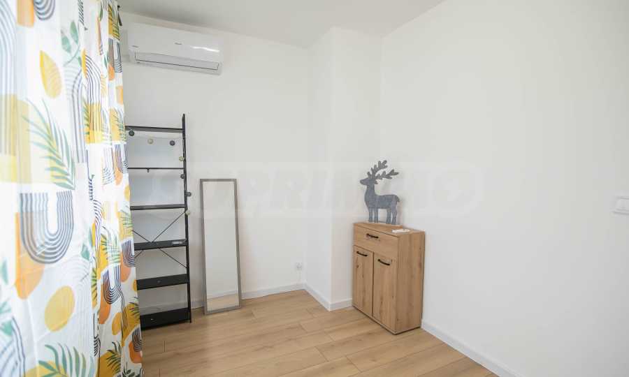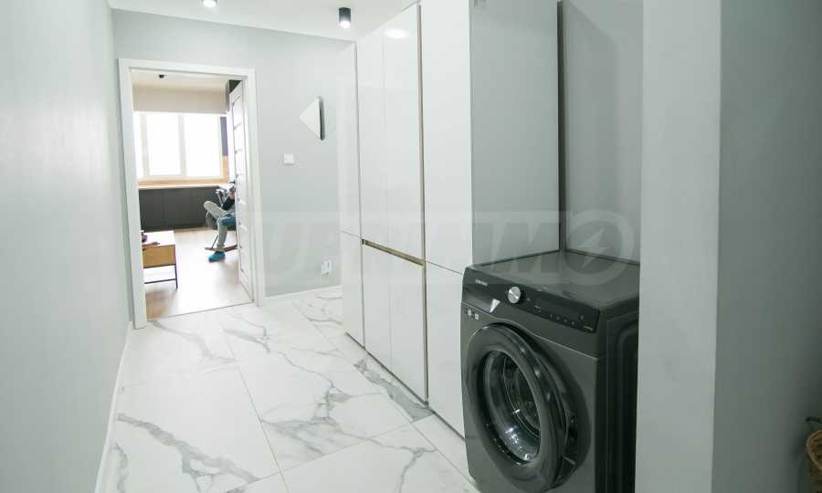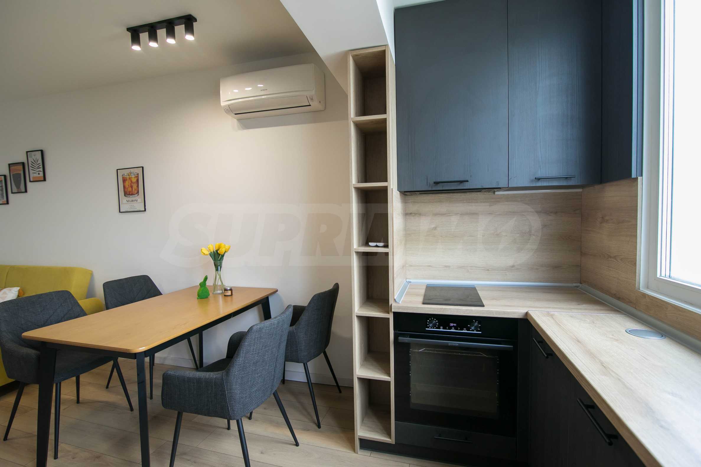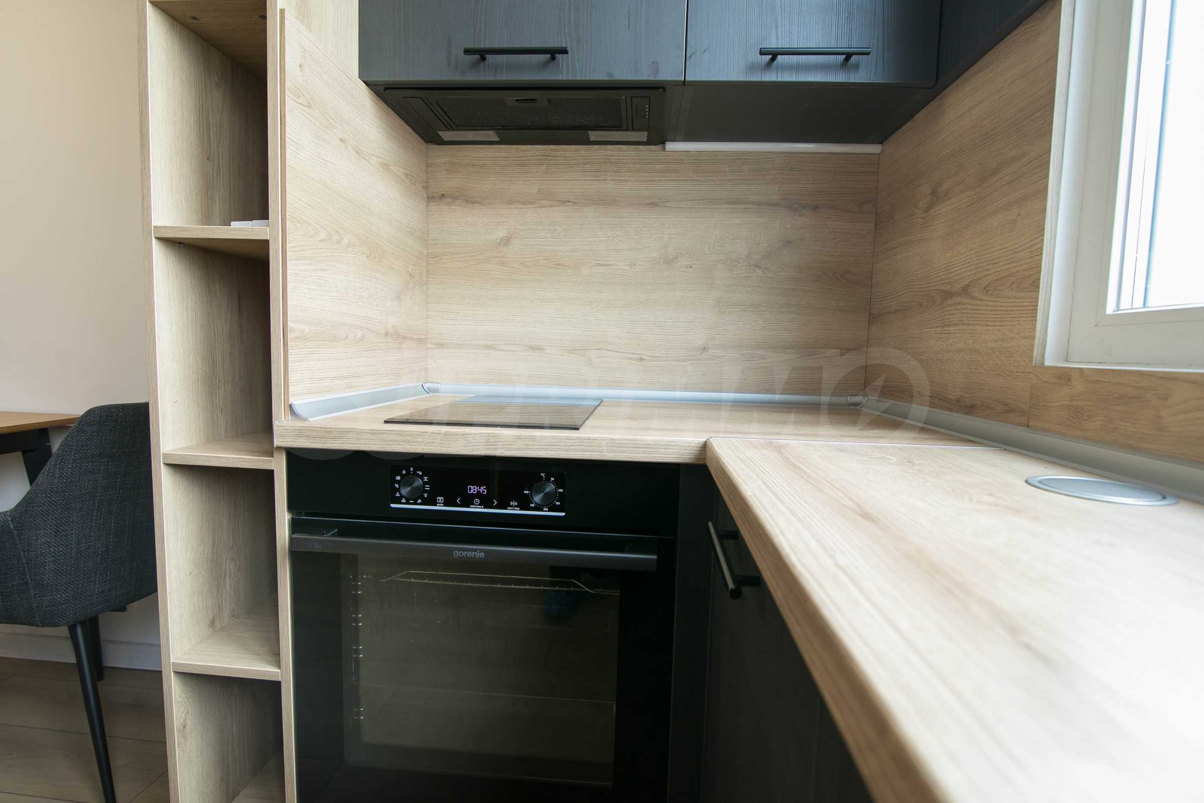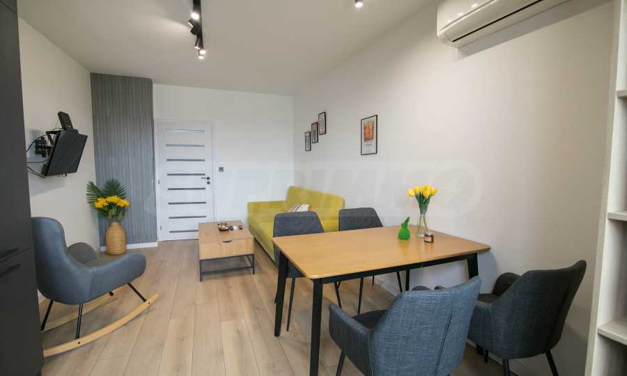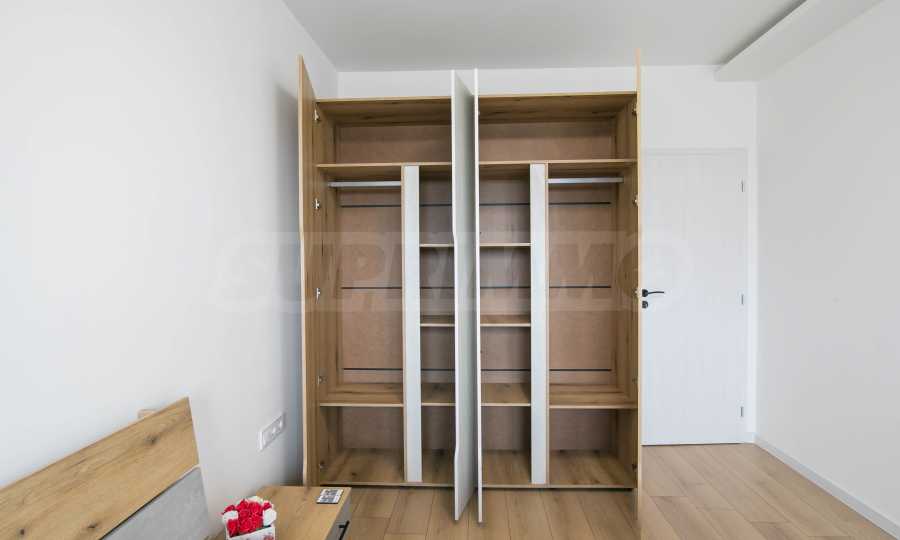 Имотът е обзаведен с чисто нови мебели и електроуреди. Жилището е напълно оборудвано с всичко необходимо за едно домакинство, като уредите са вградени – хладилник, съдомиялна машина, фурна и котлони.