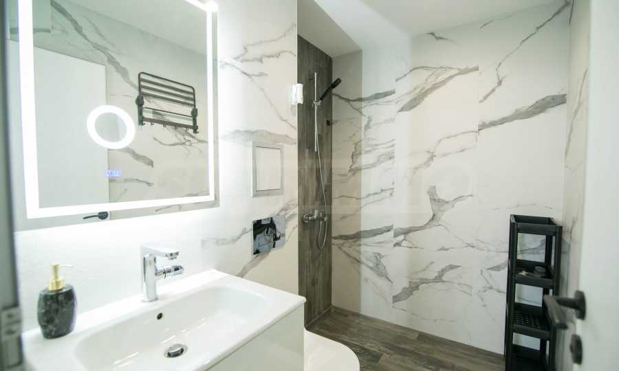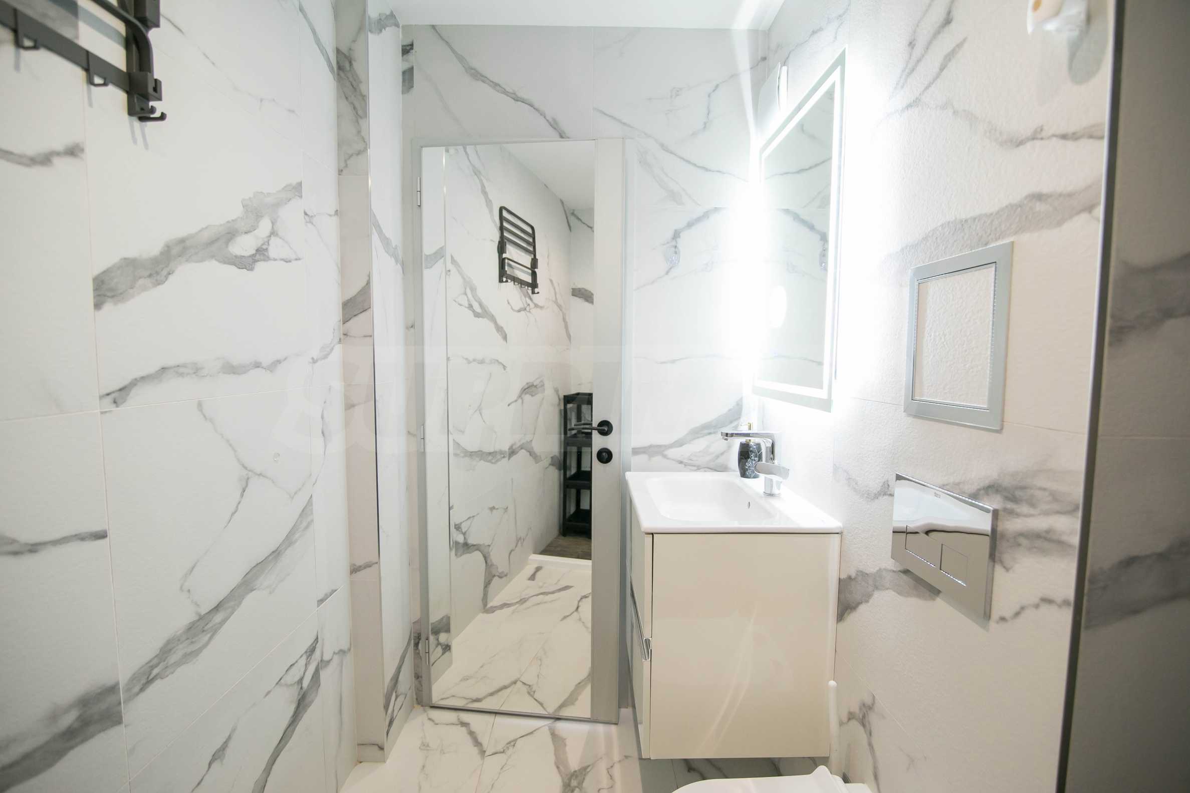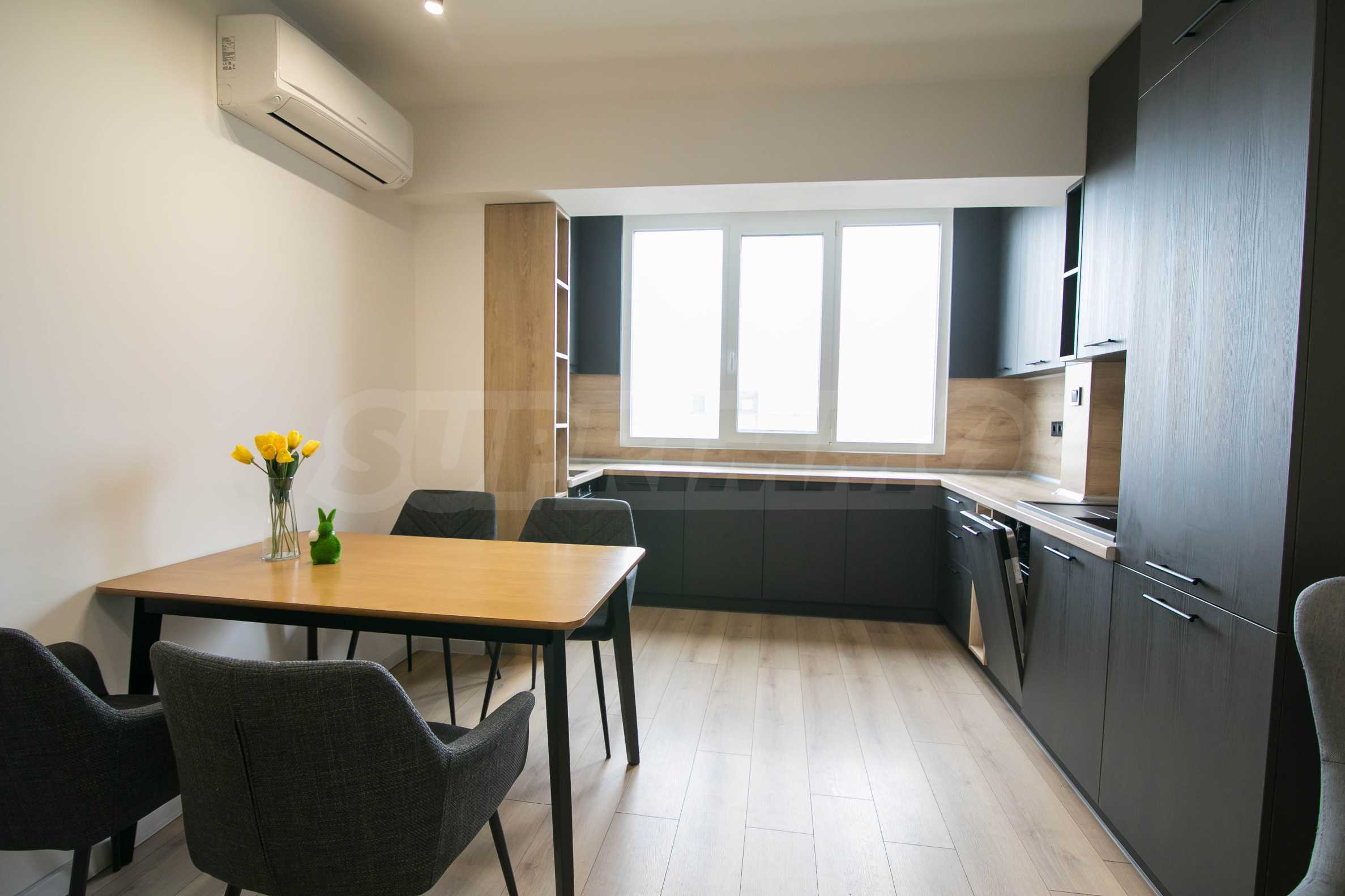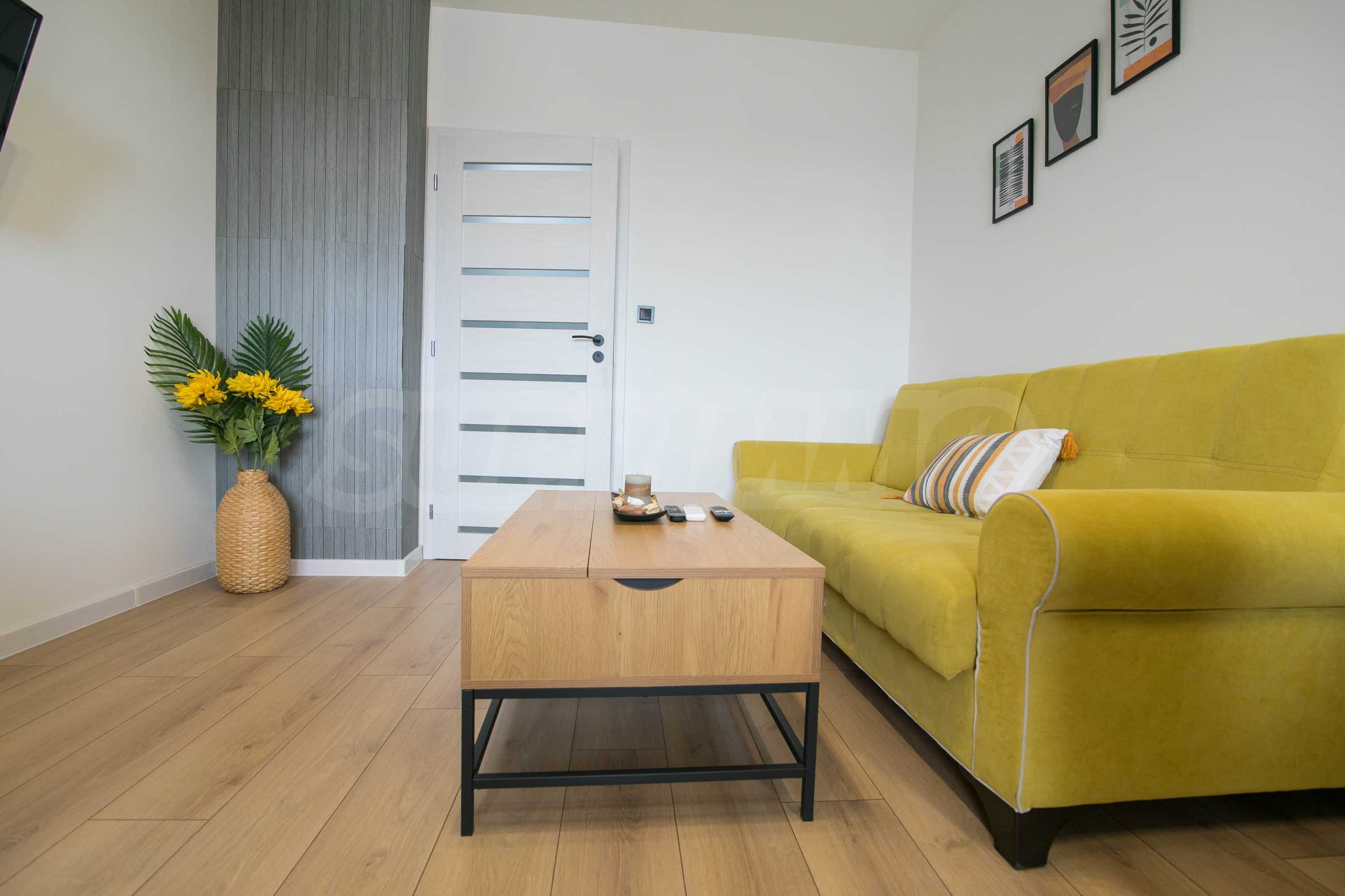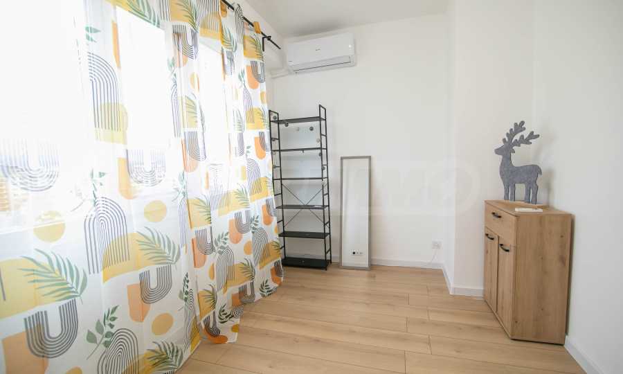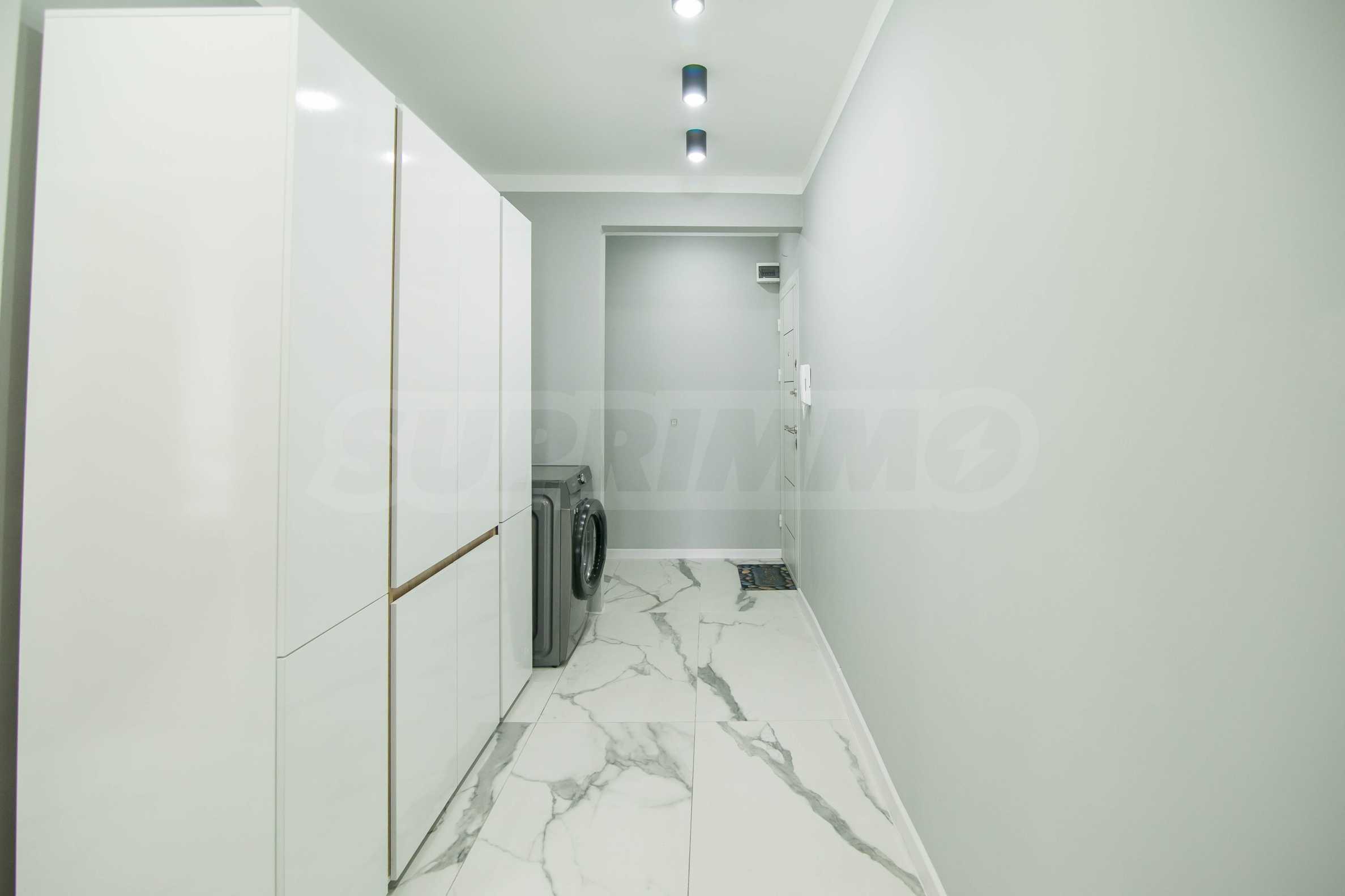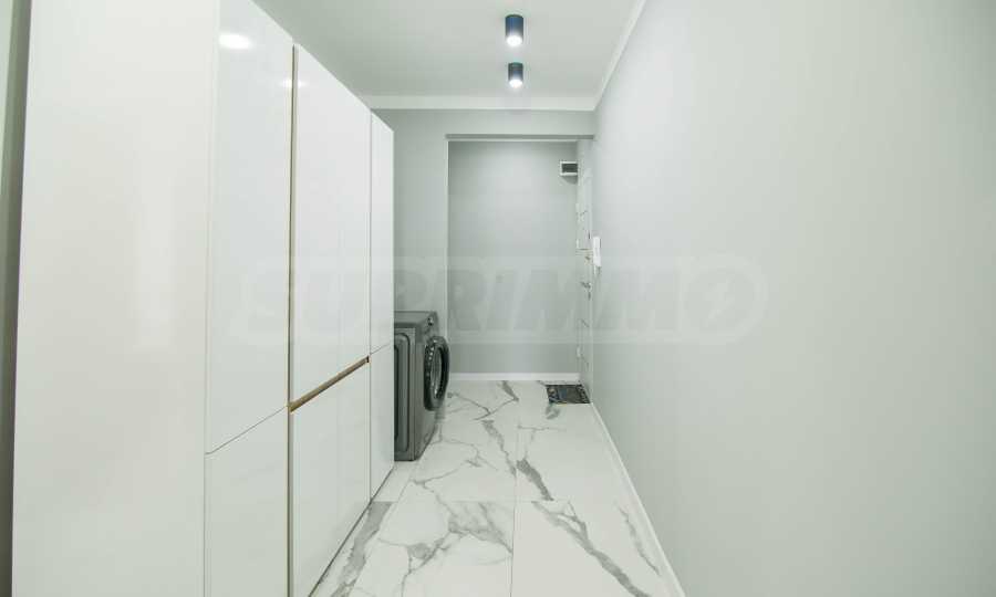 Имотът е обзаведен с чисто нови мебели и електроуреди. Жилището е напълно оборудвано с всичко необходимо за едно домакинство, като уредите са вградени – хладилник, съдомиялна машина, фурна и котлони.