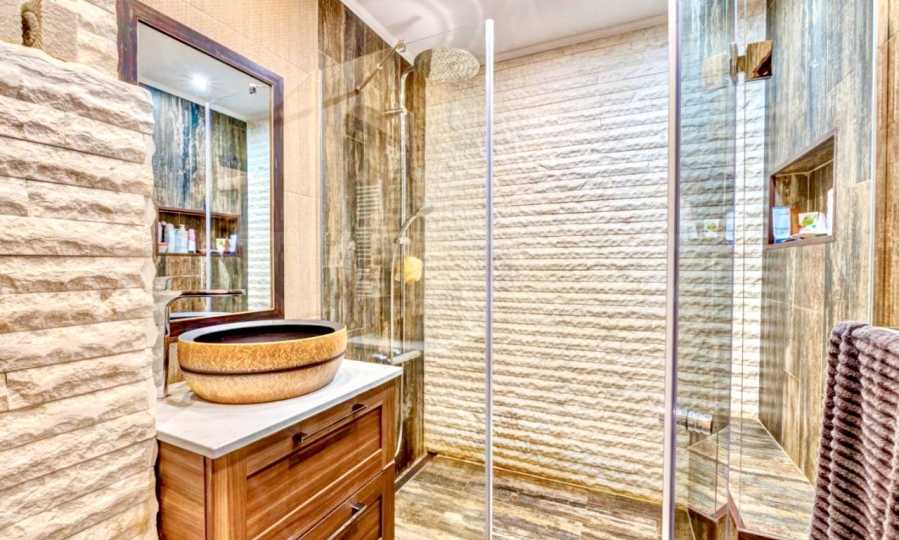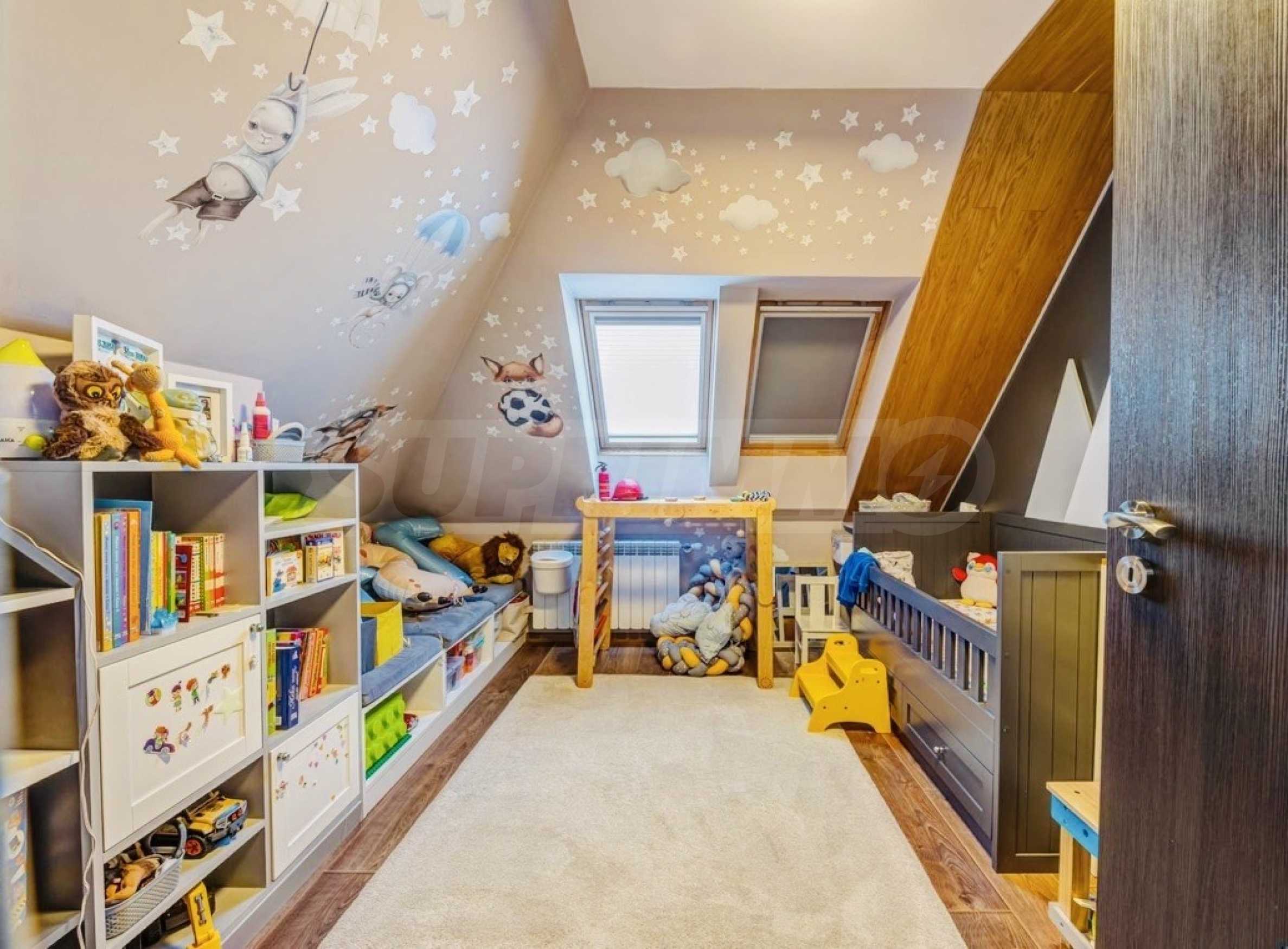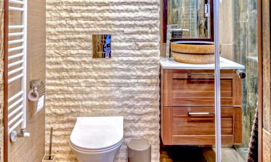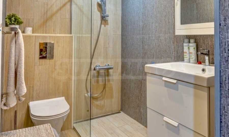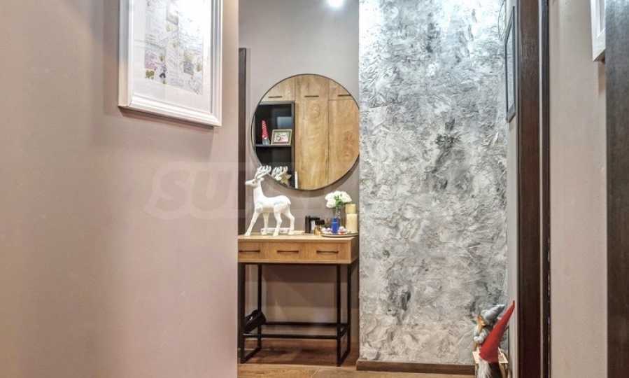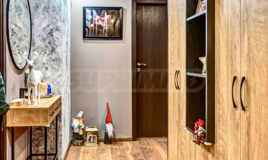 Апартаментът е изпълнен с висок клас довършителни работи и материали, сред които естествено дърво Tarkett, естествен камък в санитарните помещения и внимателно подбрани интериорни решения, създаващи усещане за завършен и хармоничен дом.