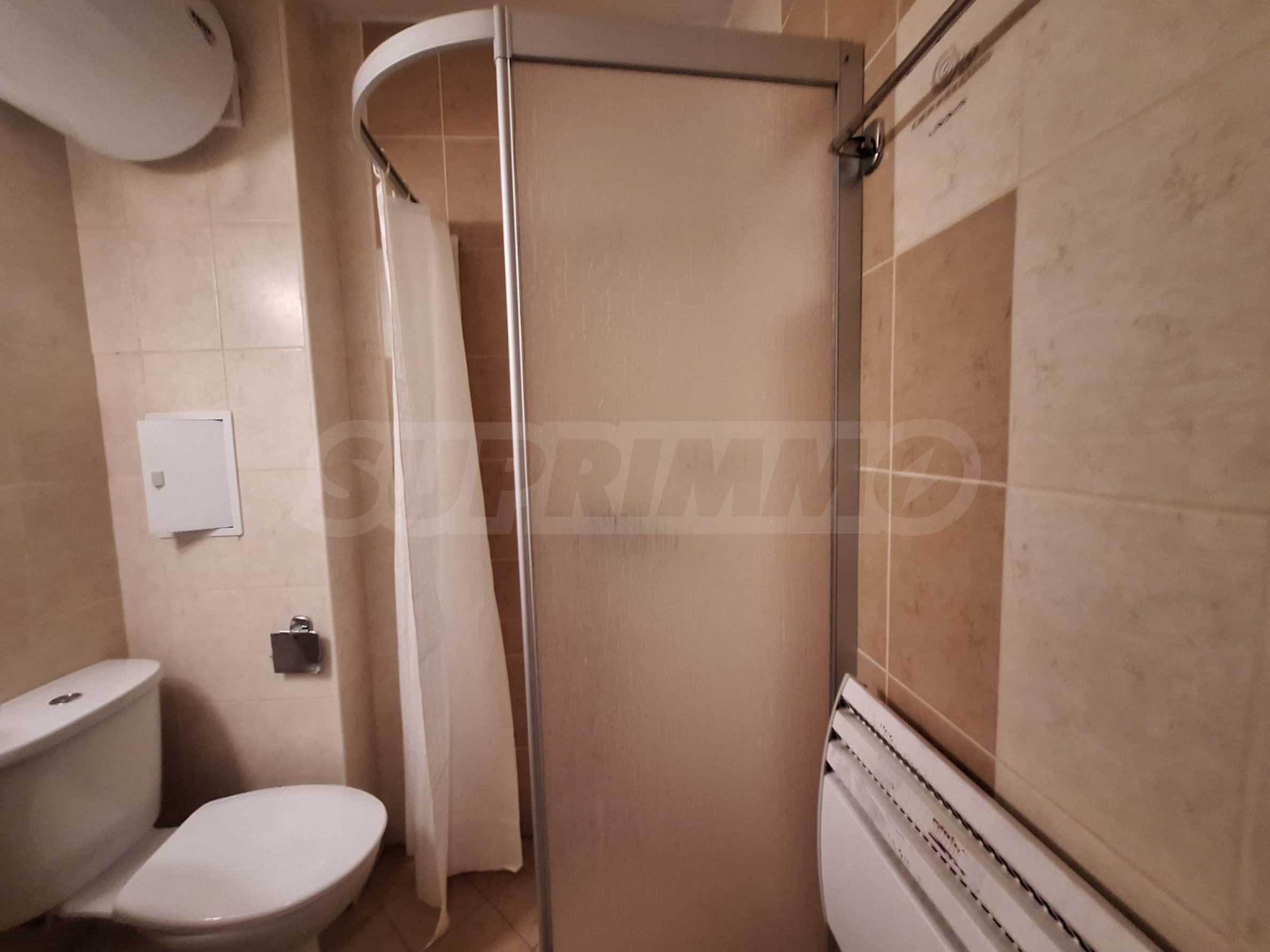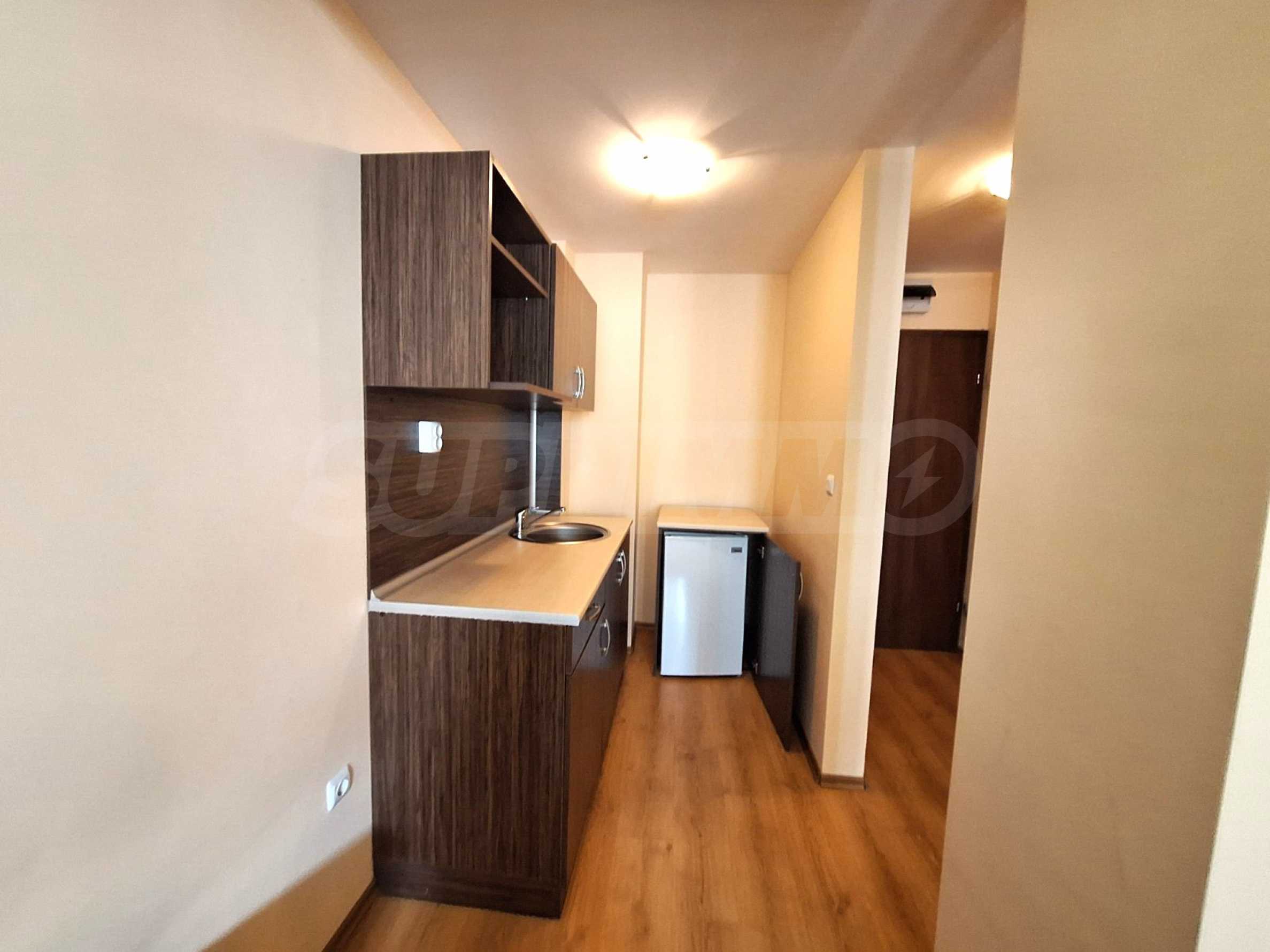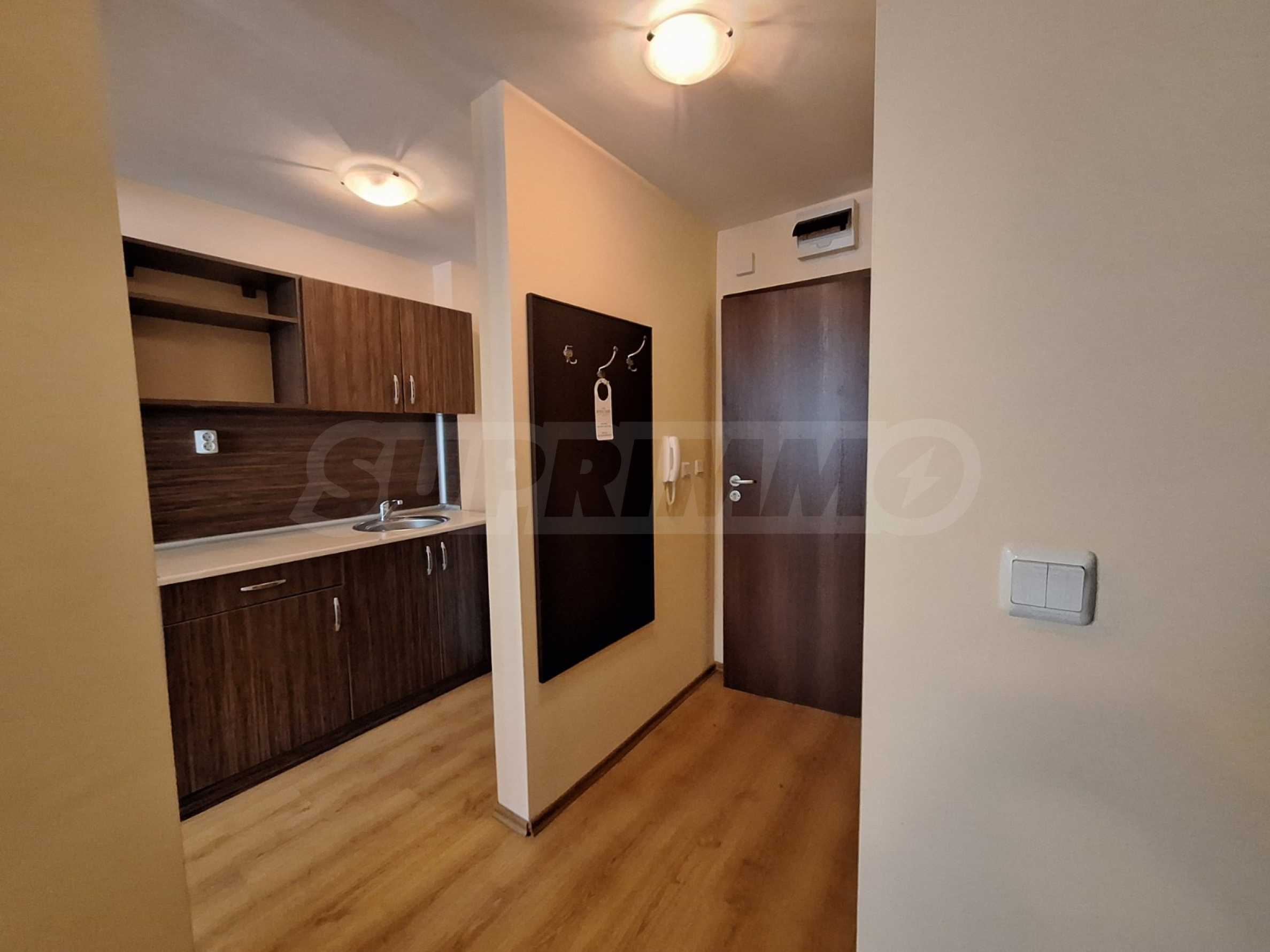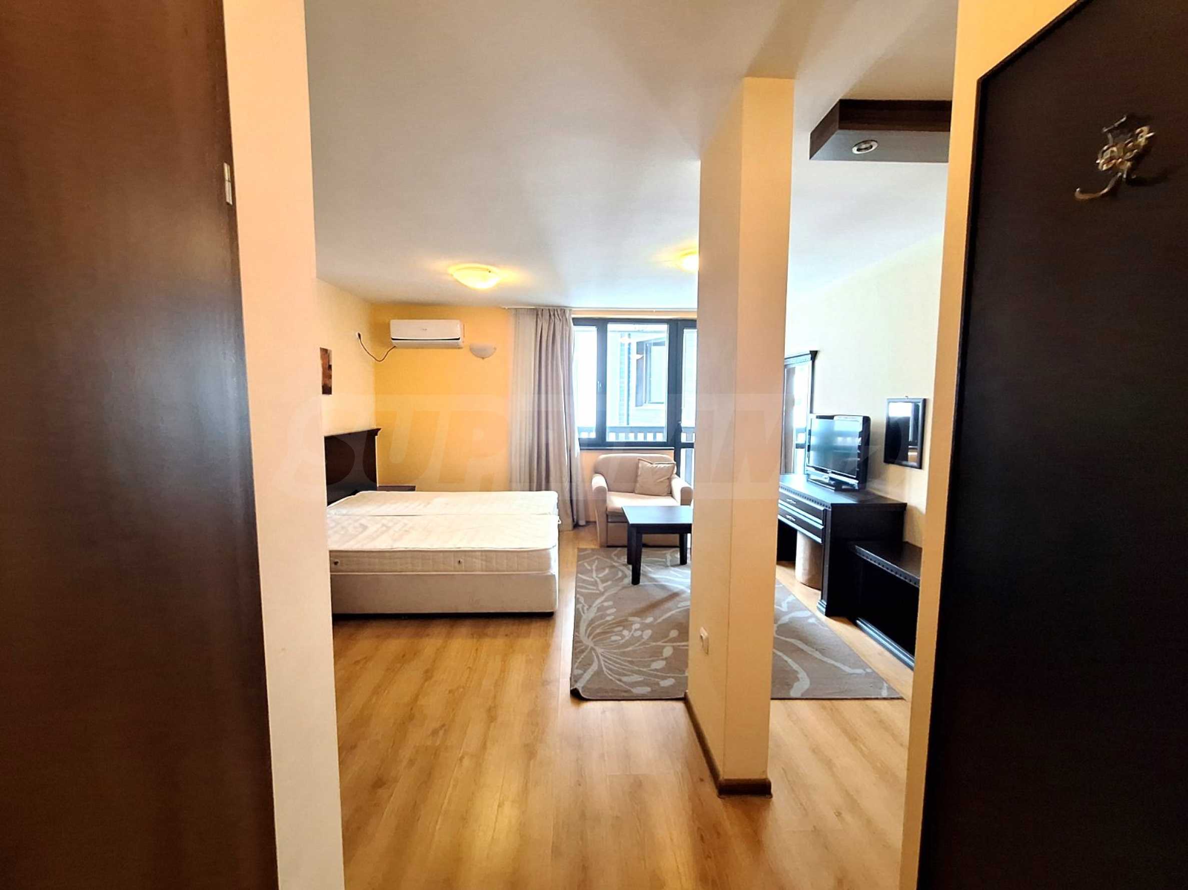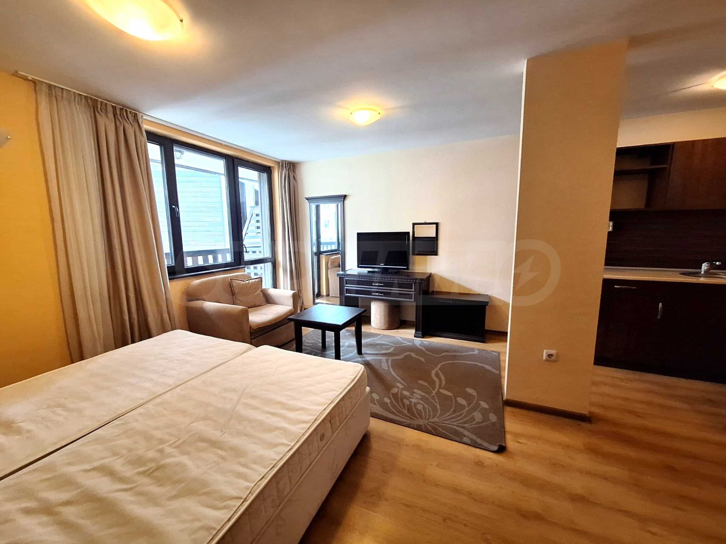 Студиото разполага с входно антре, което води към просторно основно помещение с обособен кухненски бокс. В него са разположени голяма спалня, гардероб и телевизор, създаващи комфортна жилищна зона. Към студиото има и балкон, подходящ за отдих. Банята е оборудвана с душ кабина и тоалетна.