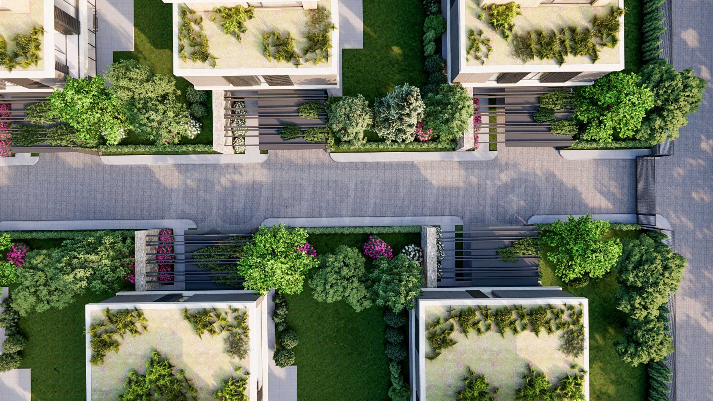 Към всяка къща са предвидени по 2 паркоместа с декоративна метална пергола.
