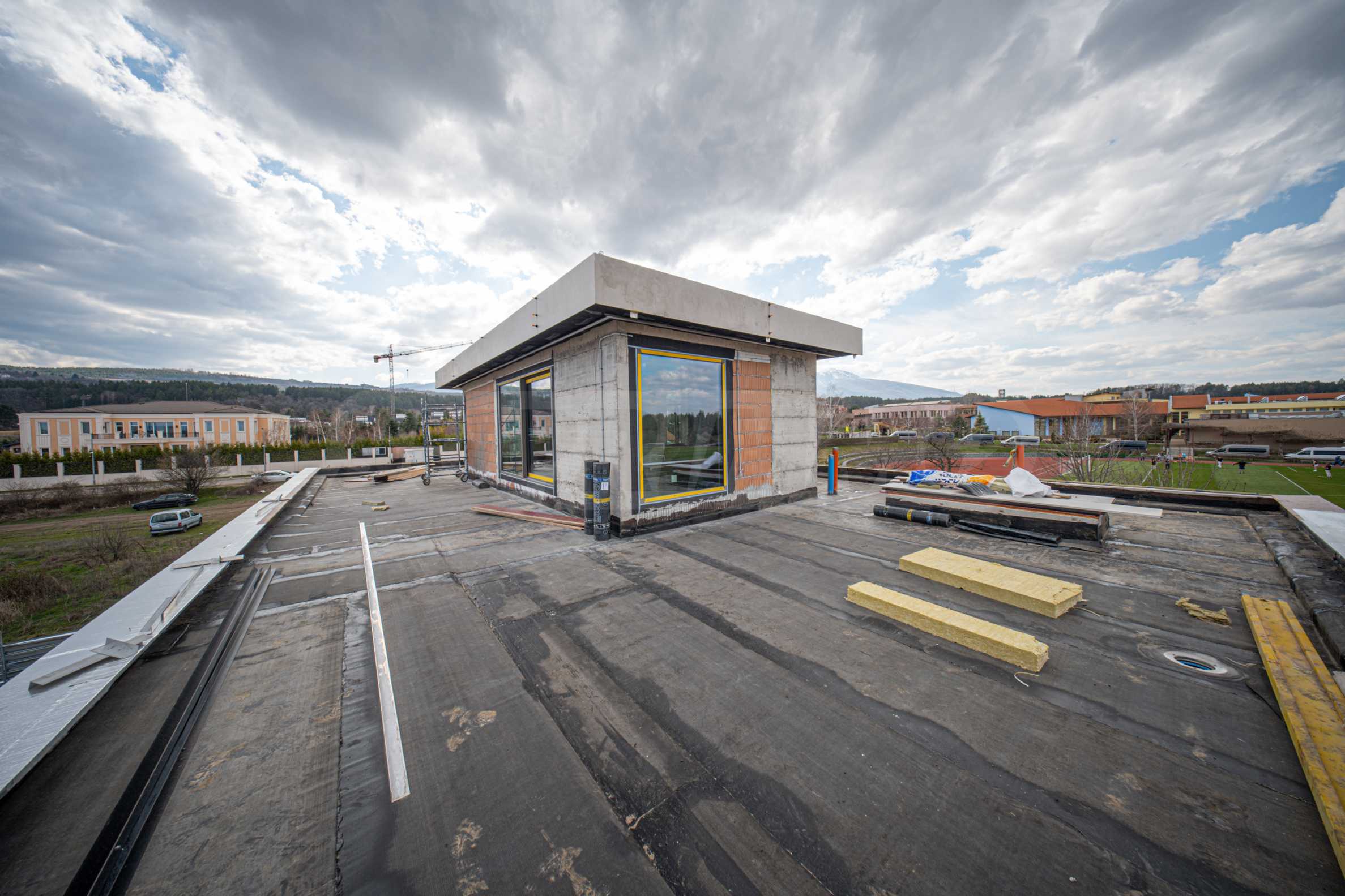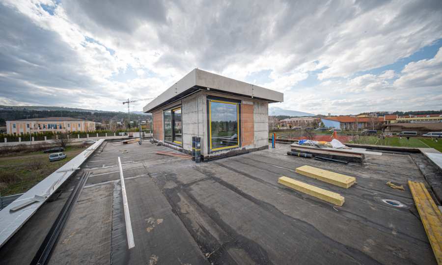 • плосък покрив с обърната конструкция, двоен слой хидроизолация и озеленяване;