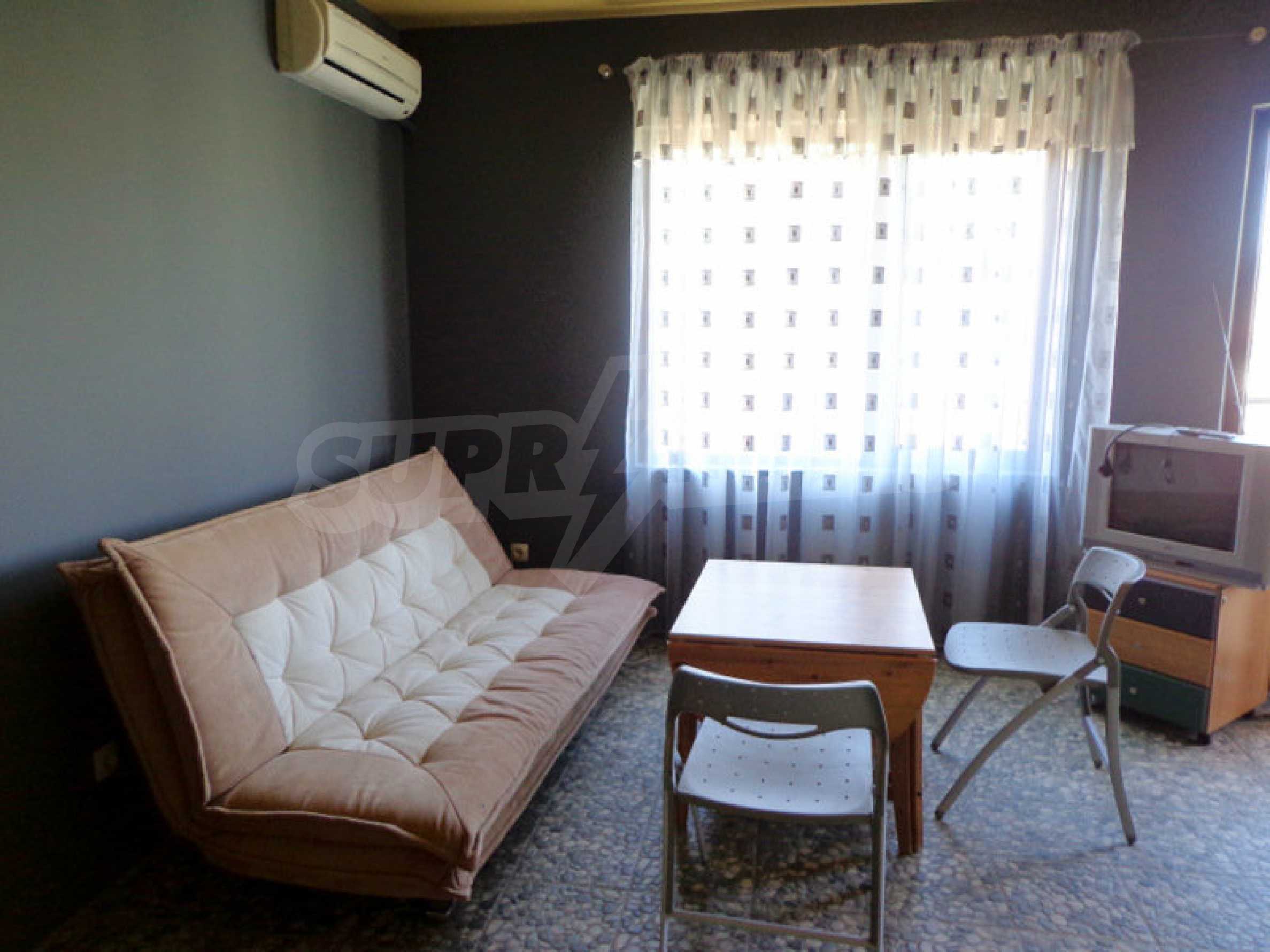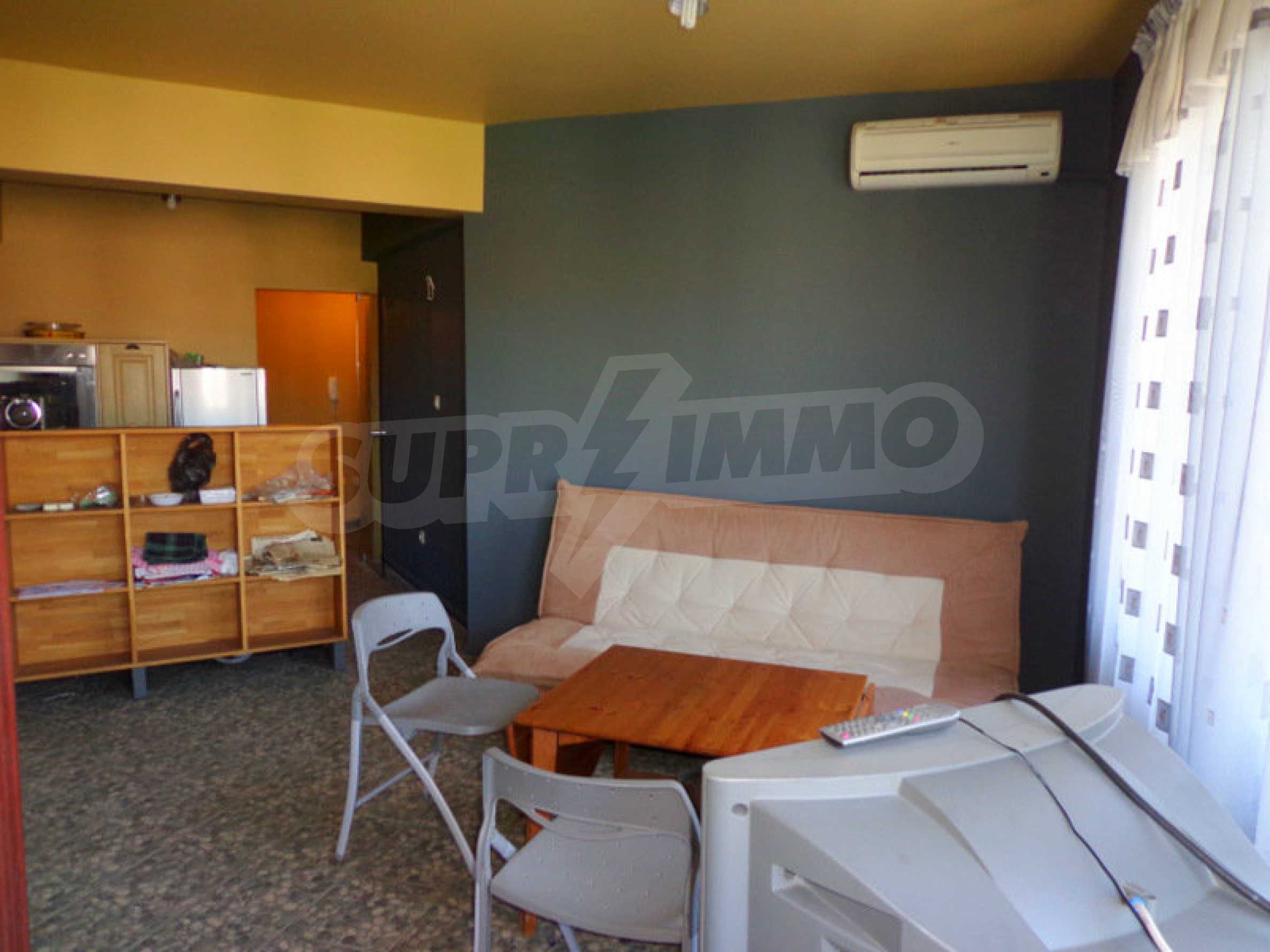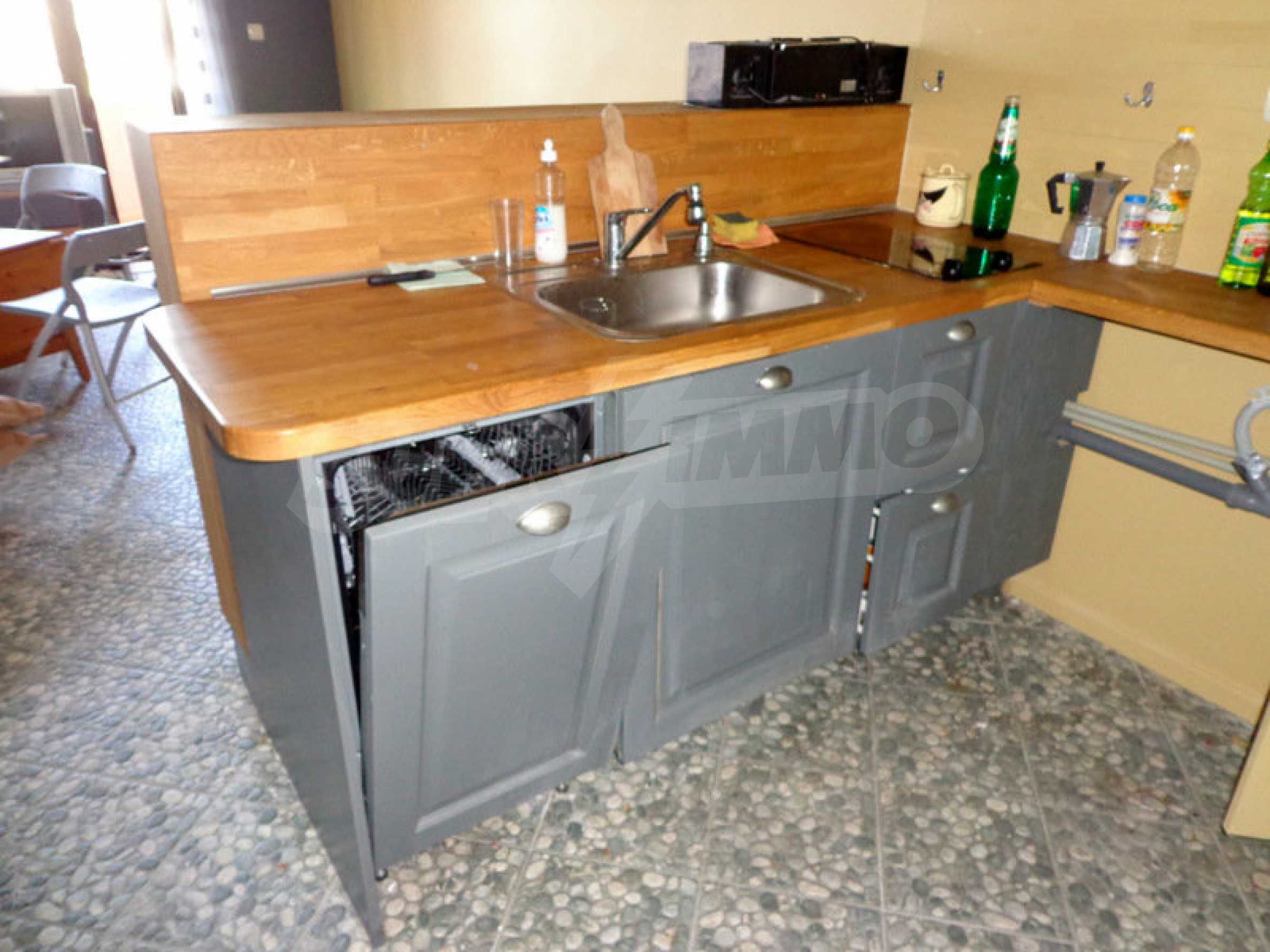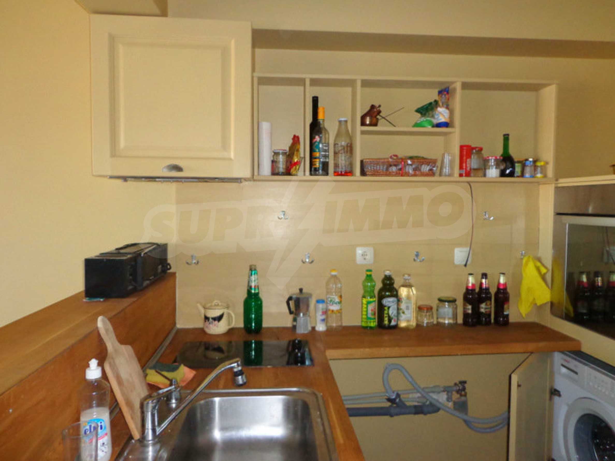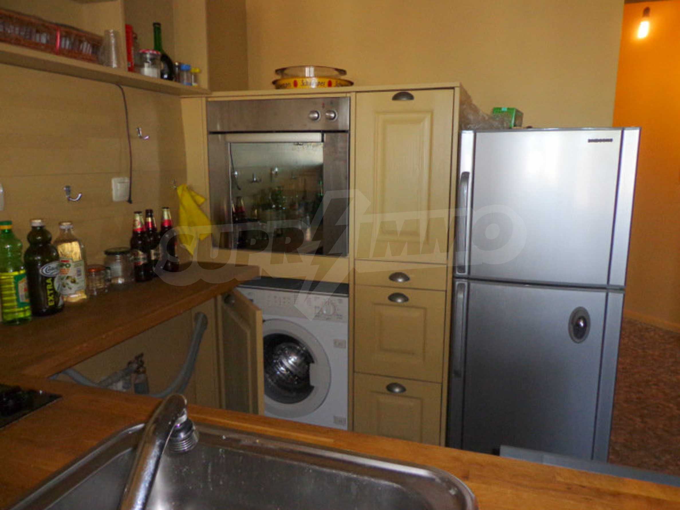 • Дневна с кухненски кът: кухненски шкафове от дървен масив, вградени керамични котлони, абсорбатор и фурна, съдомиялна машина, пералня, хладилник, разтегателен диван, масичка, 2 стола, климатик, ТВ шкаф и телевизор;