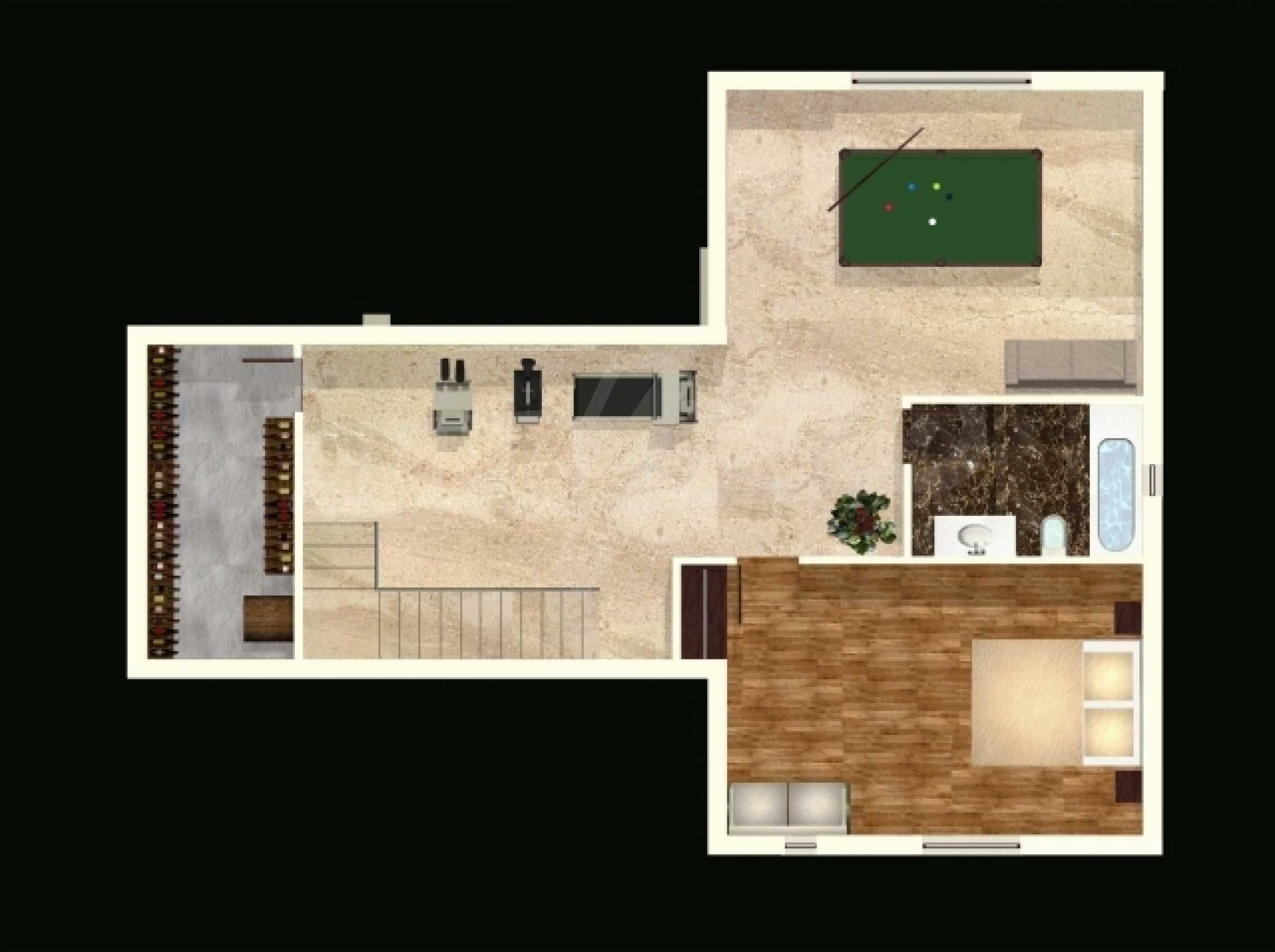 • първо ниво - 57 кв.м., състоящо се от спалня, баня, стая за игри, камина