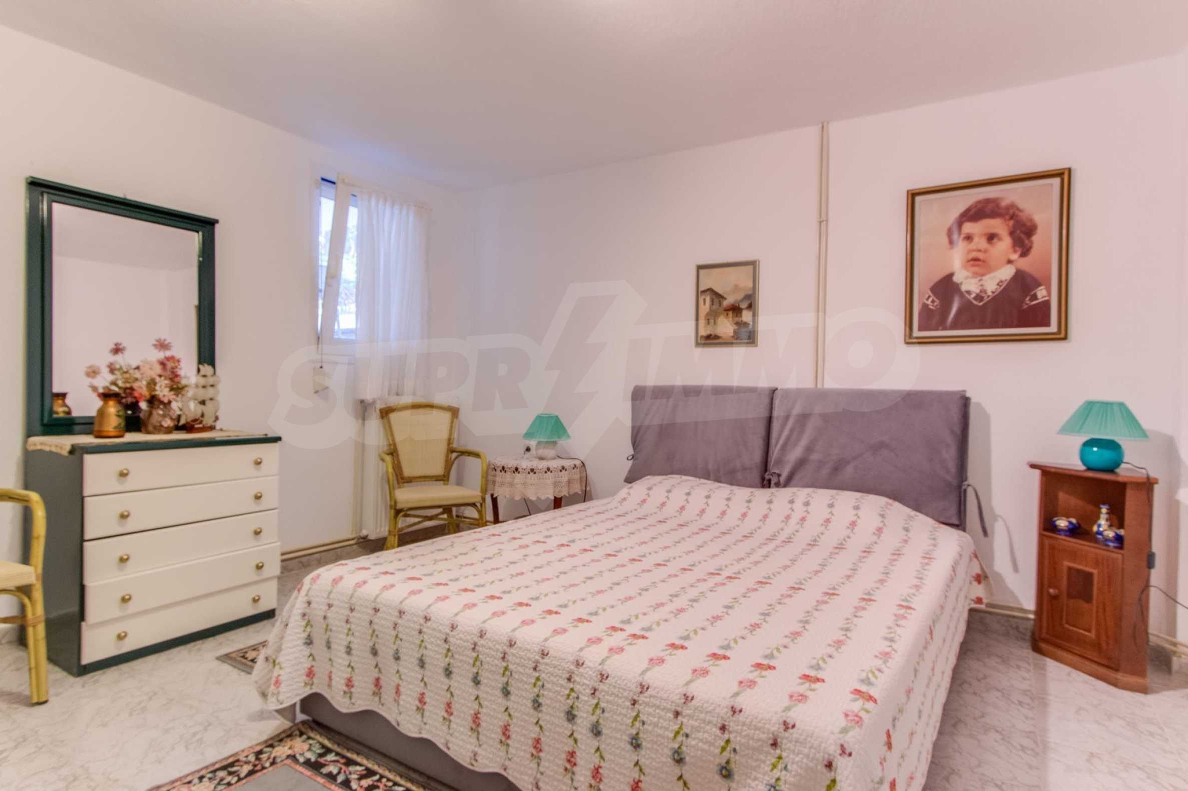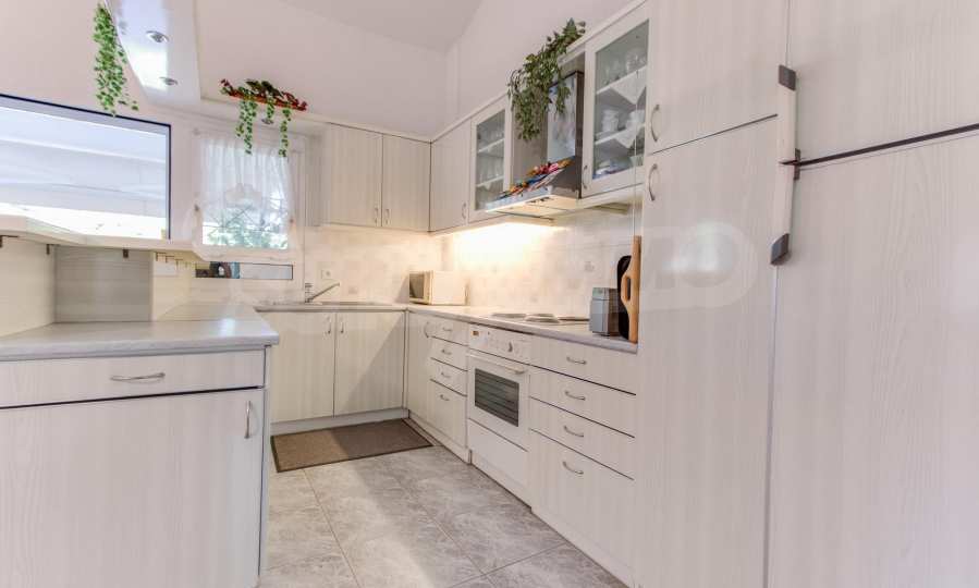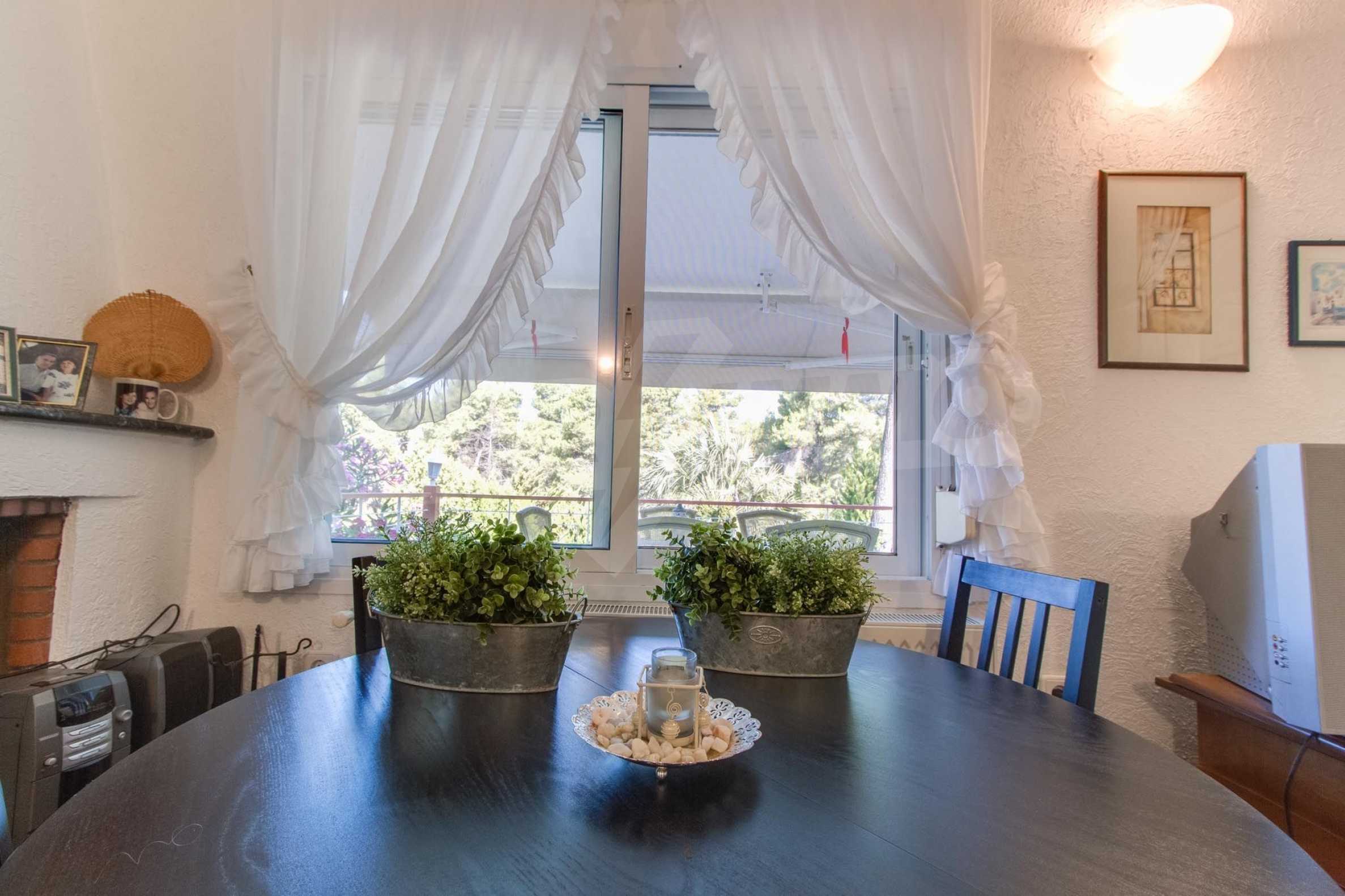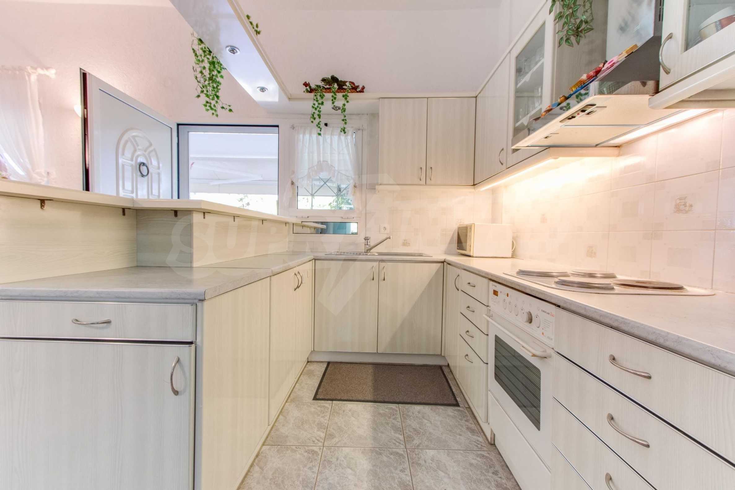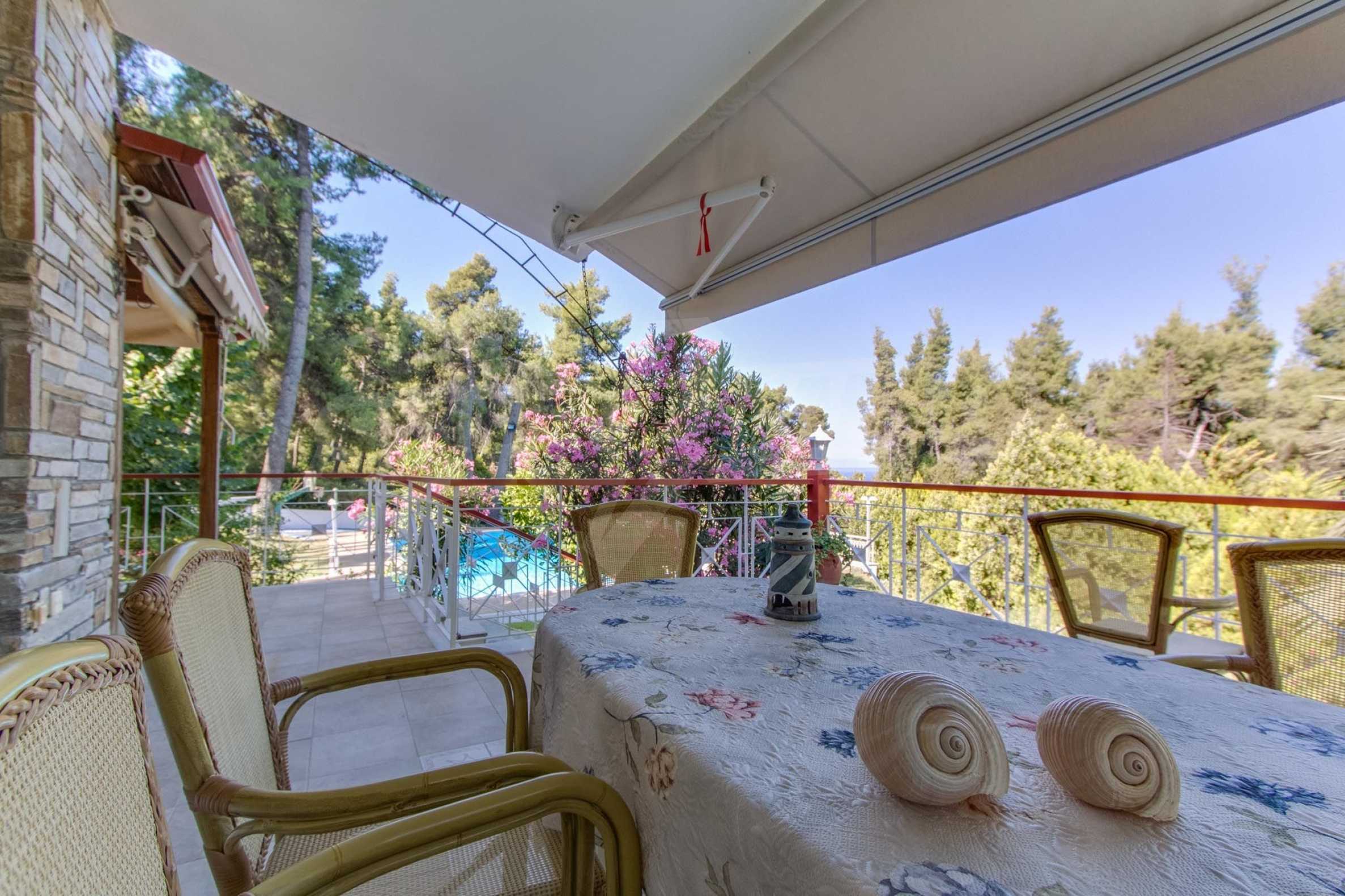 Предлагаме на вашето внимание къща с площ 120 кв.м. Година на строителство: 1993. Отоплението се осъществява посредством камина и локално парно. Има климатизация. Имотът се предлага със следната степен на завършеност: алуминиева дограма. Имотът е снабден с септична яма. Важно е да се отбележи, че имотът разполага с: балкон, баня с тоалетна, килер, мазе, паркинг и басейн. От имота се разкрива гледка към морето.