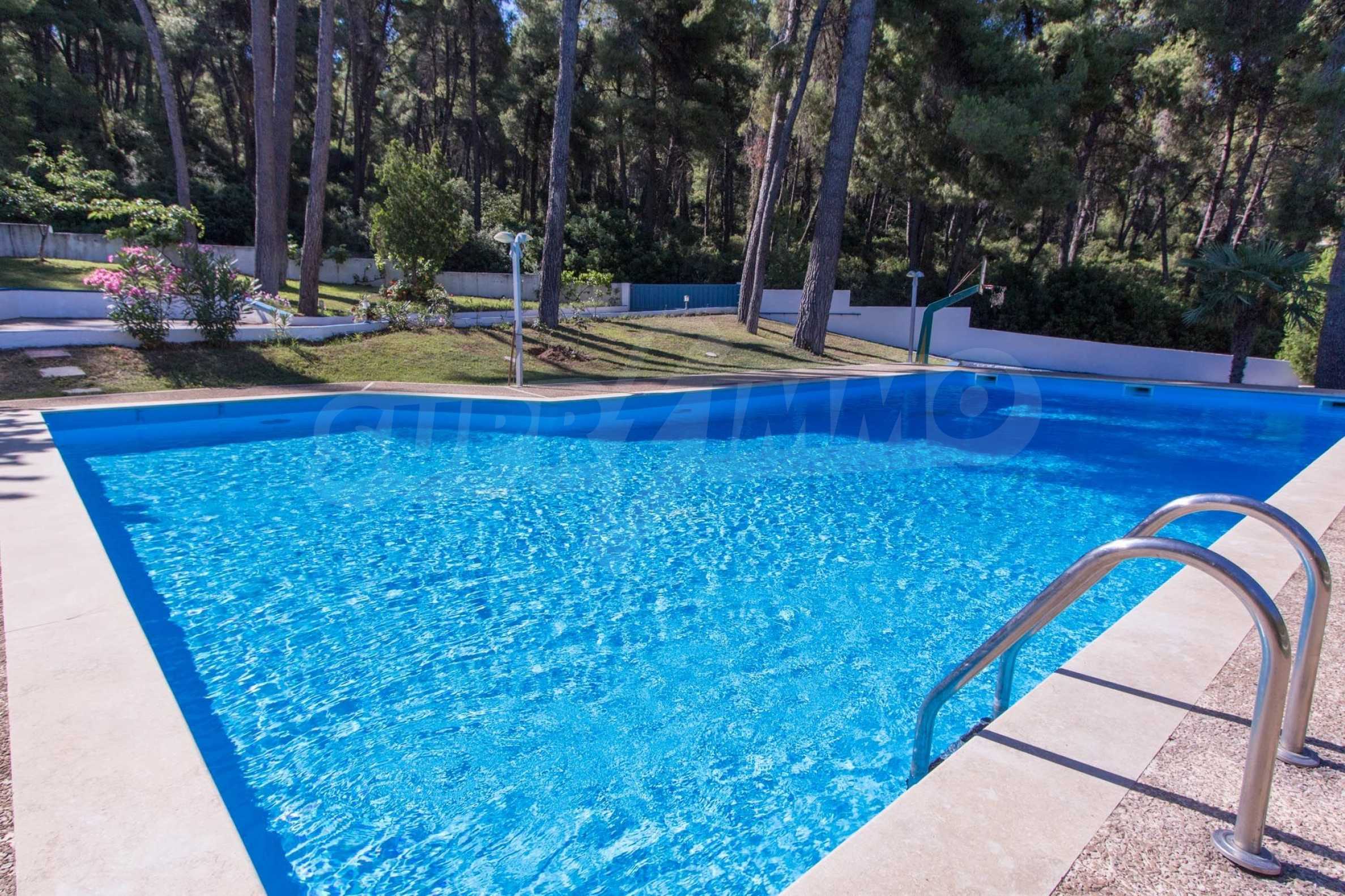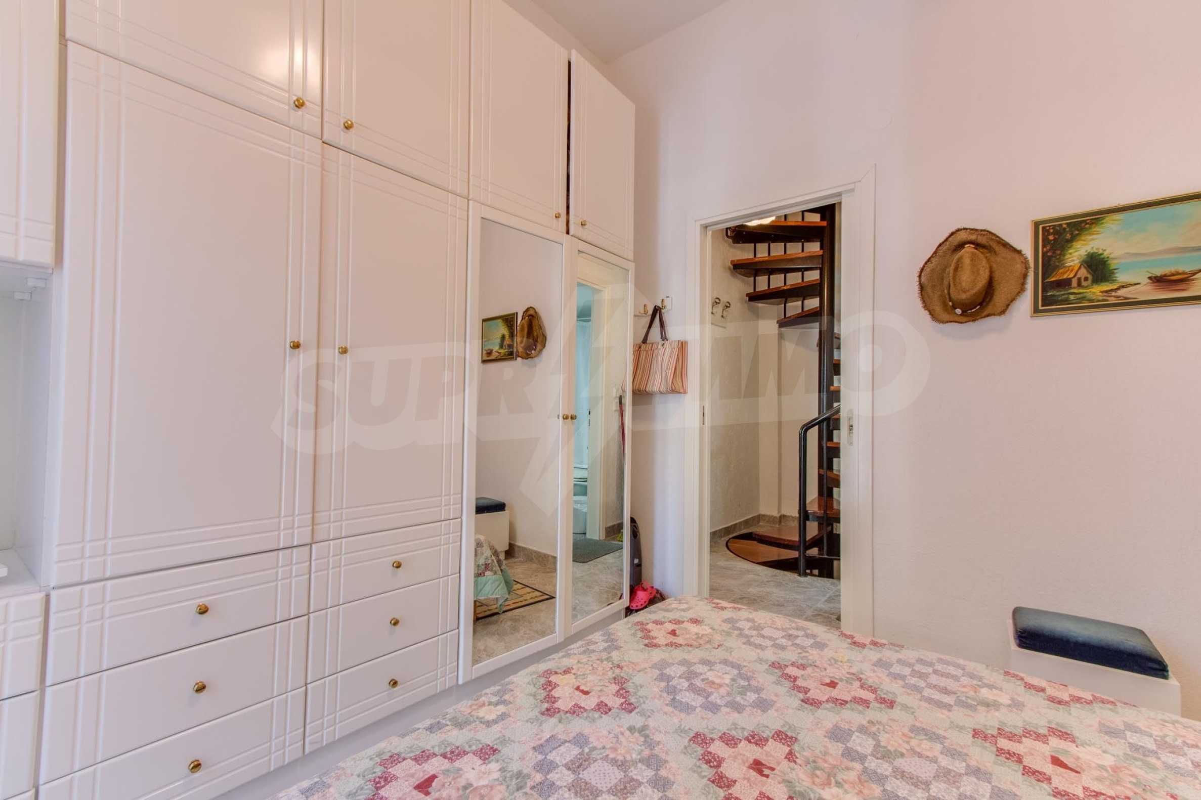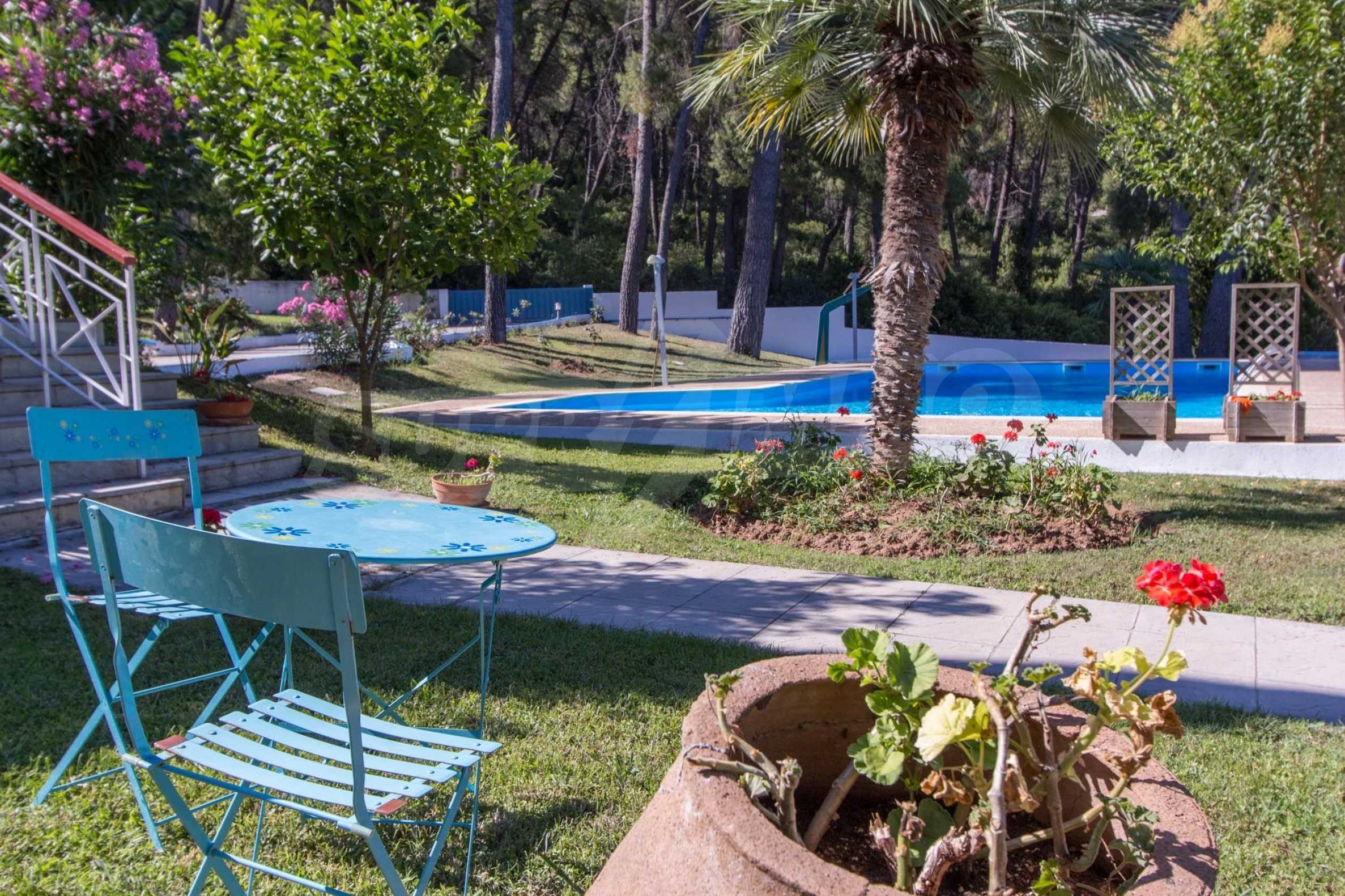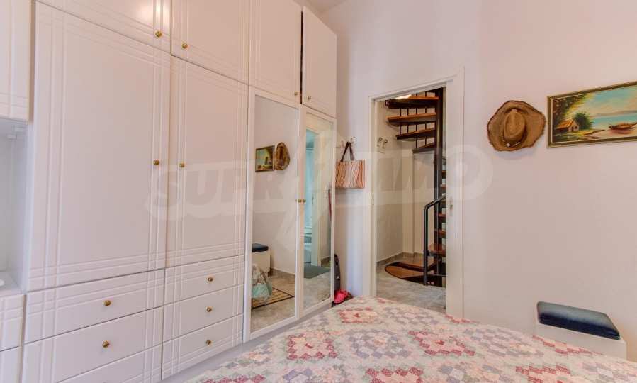 Предлагаме на вашето внимание къща с площ 120 кв.м. Година на строителство: 1993. Отоплението се осъществява посредством камина и локално парно. Има климатизация. Имотът се предлага със следната степен на завършеност: алуминиева дограма. Имотът е снабден с септична яма. Важно е да се отбележи, че имотът разполага с: балкон, баня с тоалетна, килер, мазе, паркинг и басейн. От имота се разкрива гледка към морето.