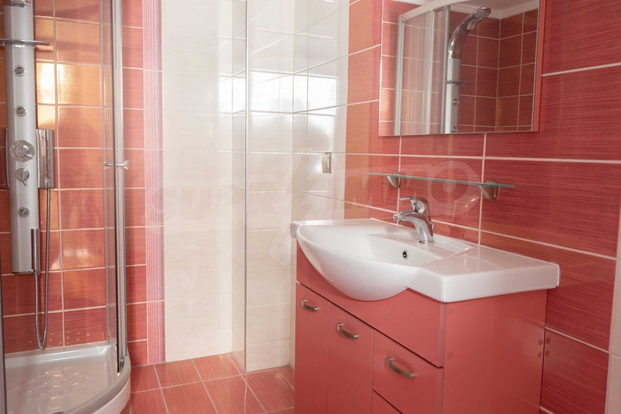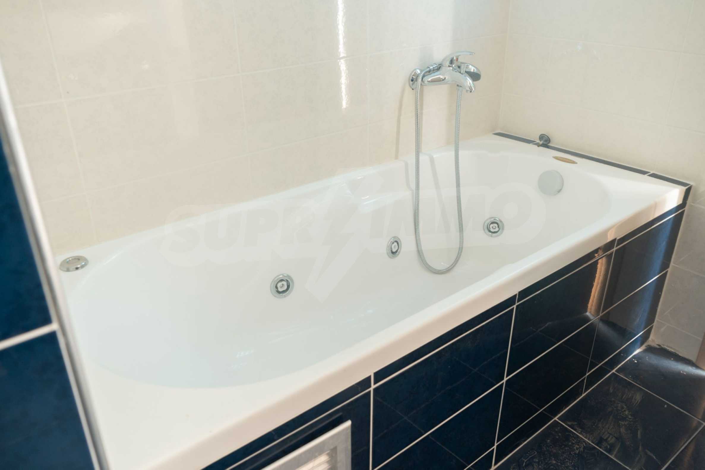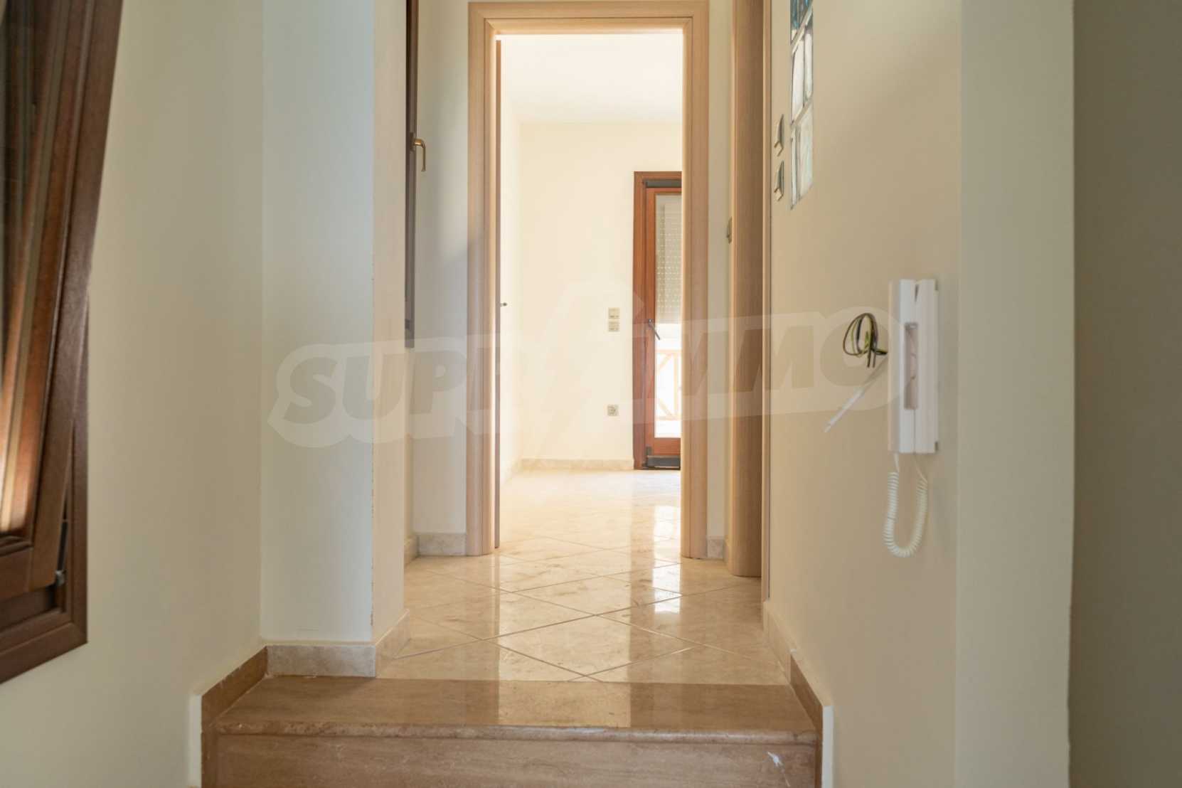 Състои се от три спални, хол, кухня и две бани. Подовете са с гранитни плочки, дограмите са дървени. Луксозното жилище предлага и други модерни удобства – воден масаж, джакузи, камина и просторни веранди. В допълнение имотът е ограден от 120 кв.м. градина, добре поддържана с автоматично напояване. Разполага с едно паркомясто.