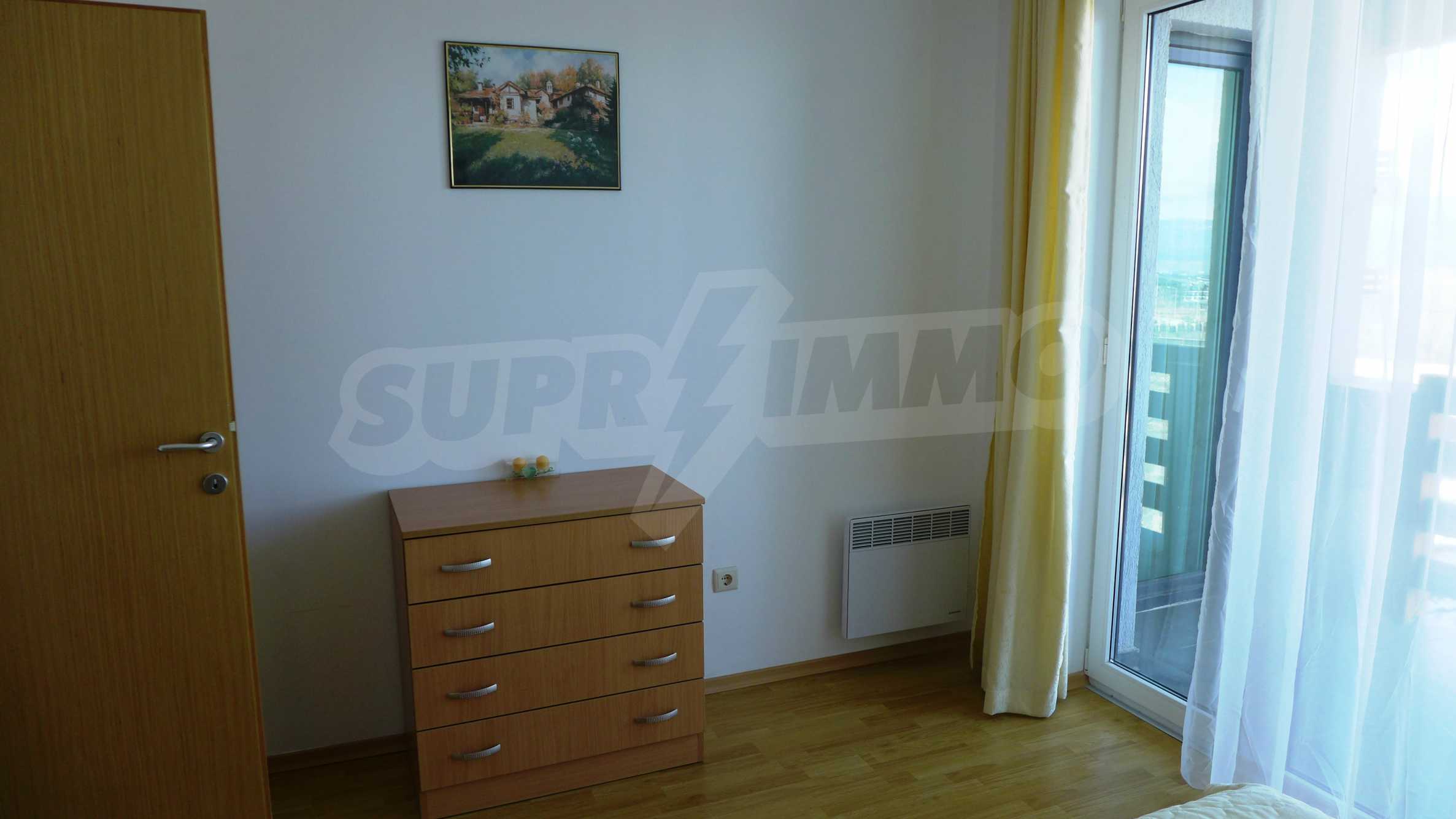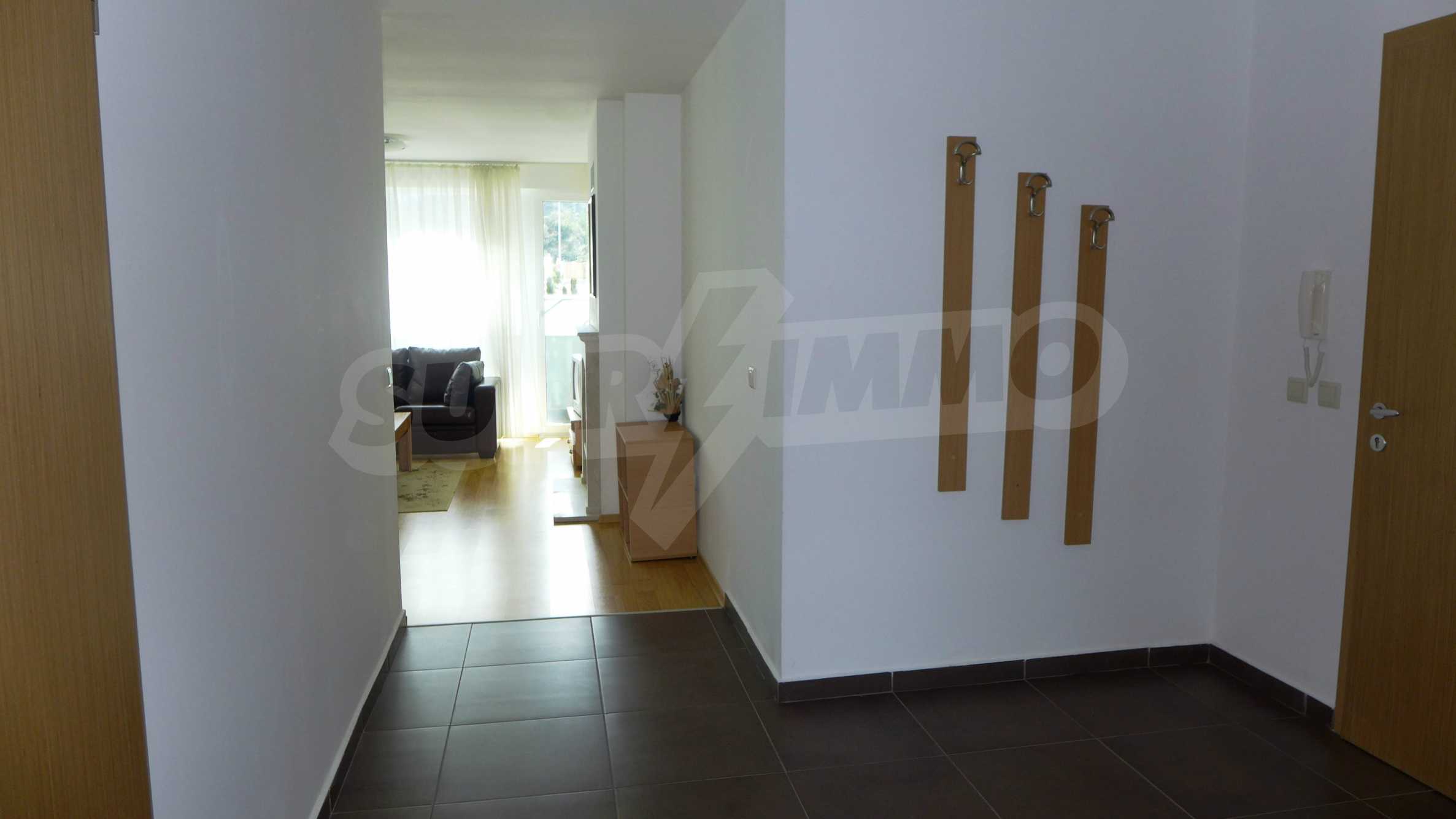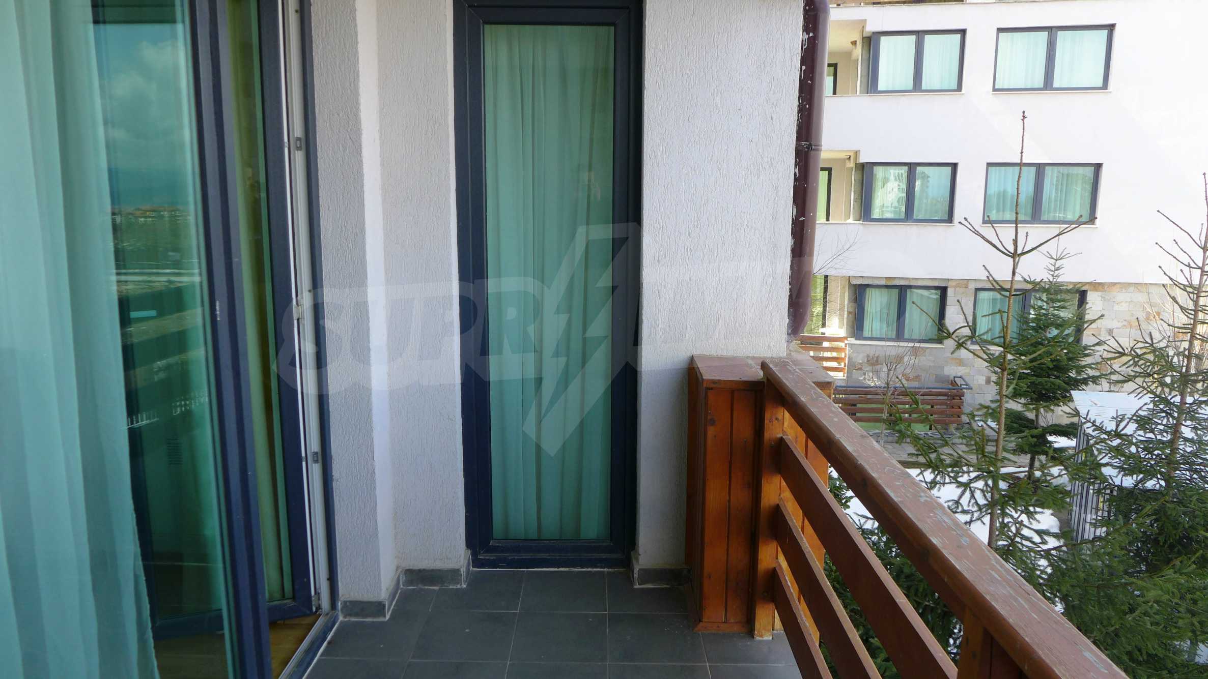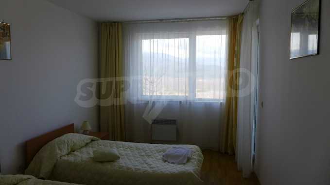 Големият южен апартамент (обща площ от 100.10 кв.м., чиста площ – 87.29 кв.м.) с 2 спални, 2 бани с тоалетна, 2 панорамни балкона и хол с кухненски бокс се предлага напълно обзаведен и оборудван. Крайната цена включва модерна кухня с фурна, двоен котлон, абсорбатор, хладилник, мивка, електрическа кана, тостер; дневна с троен разтегателен диван, двоен разтегателен диван, масичка за кафе, телевизор, DVD плейър, маса за хранене и 6 стола, камина; спалня 1 с двойно легло, 2 нощни шкафчета, двоен гардероб, скрин; спалня 2 - 2 единични легла, 2 нощни шкафчета, скрин; коридор - закачалка и домофон; баня с тоалетна 1 - с вана, мивка, огледало, бойлер; баня с тоалетна 2 – мивка и огледало. Двата балкона разкриват живописна гледка към планини и гори. Апартаментът се продава завършен със стени с латекс, под - ламинат и гранитогрес в коридора и кухнята и ПВЦ дограми. Отоплението е чрез камина и електрически радиатори, разполага с телефон, кабелна телевизия, интернет.