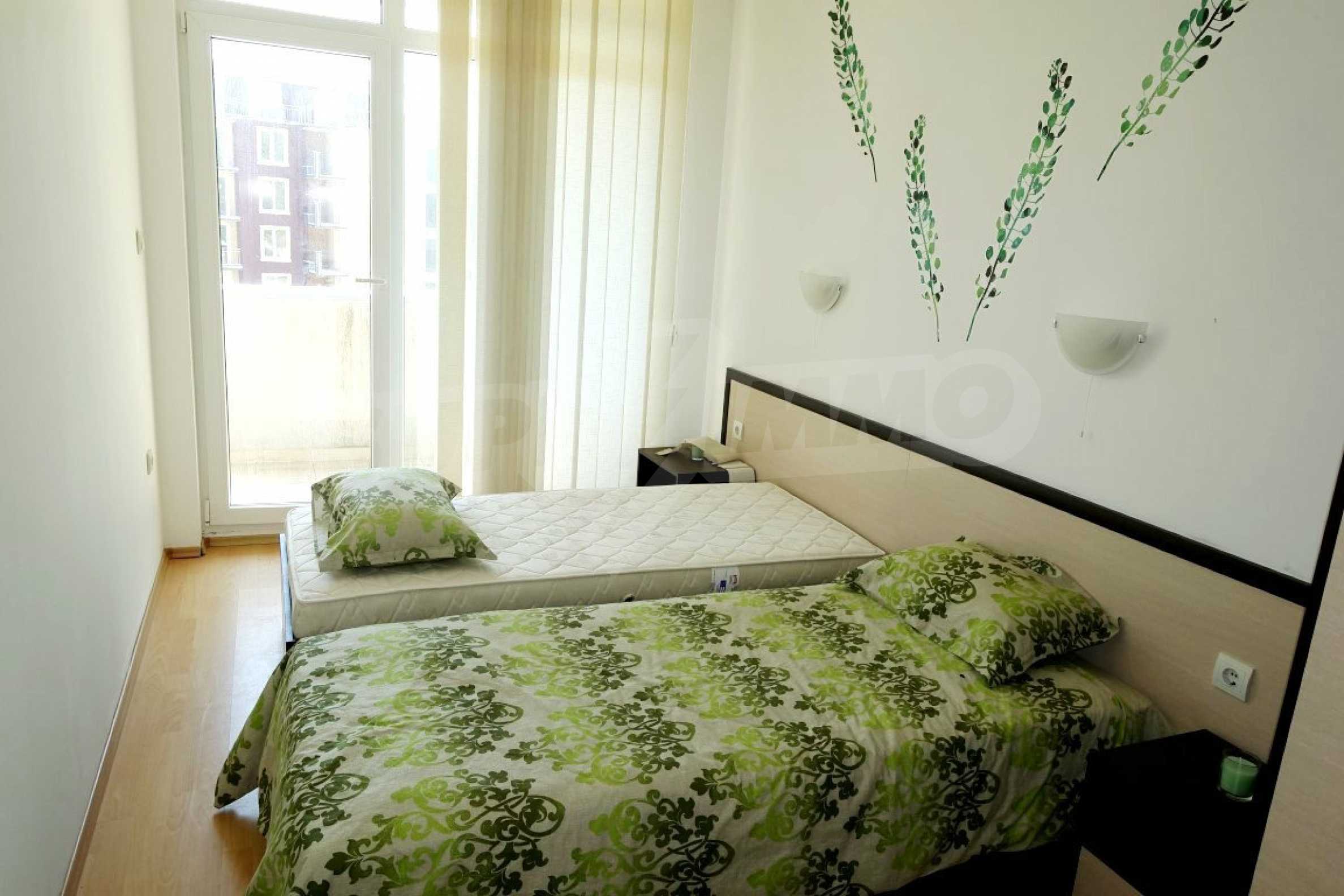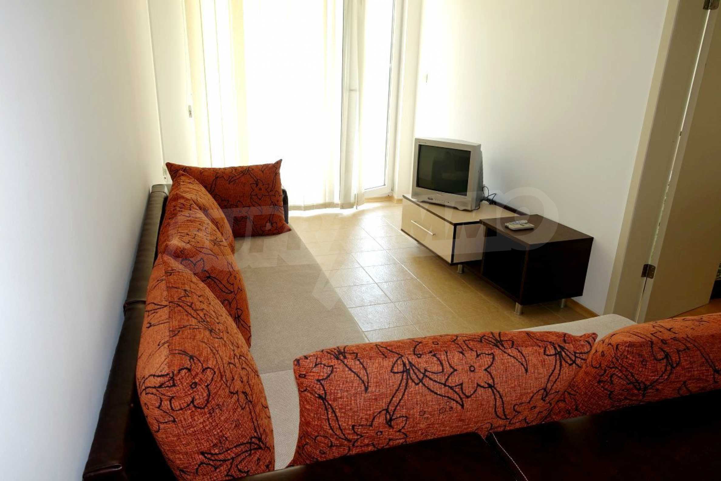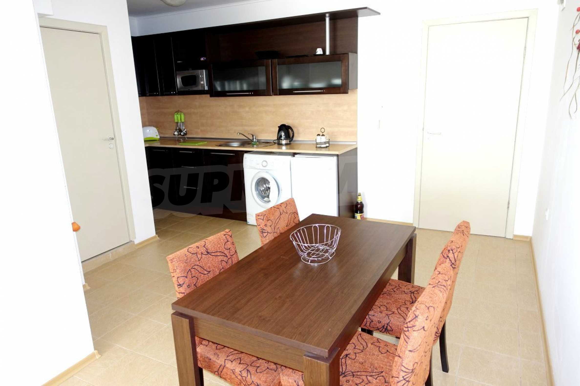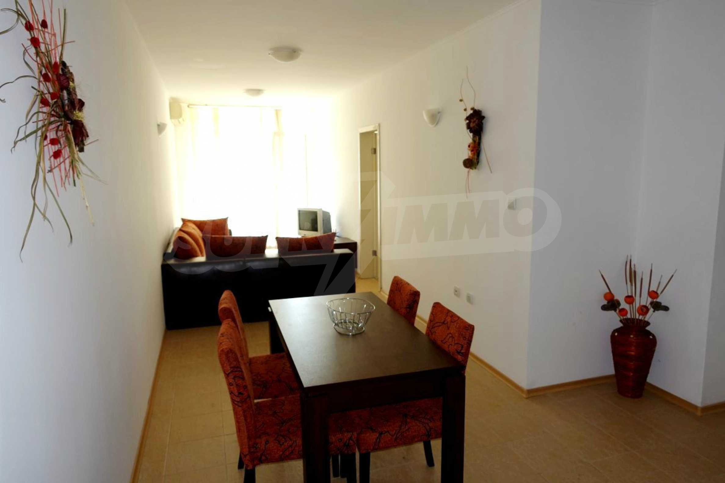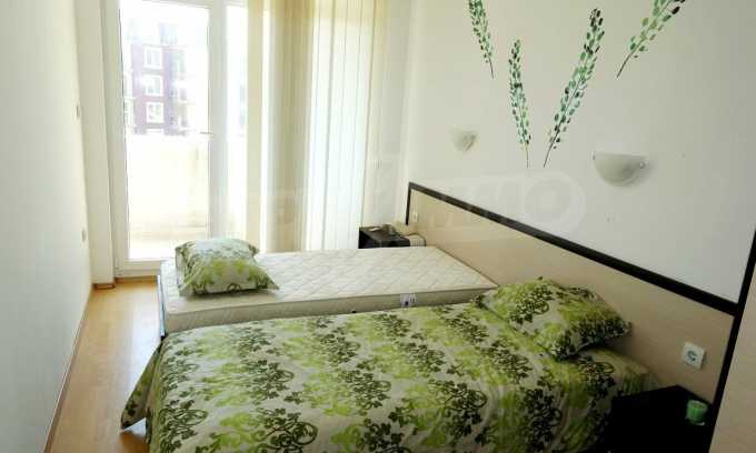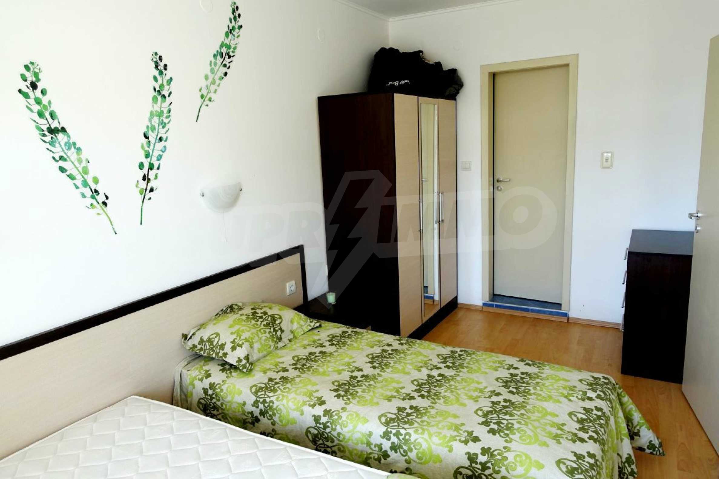 Компактен ваканционен имот с цялостно обзавеждане, слънчева тераса и оборудван кухненски бокс. Жилището е част от затворен комплекс „Прима”, намиращ се близо до златните плажове на Слънчев бряг.