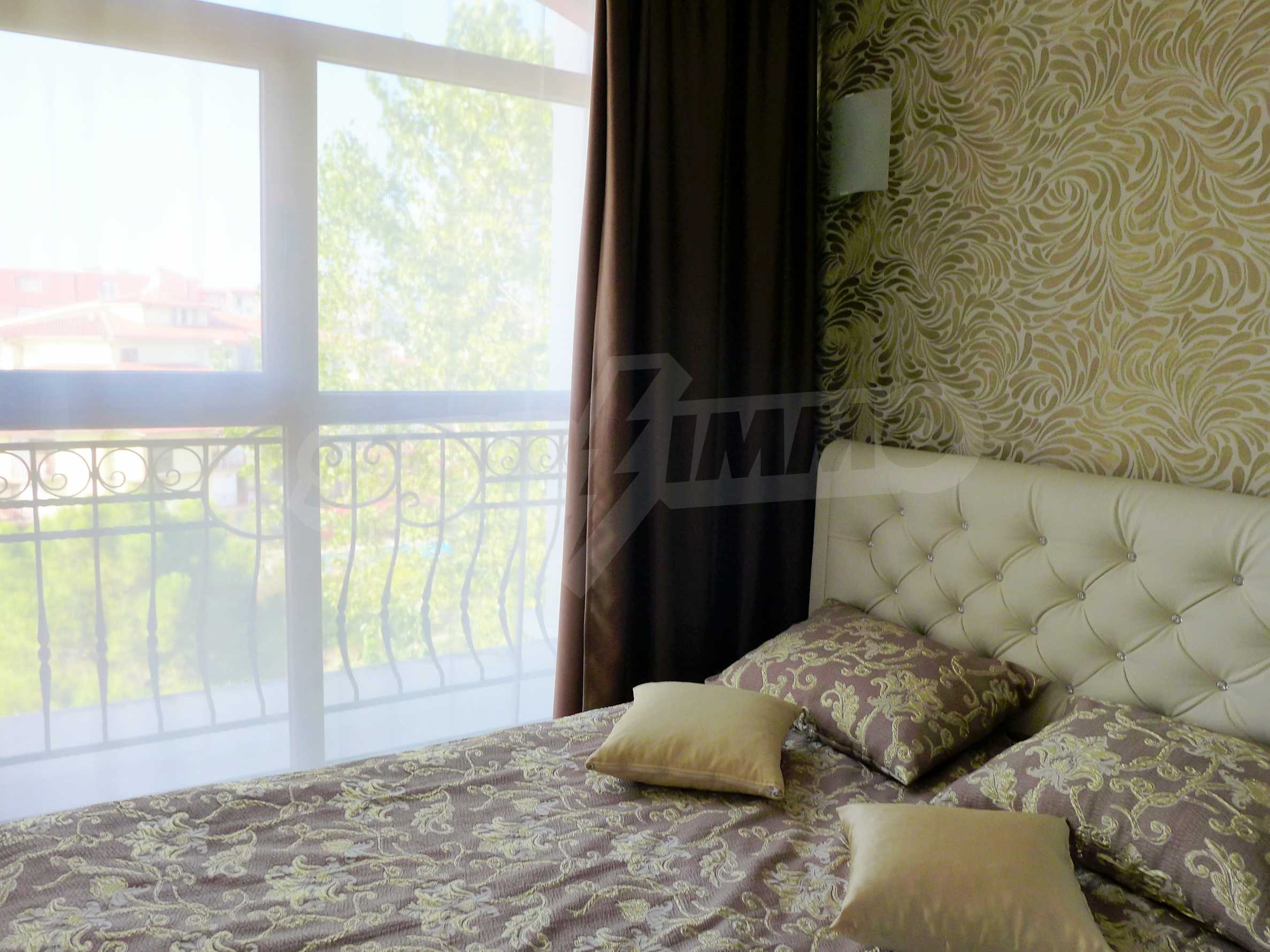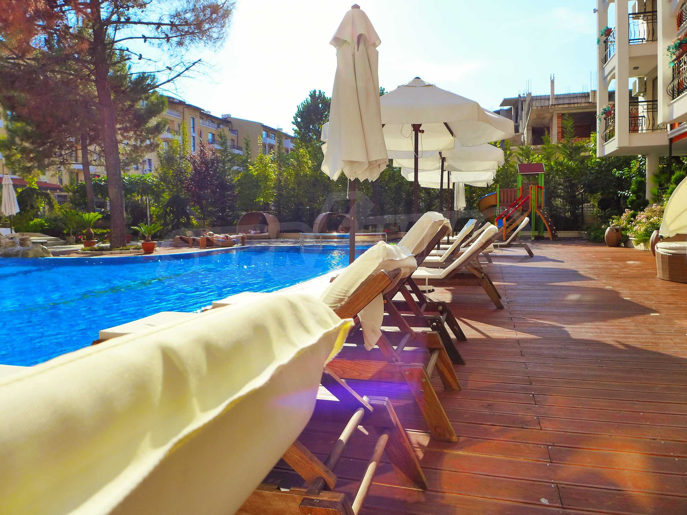 Предлаганият имот се намира на 500 м от плажа. Всичко е много чисто и добре поддържано, спокойно и тихо. Обзавеждането е правено по поръчка, почти не е използвано. Годишната такса поддръжка в комплекса за този апартамент възлиза на 430 евро.