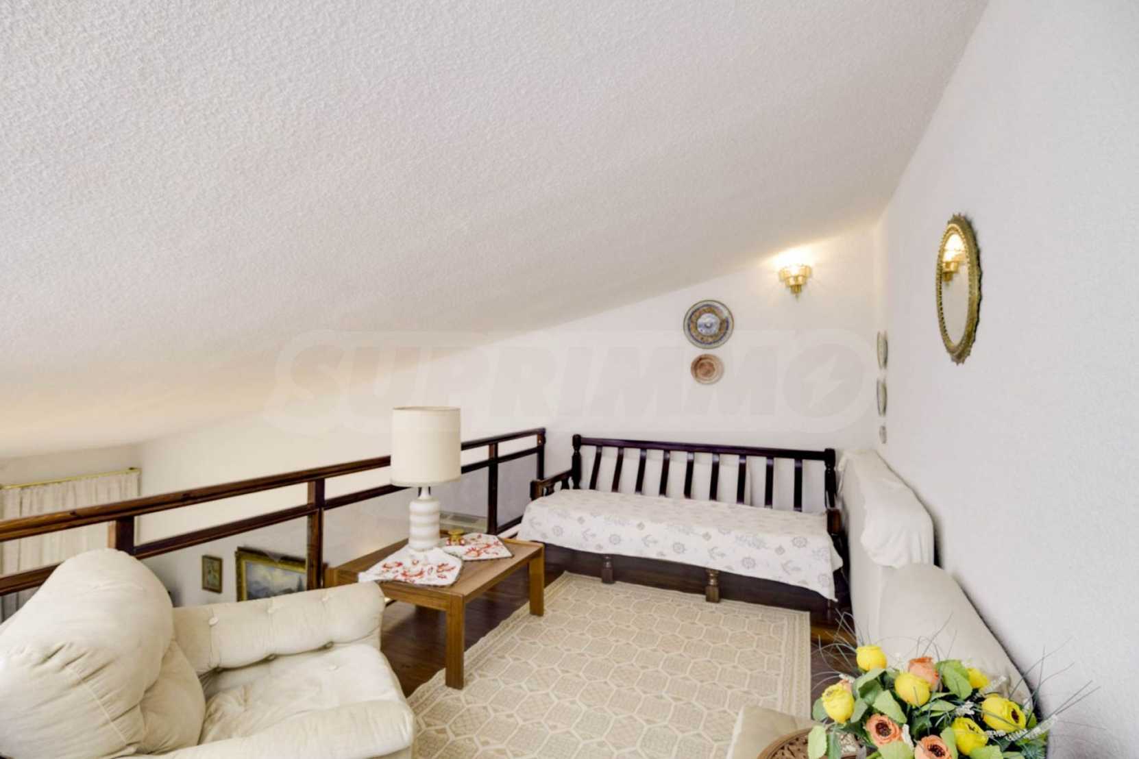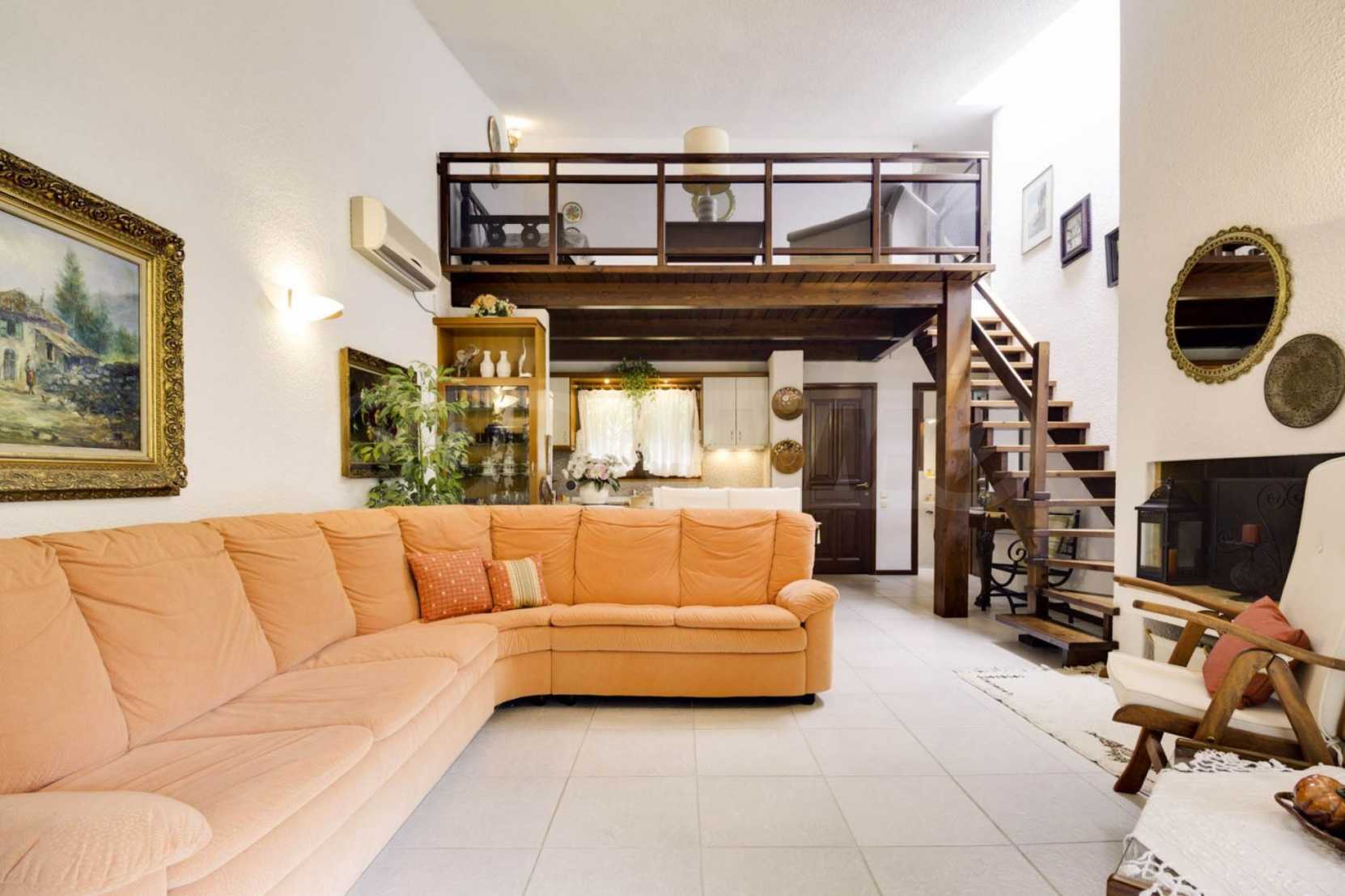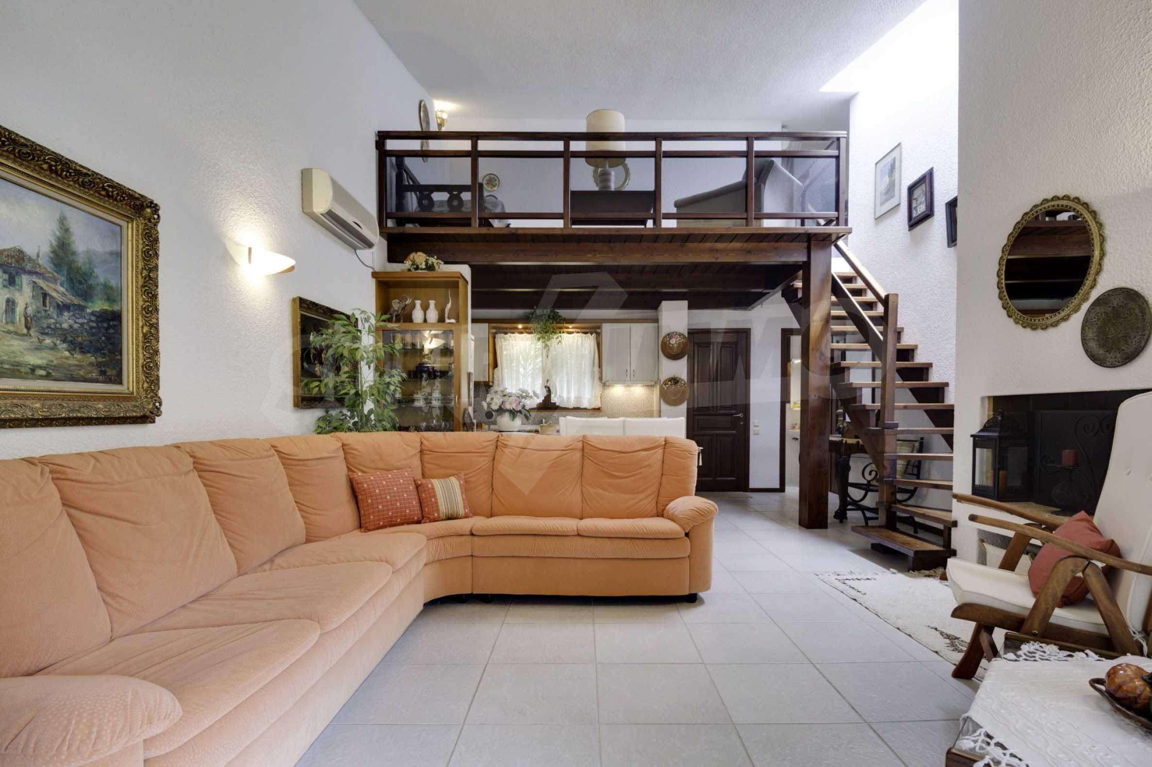 Имотът се предлага с алуминиева дограма, килер и таванско помещение. Отоплението се осъществява посредством електрически печки, камина, парно на ток и слънчеви колектори. Има климатизация.