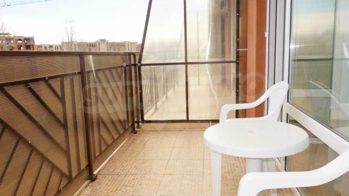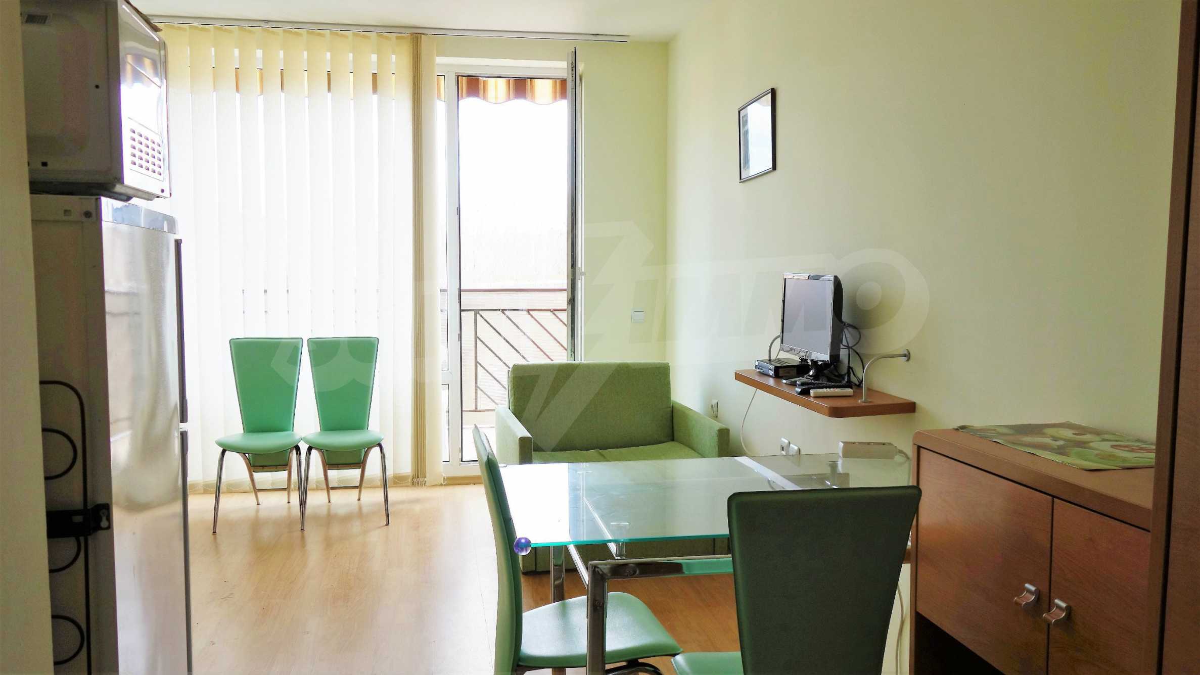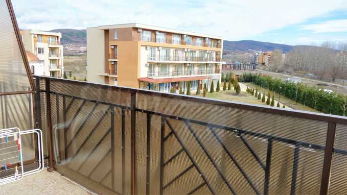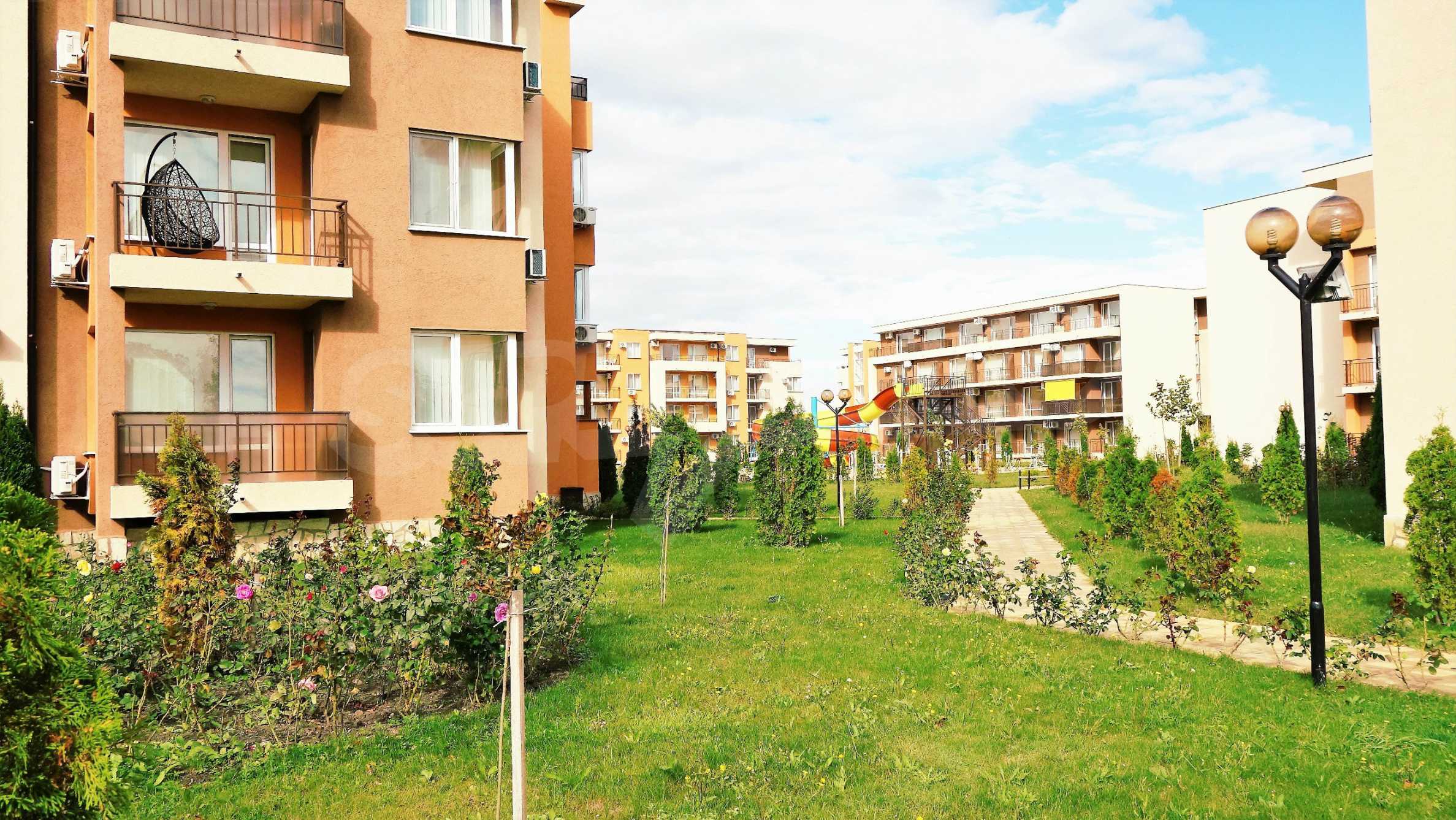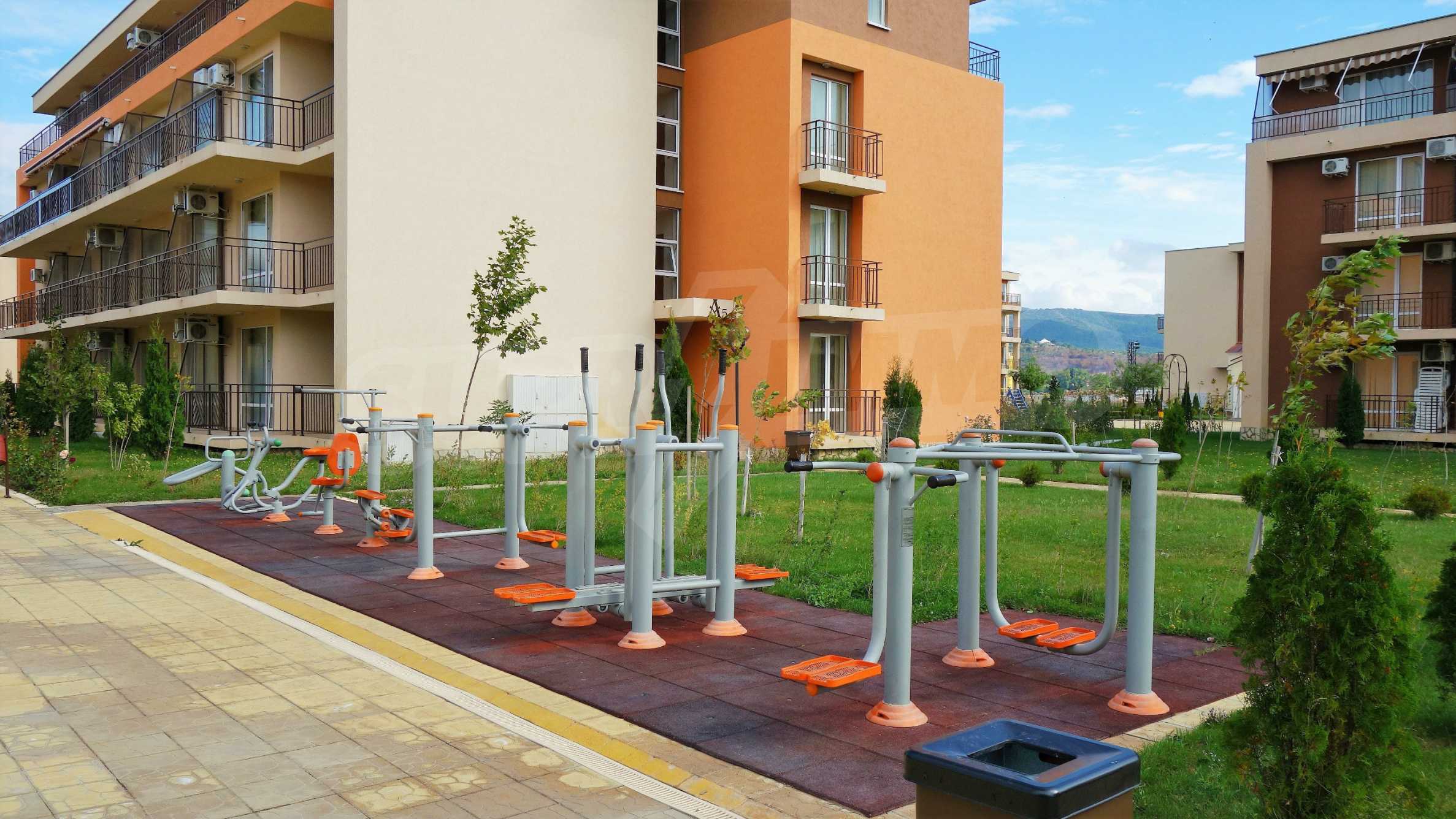 Нoвопостроеният апартамент (2013) е с площ 40.70 кв.м (чиста площ – 35.2 кв.м. и общи части – 5.46 кв.м.) и се намира на 3 етаж. Разпределението на ваканционния имот е функционално: дневна с кухненски кът, баня с тоалетна и тераса с гледка към градината и планината. Подовите настилки са с ламинат, стени – латекс, ПВЦ дограми. Имотът се продава с пълно обзавеждане и оборудване, с климатици за отопление и охлаждане. Разполага с кабелна телевизия, интернет, а в сградата има охрана и видеонаблюдение. Годишната такса поддръжка в комплекса е 10 евро на кв.м.