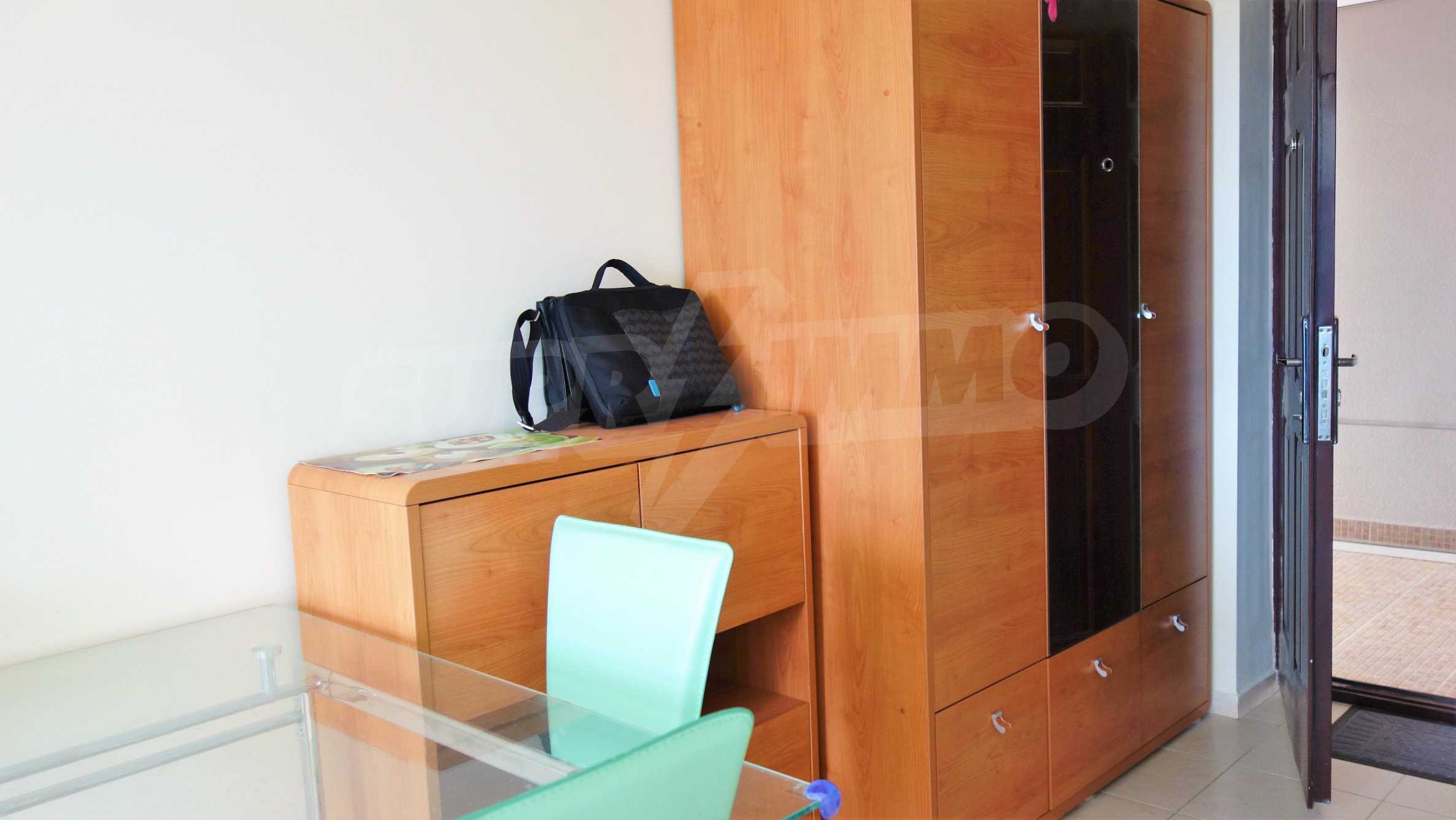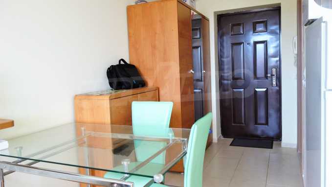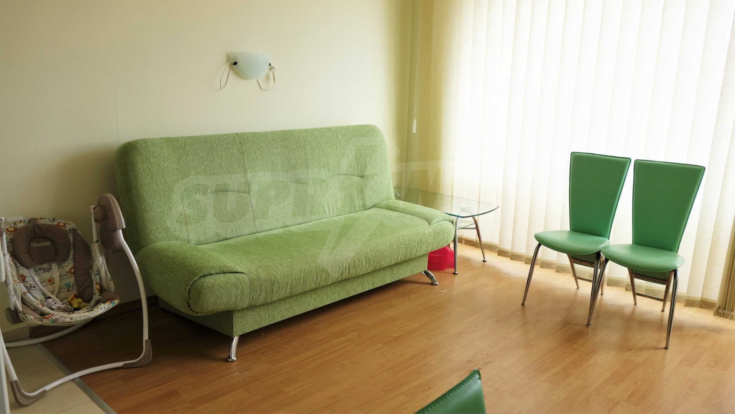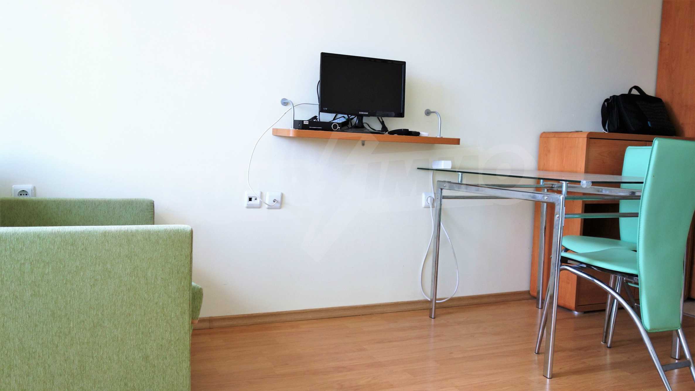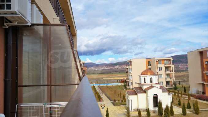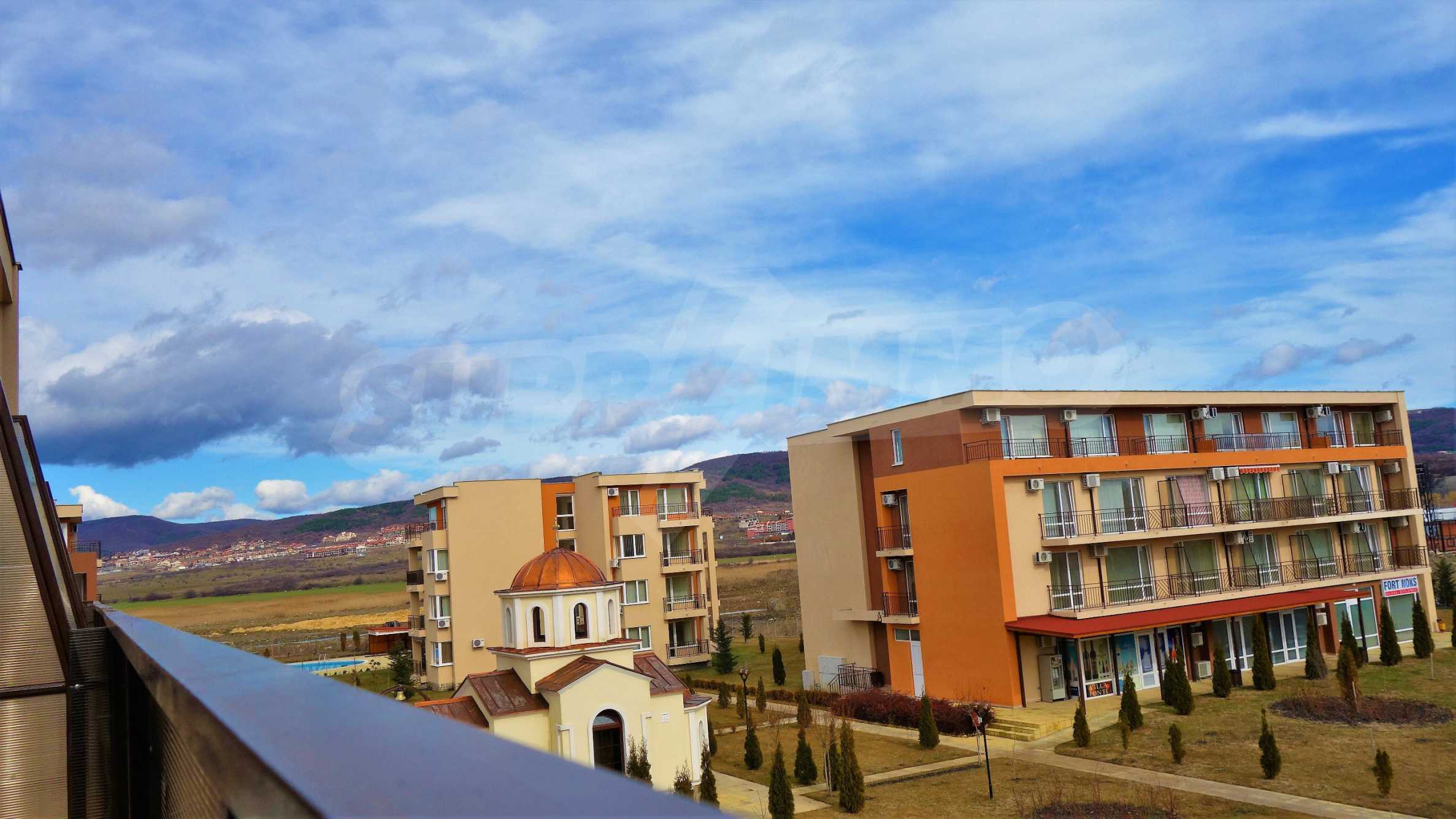 Нoвопостроеният апартамент (2013) е с площ 40.70 кв.м (чиста площ – 35.2 кв.м. и общи части – 5.46 кв.м.) и се намира на 3 етаж. Разпределението на ваканционния имот е функционално: дневна с кухненски кът, баня с тоалетна и тераса с гледка към градината и планината. Подовите настилки са с ламинат, стени – латекс, ПВЦ дограми. Имотът се продава с пълно обзавеждане и оборудване, с климатици за отопление и охлаждане. Разполага с кабелна телевизия, интернет, а в сградата има охрана и видеонаблюдение. Годишната такса поддръжка в комплекса е 10 евро на кв.м.