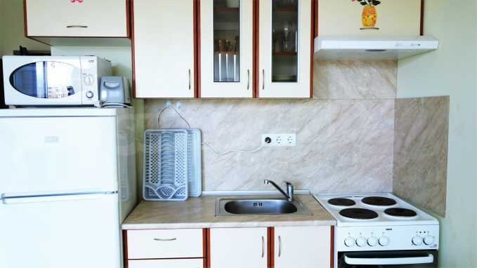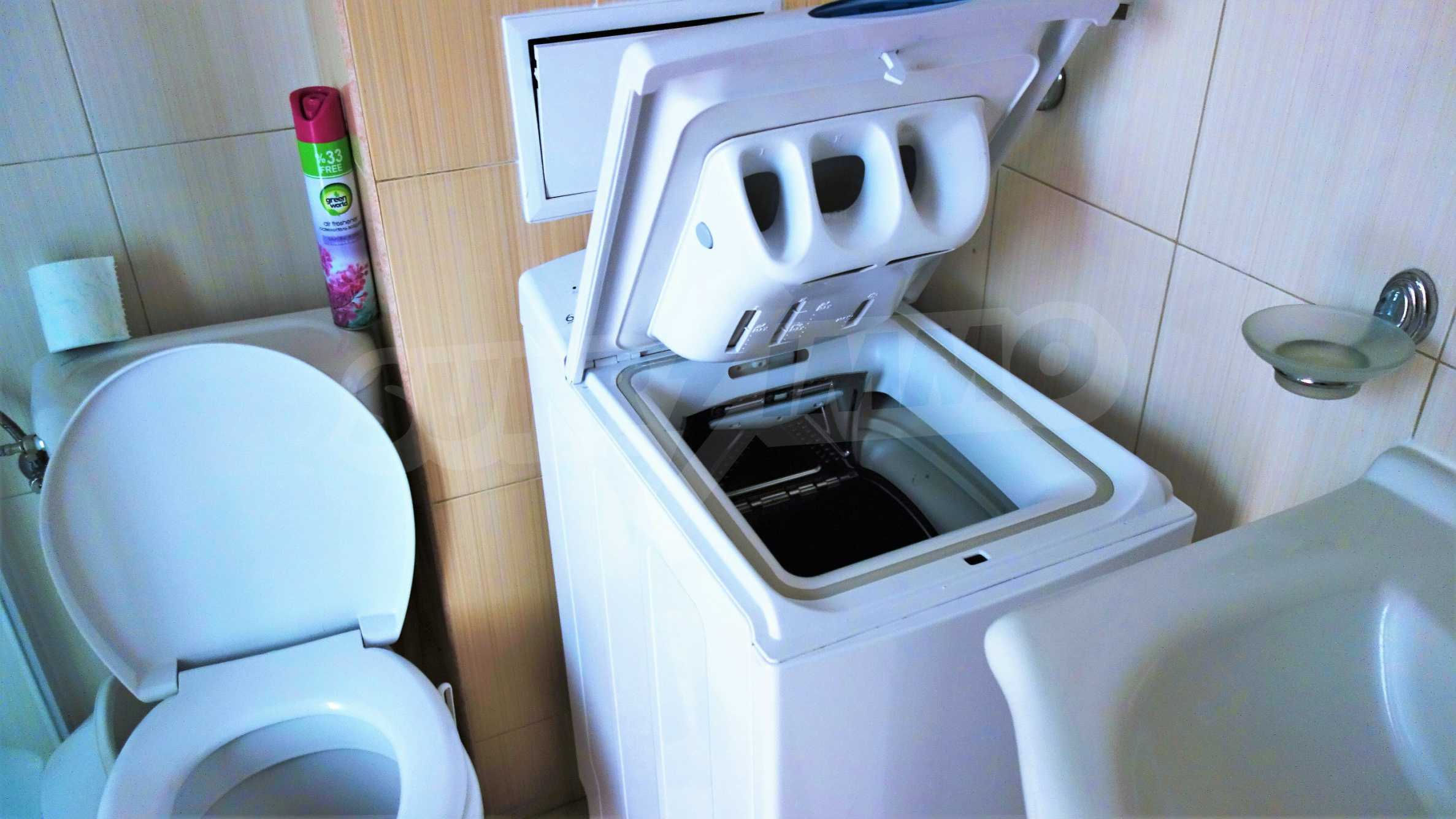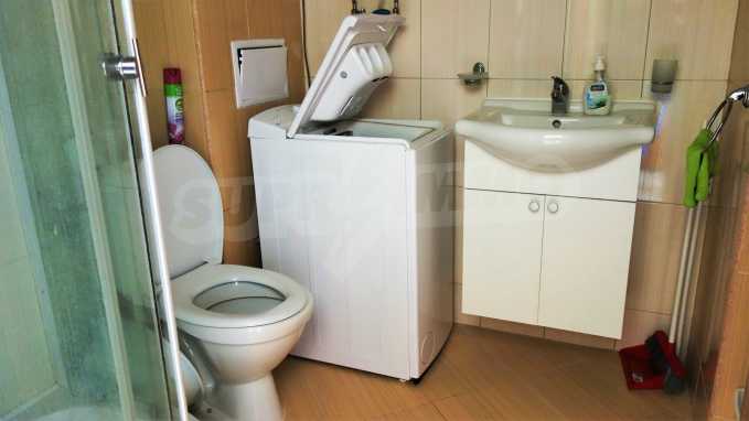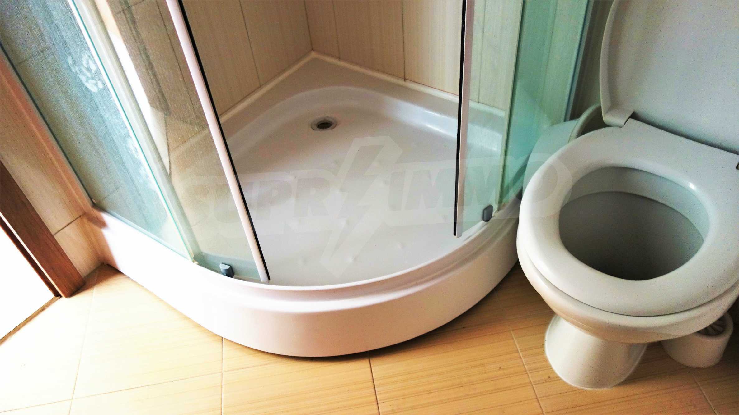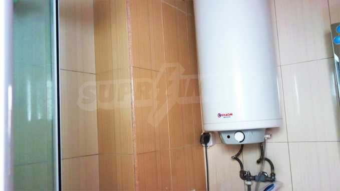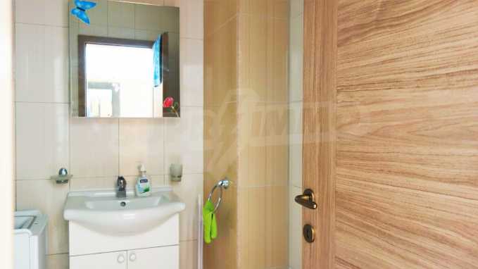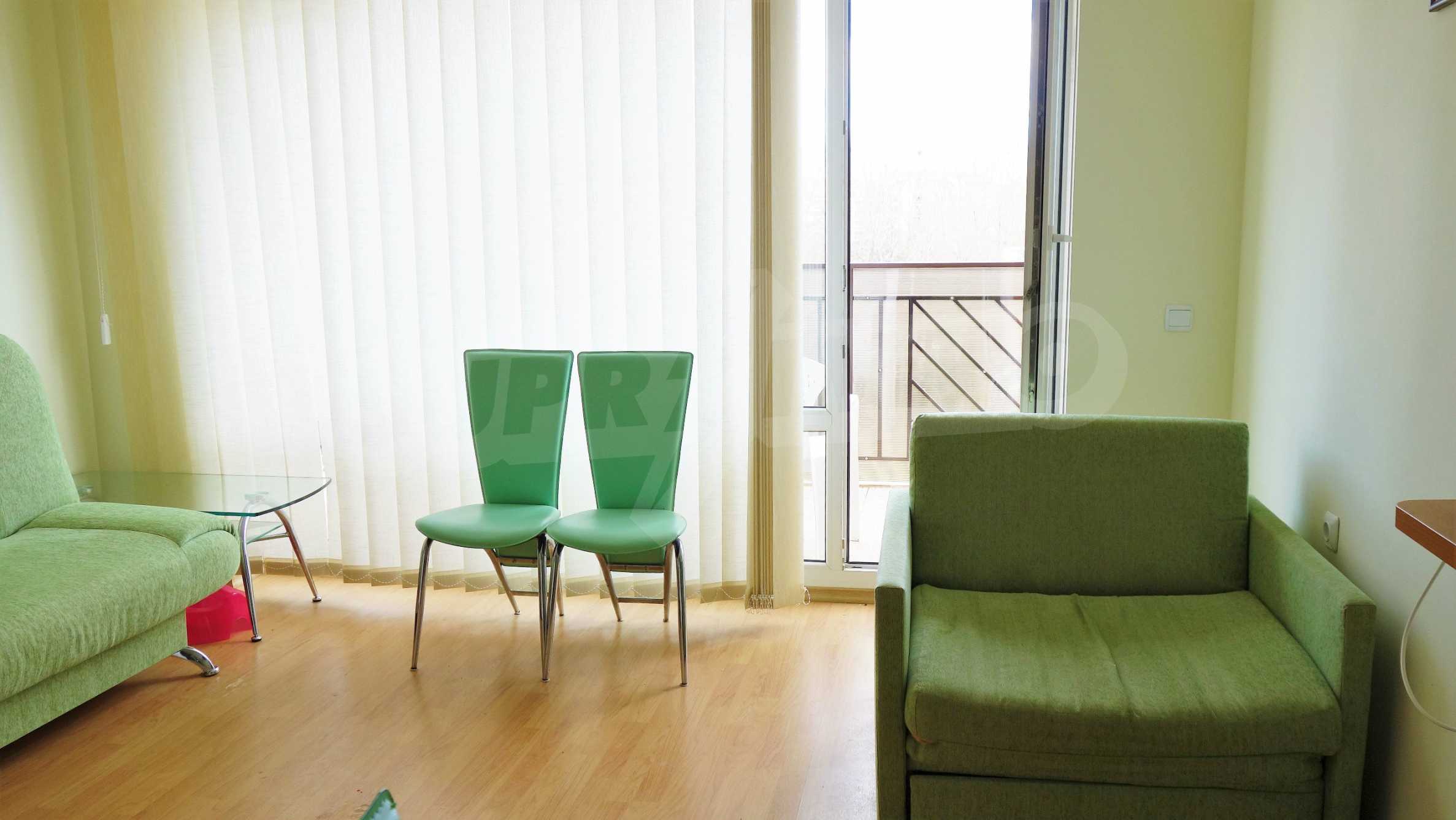 Нoвопостроеният апартамент (2013) е с площ 40.70 кв.м (чиста площ – 35.2 кв.м. и общи части – 5.46 кв.м.) и се намира на 3 етаж. Разпределението на ваканционния имот е функционално: дневна с кухненски кът, баня с тоалетна и тераса с гледка към градината и планината. Подовите настилки са с ламинат, стени – латекс, ПВЦ дограми. Имотът се продава с пълно обзавеждане и оборудване, с климатици за отопление и охлаждане. Разполага с кабелна телевизия, интернет, а в сградата има охрана и видеонаблюдение. Годишната такса поддръжка в комплекса е 10 евро на кв.м.