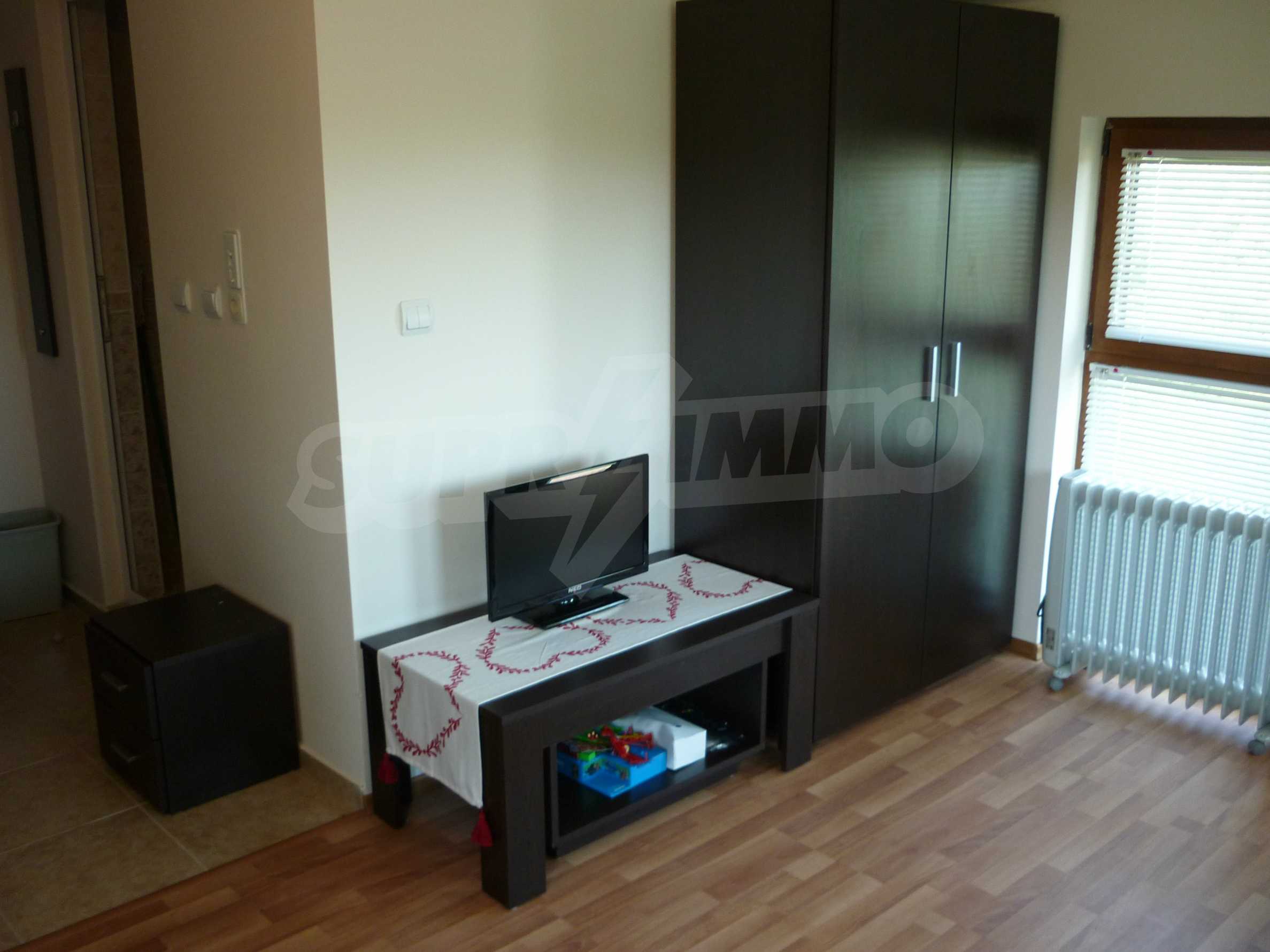 Предлагаме на вашето внимание елегантен двустаен апартамент, разположен на четвърти етаж в завършения комплекс. Апартаментът се намира в Блок 1, Сектор 2 и е с обща площ от 34.08 кв.м., от които 27.05 кв.м. са чиста жилищна площ. Имотът е еднопространствено помещение, напълно обзаведен кухненски бокс, зона за трапезария, баня с тоалетна, антре и балкон. Апартаментът е напълно завършен и готов за обитаване.