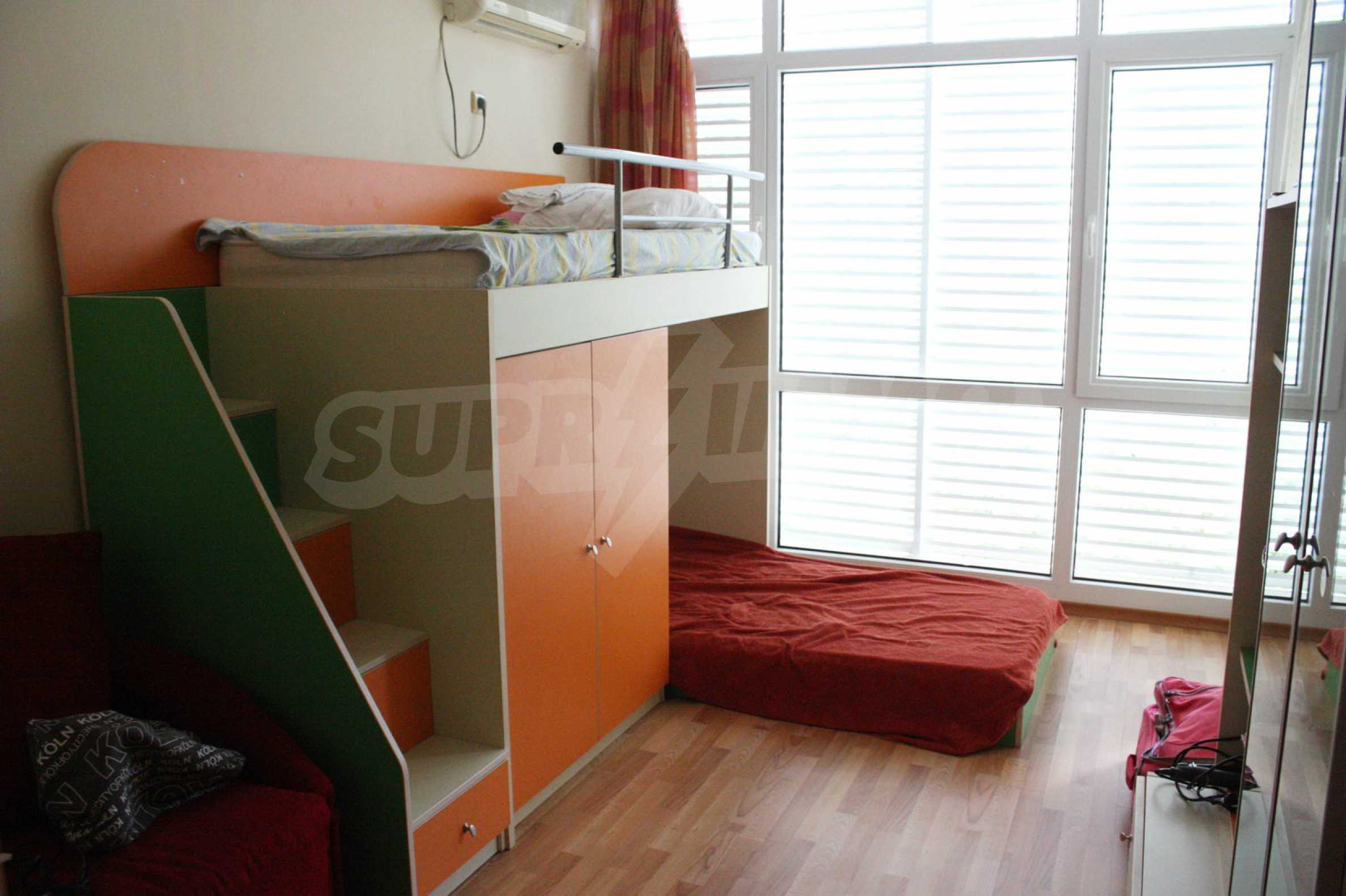 Апартаментът се намира е на 3-ти от общо 4 етажа. Заема обща площ от 86 кв.м. разпределени между просторна дневна с кухненски бокс, две спални, баня с тоалетна и душ и два балкона с гледка към басейните на комплекса. Кухнята е оборудвана с електрически котлони, аспиратор, хладилник, пералня, маса, столове, кафе машина, тостер; във всекидневната има диван и масичка; основната спалня е обзаведена с легло, гардероб, бюро и телевизор; детската спалня е с 2 легла, гадероб и диван. Жилището е просторно и слънчево, предлага всички удобства за една пъноценна семейна почивка. Продава се напълно обзаведено, оборудвано с климатик и WiFi интернет. Годишната такса за поддръжка на комплекса е 500 Евро.