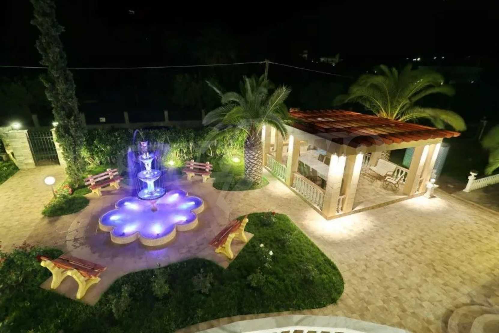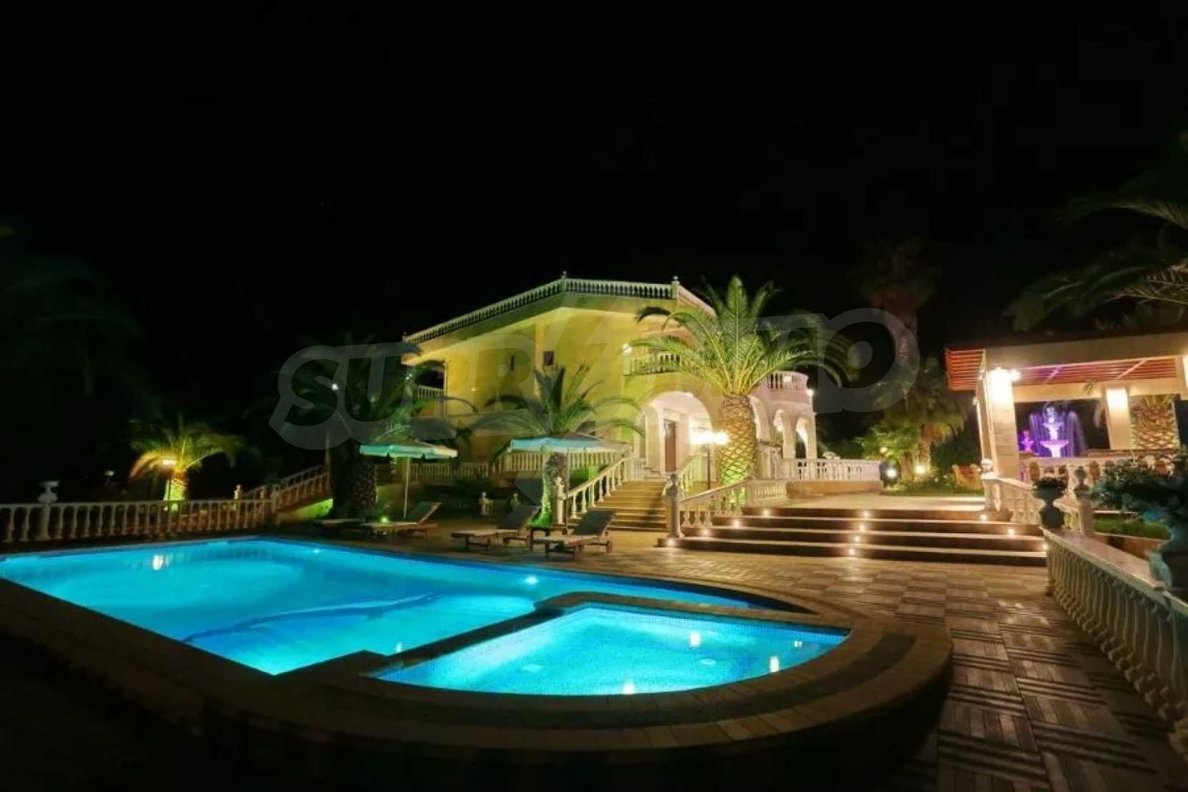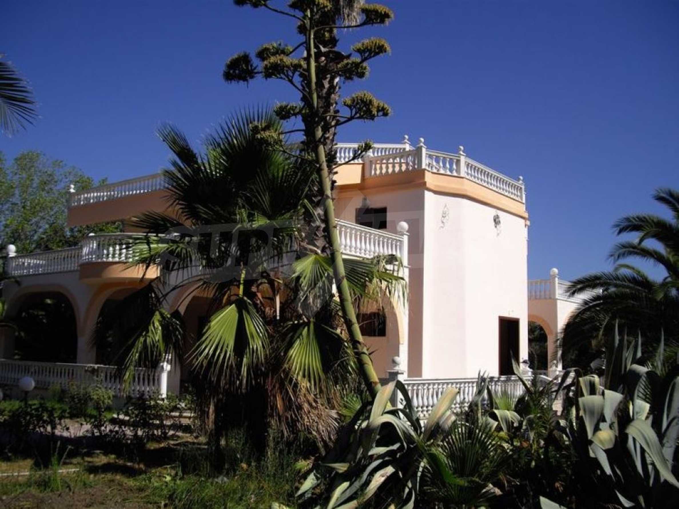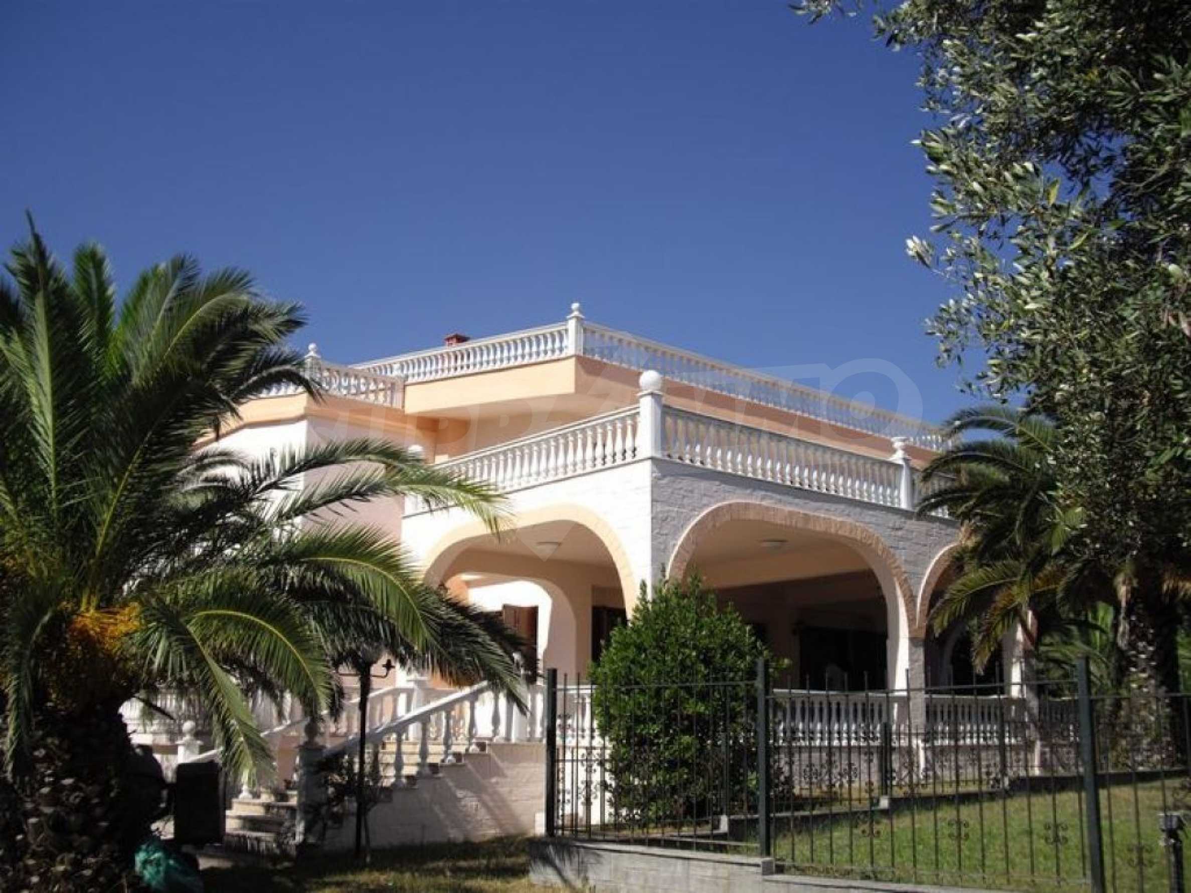 Предлагаме на вашето внимание вилa с площ 350 кв.м. Година на строителство: 2006. Отоплението се осъществява посредством камина, локално парно и слънчеви колектори. Има климатизация. Имотът се предлага със следната степен на завършеност: алуминиева дограма и блиндирана входна врата. Имотът е снабден с канализация. Важно е да се отбележи, че имотът разполага с: балкон, баня с тоалетна, гараж, килер, паркинг, джакузи и сот. От имота се разкрива гледка към морето.