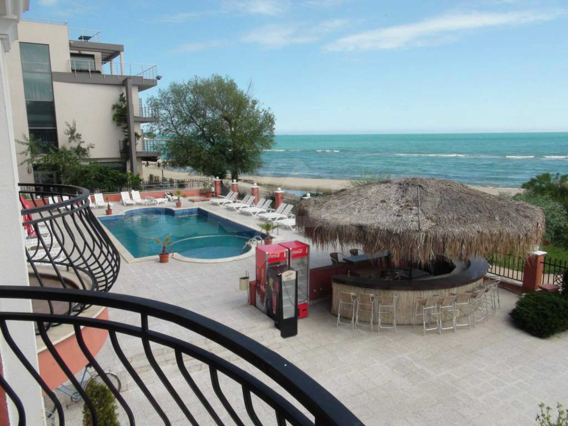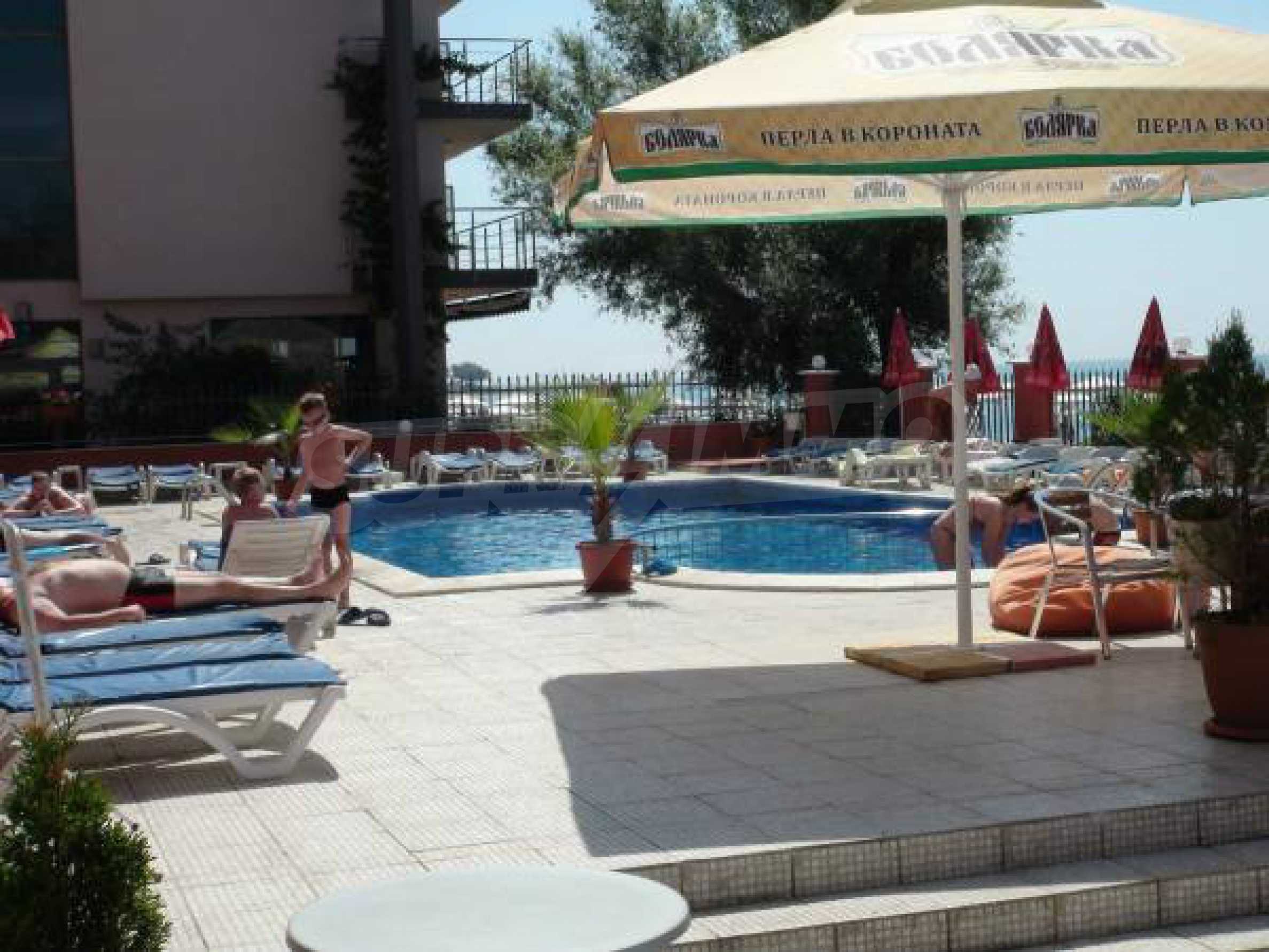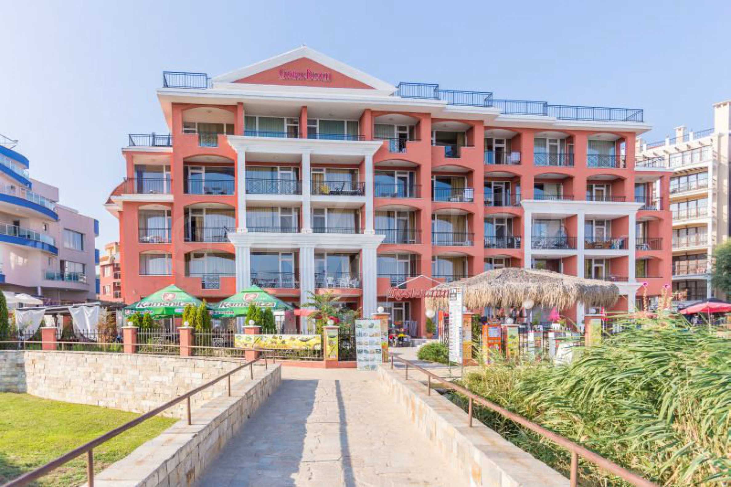 Удобен и практичен ваканционен апартамент на втори етаж в комплекс "Карина Бийч"/ Carina Beach - Слънчев Бряг. Комплексът граничи с пясъчната ивица и има уникална гледка по протежение на целия залив. Ситуиран е в най-тихата част на Слънчев Бряг и в непосредствена близост до емблемата на Слънчев бряг – 5 звездния хотелски комплекс "Хелена ризорт".