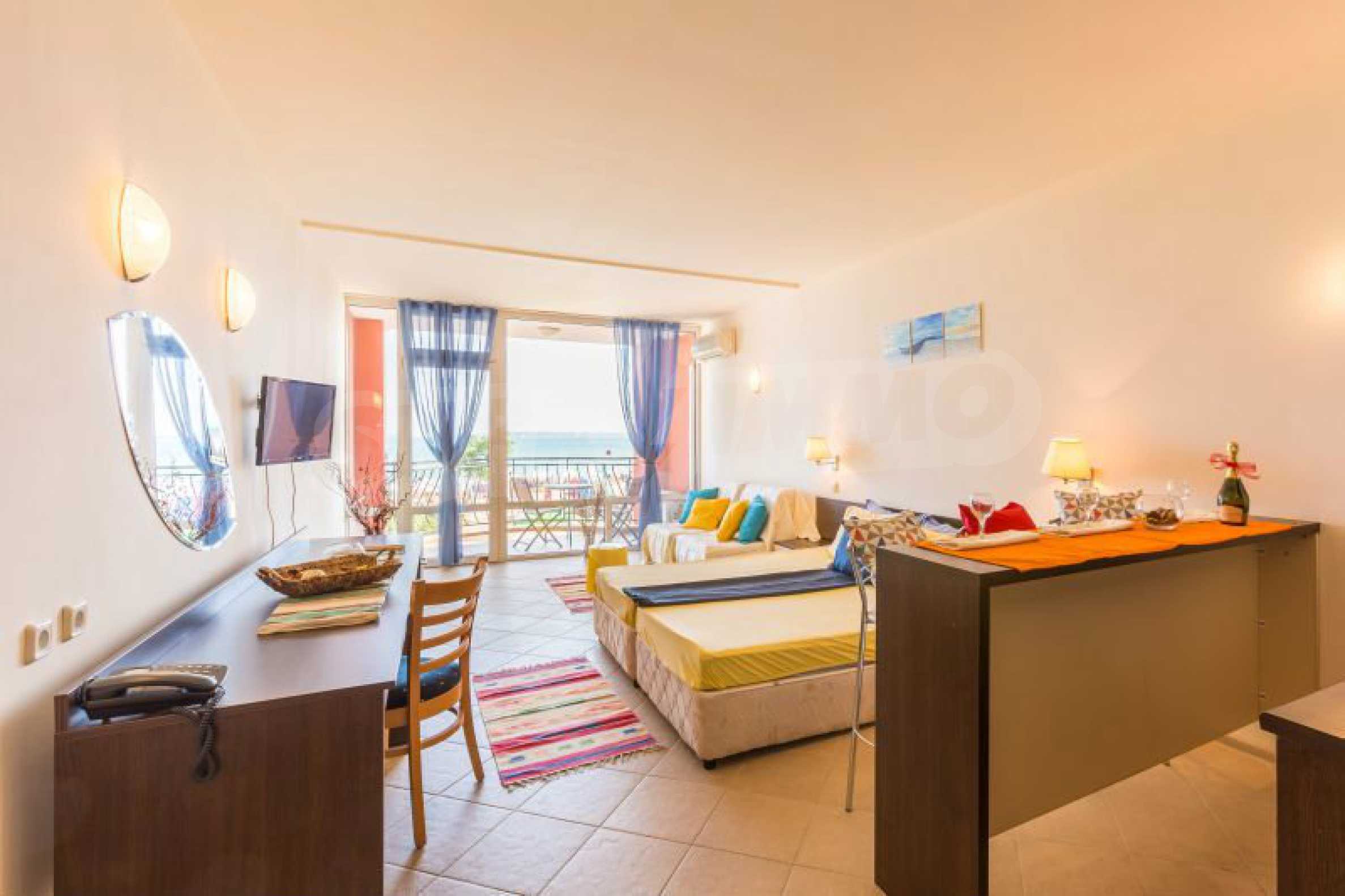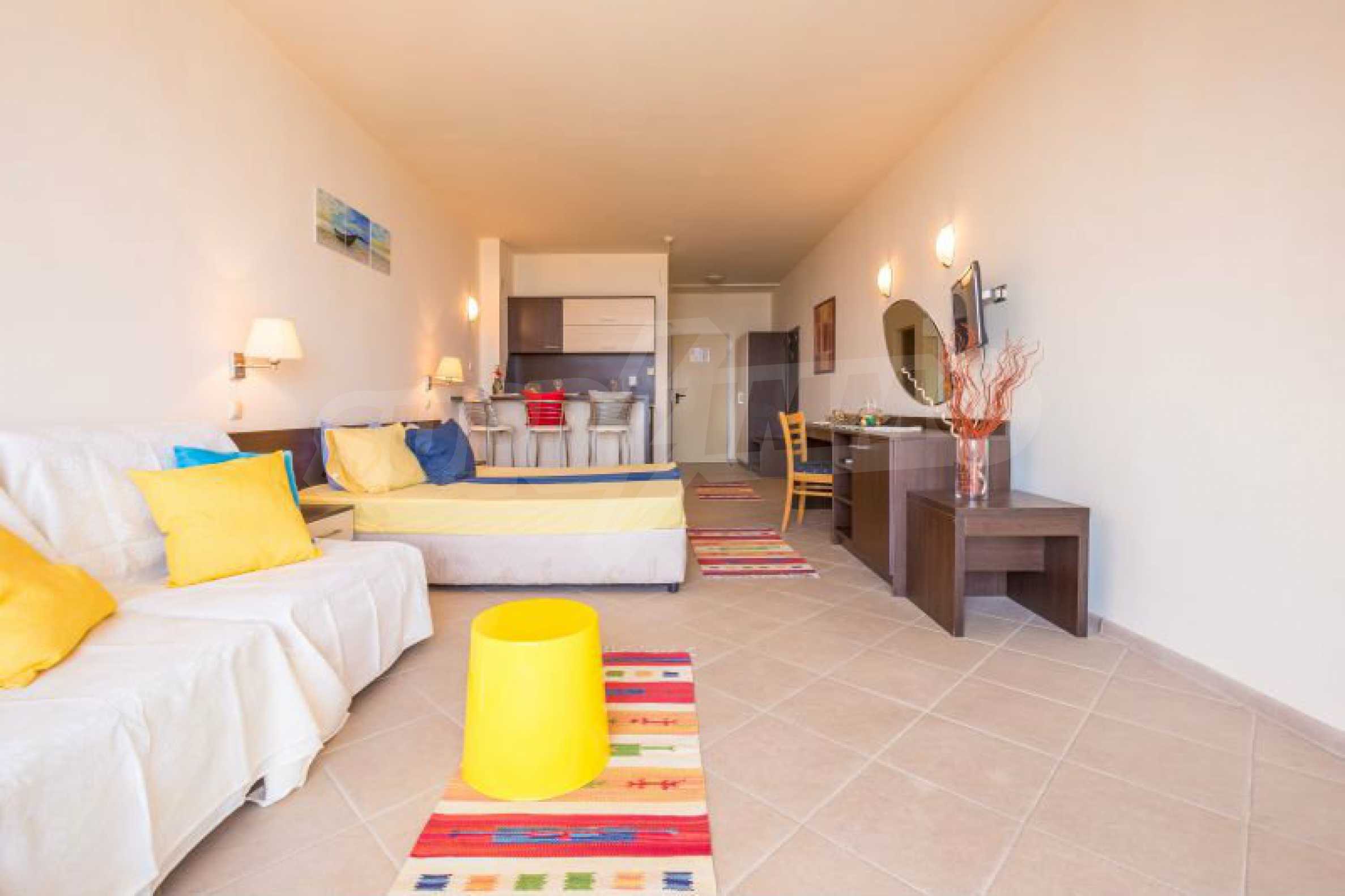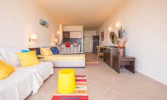Общата площ на жилището е 57 кв.м. Комфортно обзаведеният и оборудван апартамент включва дневна с кухненски бокс, напълно оборудван с всички необходими електроуреди и бар-плот със столове за хранене, спален кът с двойно легло, мека мебел и голям телевизор, климатик, баня с тоалетна и един балкон с красива гледка към морския бряг. Студиото е след основен ремот и е много комфортно, подходящо е за настаняване на четиричленно семейство. Имотът разполага с кабелна телевизия, интернет, СОТ. Годишната такса за поддръжка на комплекса е 13 Евро за кв.м. Апартаментът е готов за нанасяне или отдаване под наем.