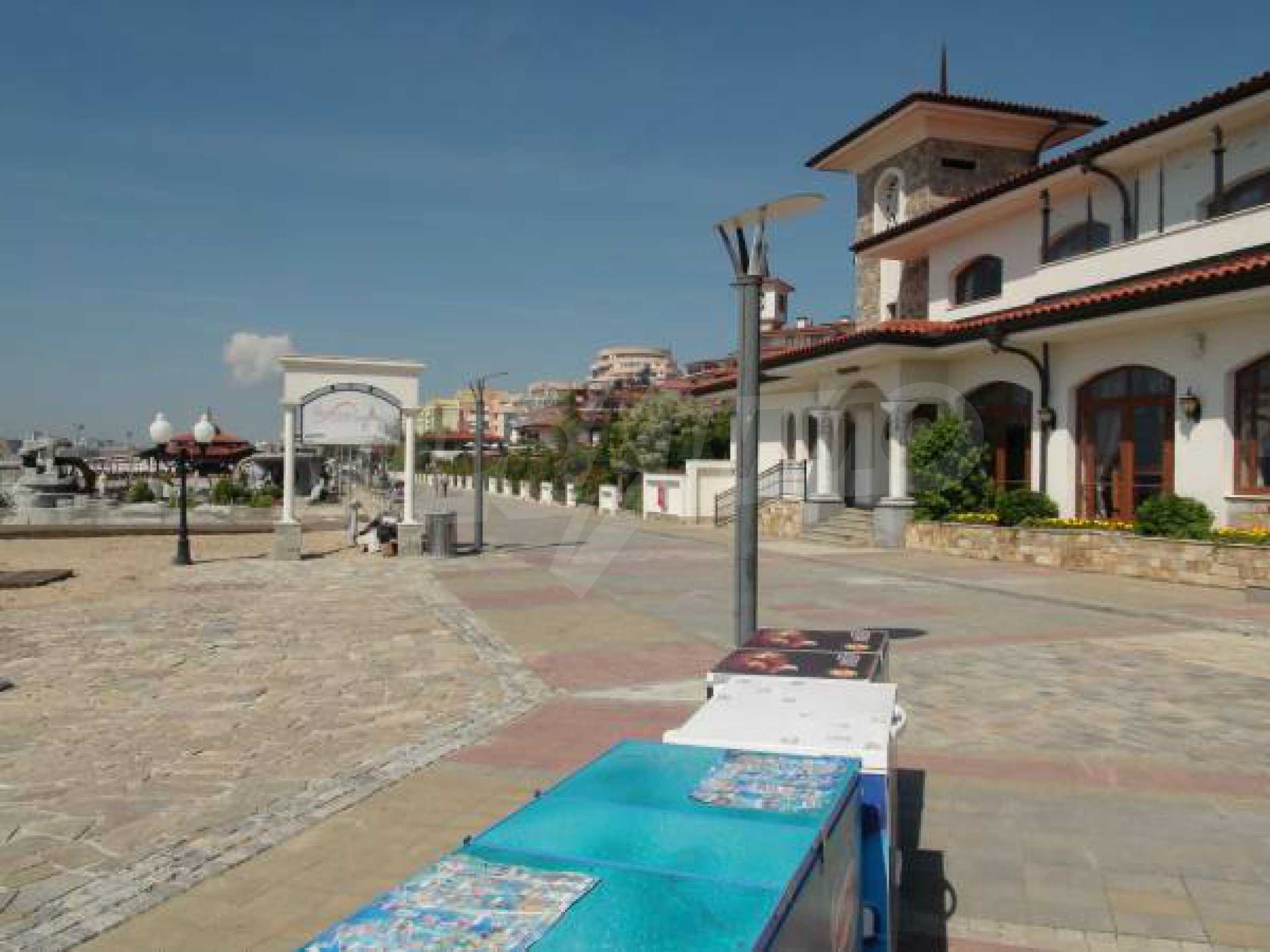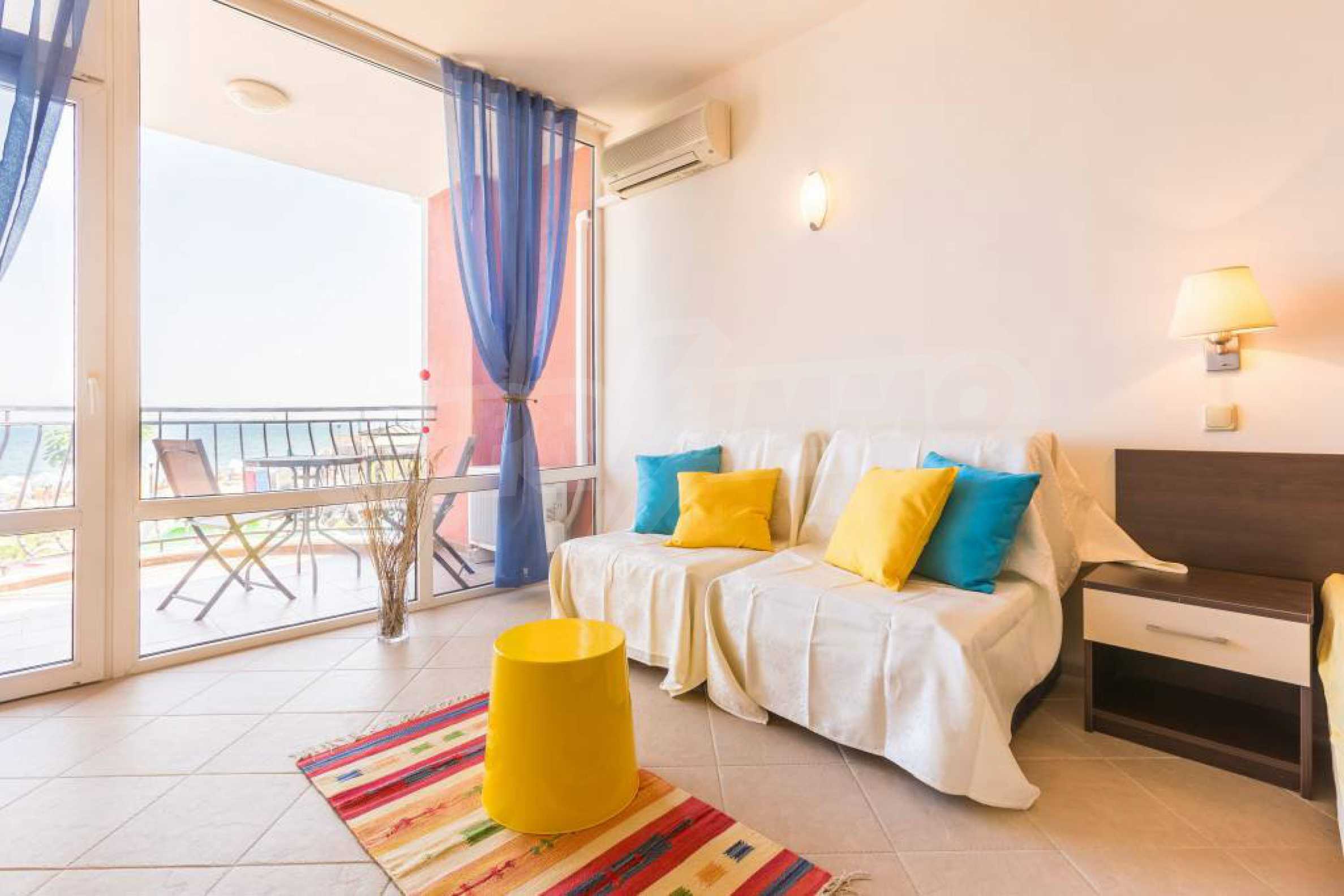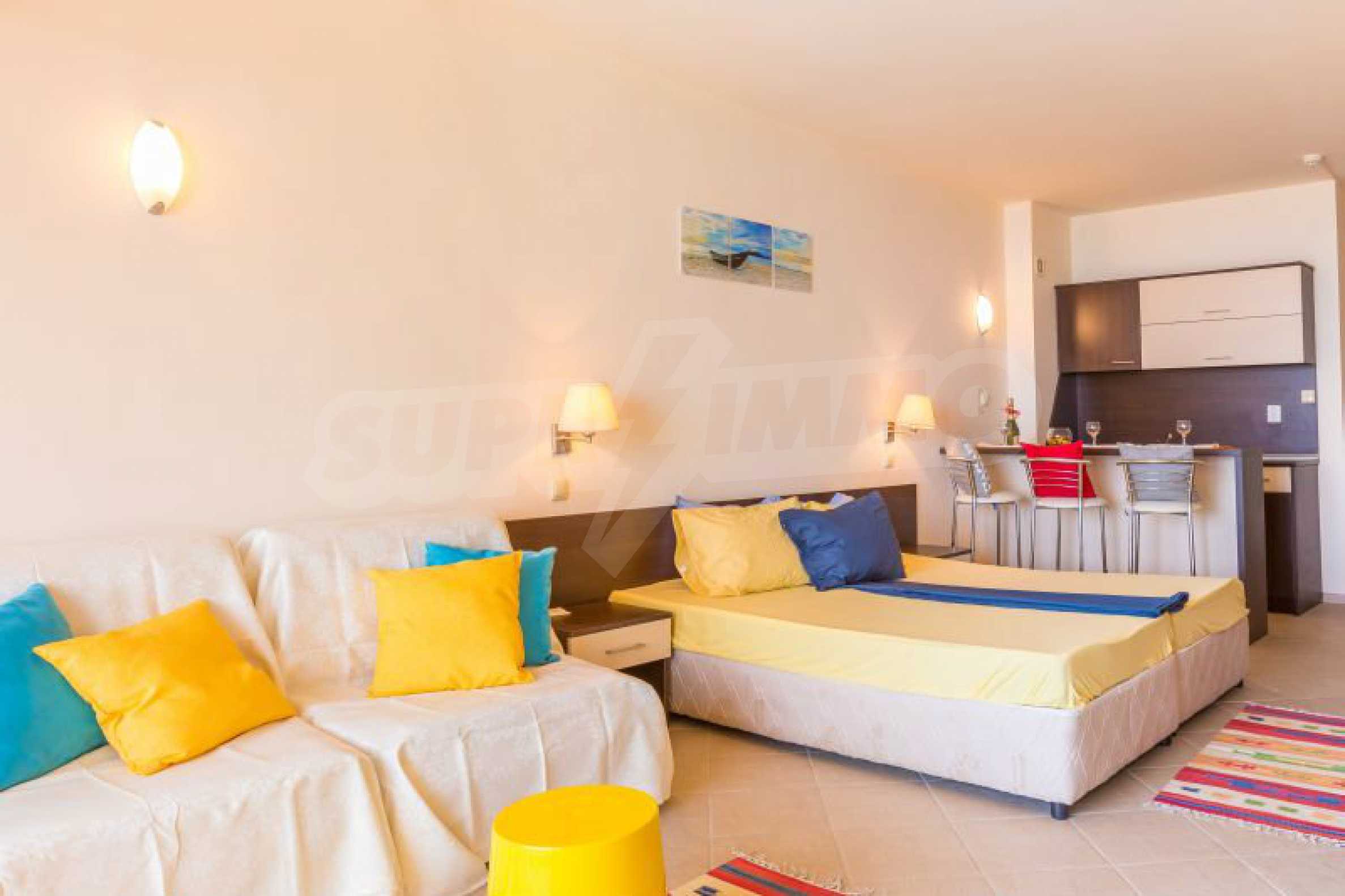 Общата площ на жилището е 57 кв.м. Комфортно обзаведеният и оборудван апартамент включва дневна с кухненски бокс, напълно оборудван с всички необходими електроуреди и бар-плот със столове за хранене, спален кът с двойно легло, мека мебел и голям телевизор, климатик, баня с тоалетна и един балкон с красива гледка към морския бряг. Студиото е след основен ремот и е много комфортно, подходящо е за настаняване на четиричленно семейство. Имотът разполага с кабелна телевизия, интернет, СОТ. Годишната такса за поддръжка на комплекса е 13 Евро за кв.м. Апартаментът е готов за нанасяне или отдаване под наем.
