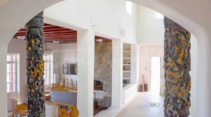 Очарователната вила включва зашеметяващ вход антре с високи седемметрови тавани, изключително просторна дневна с камина и невероятна трапезария, седем климатизирани спални, всяка със самостоятелна баня, сервизни помещения, фитнес зала, мокро помещение, инфинити басейн с размер 15x6 метра, много тераси и веранди, красива и съвременна кухня с висок клас оборудване.