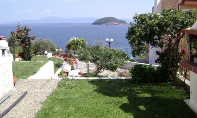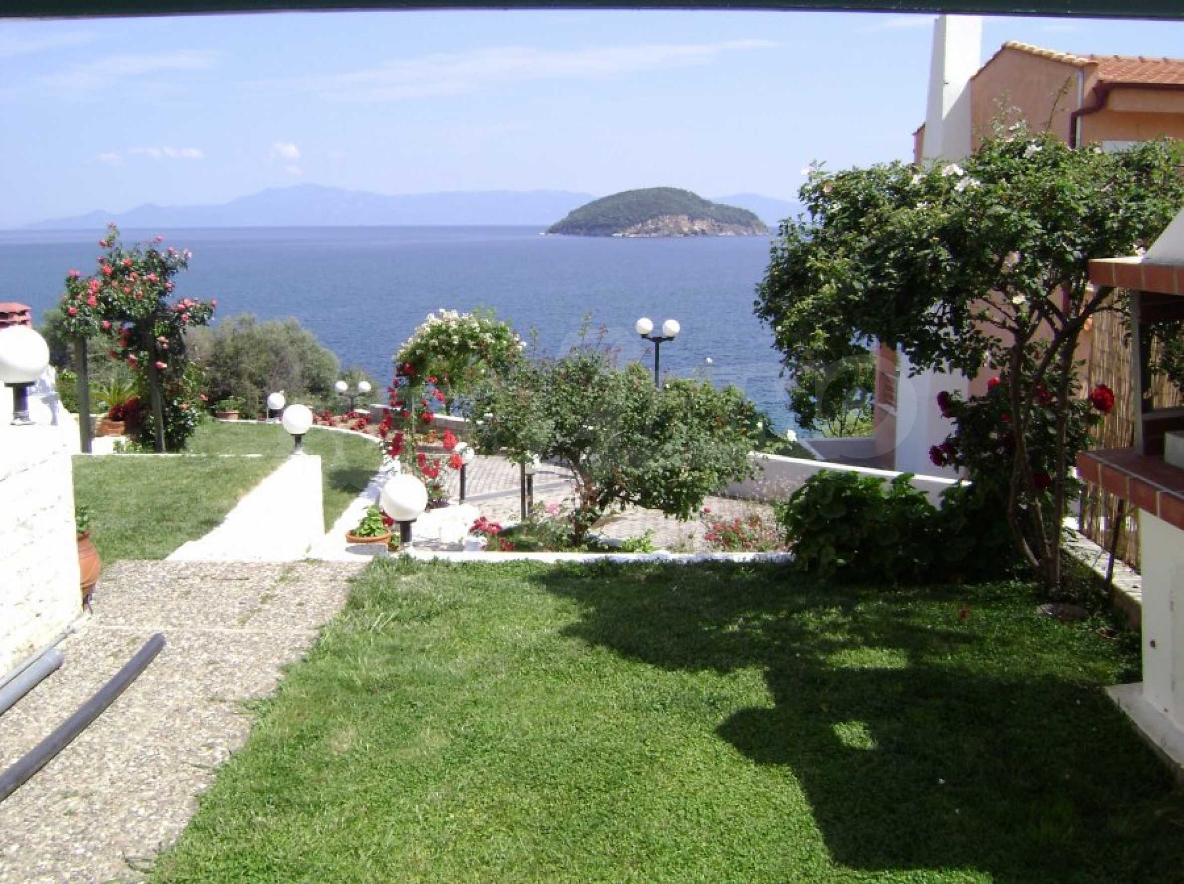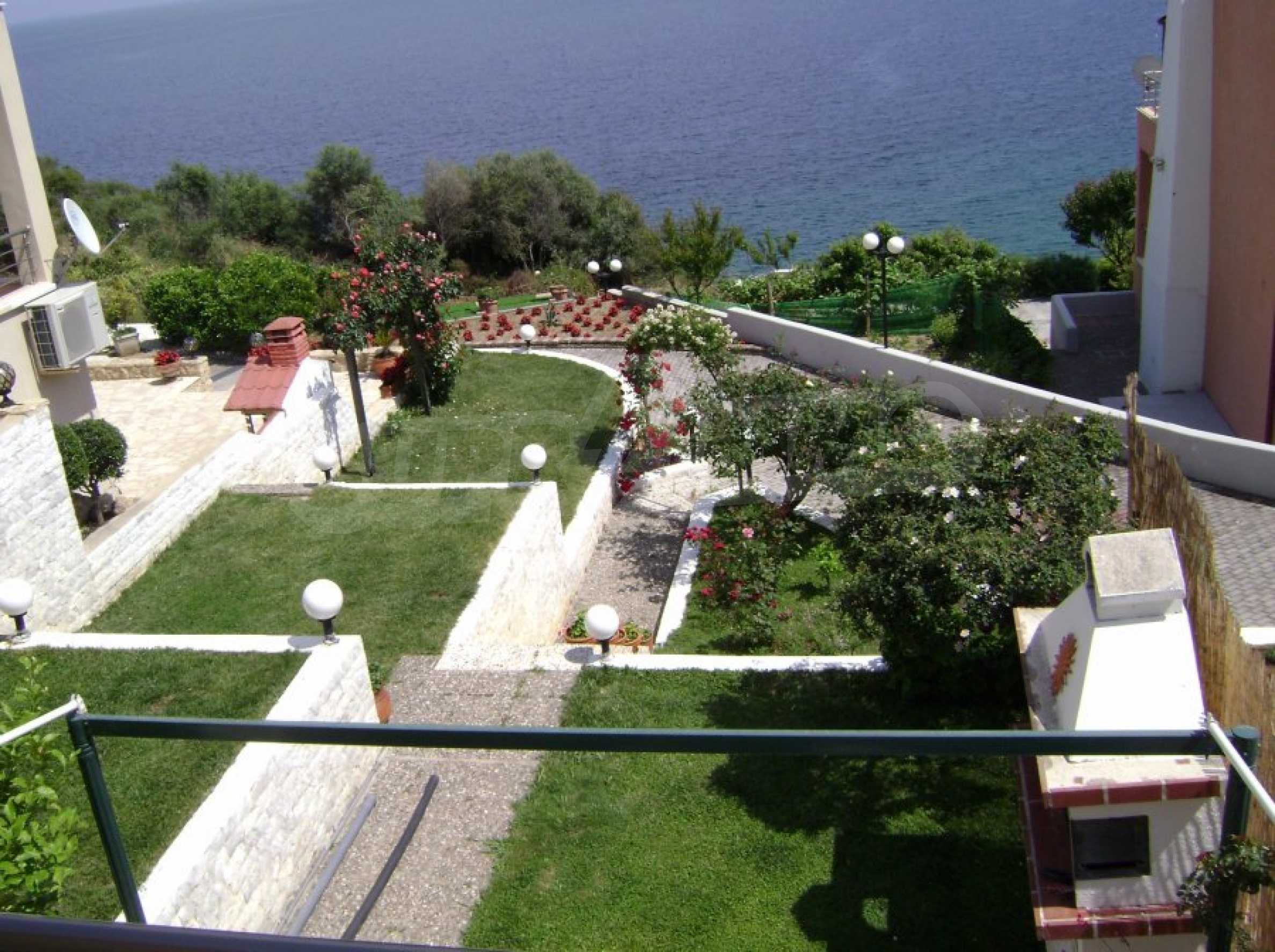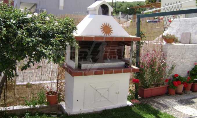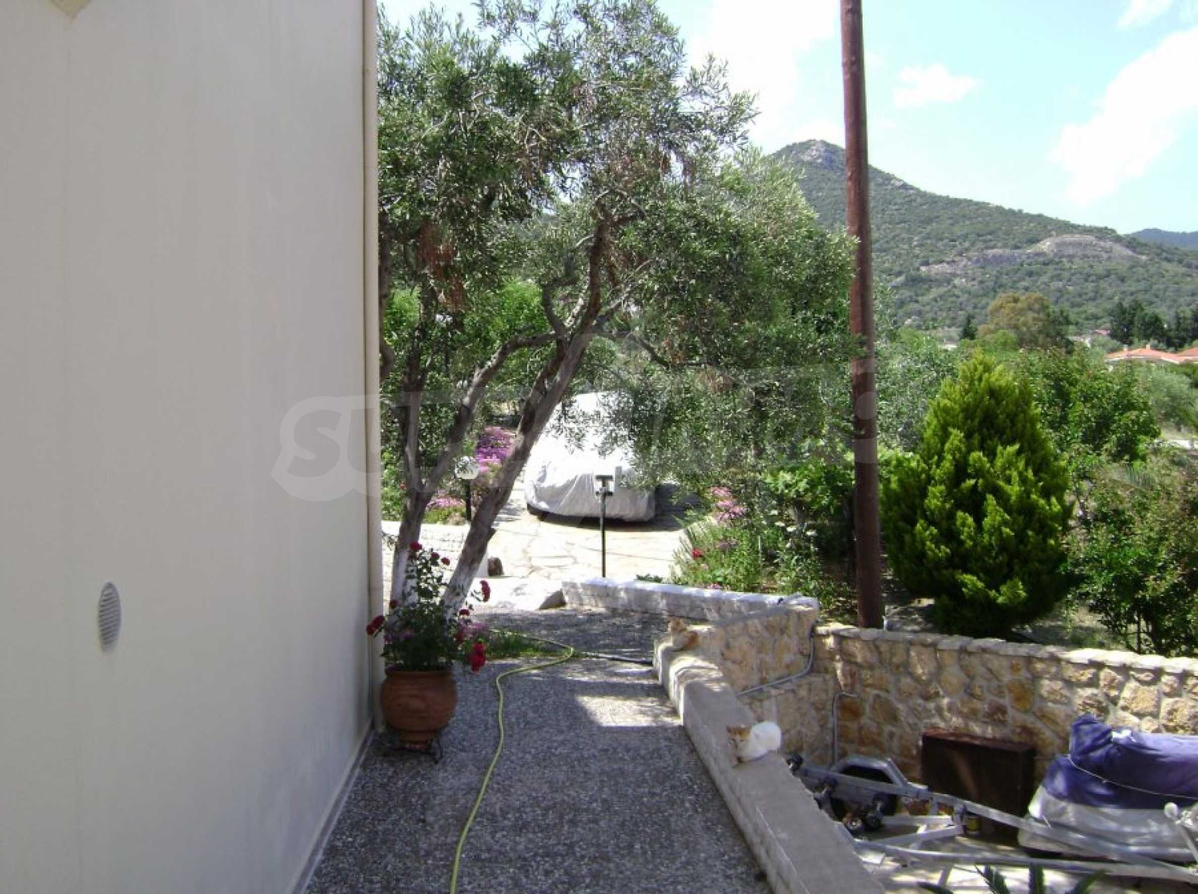 Дворът е оформен стъпаловидно с барбекю кът, озеленен с растения и алея, която води до плажа.