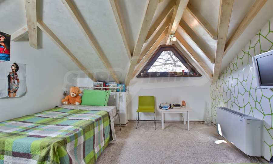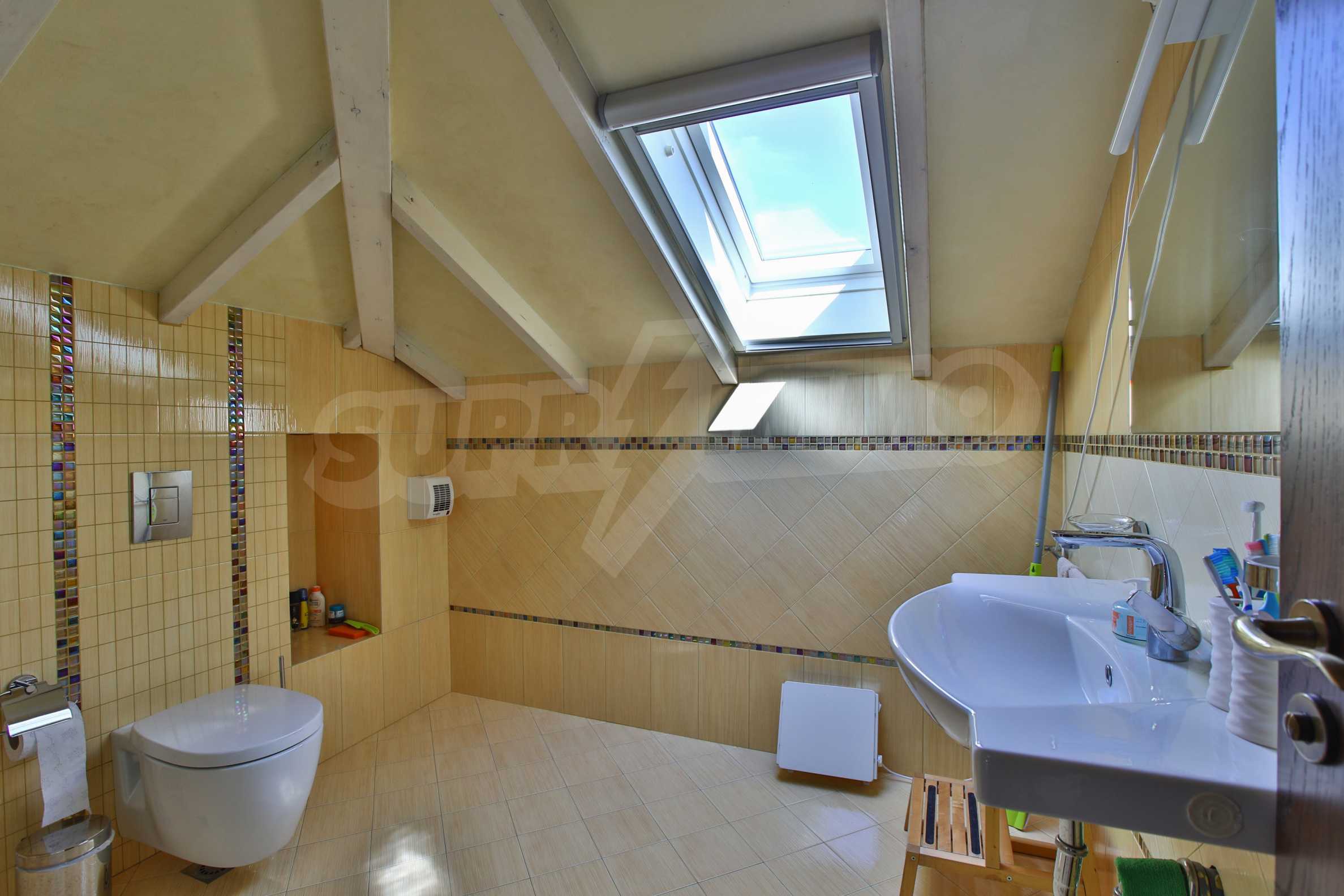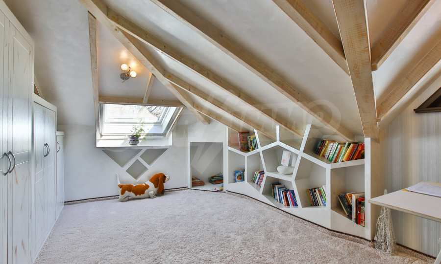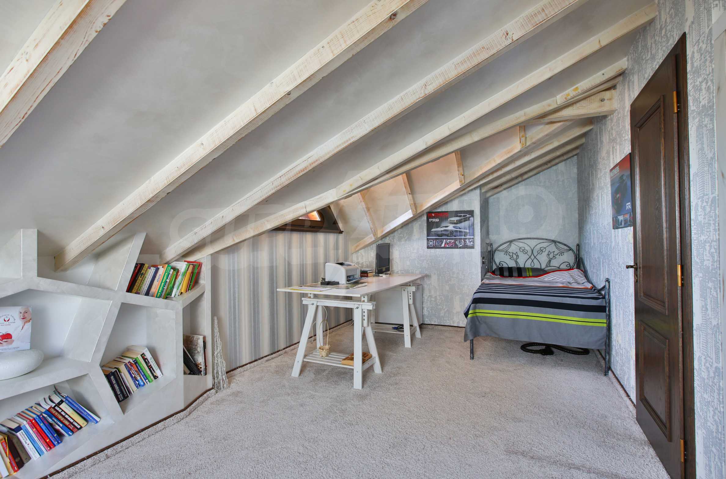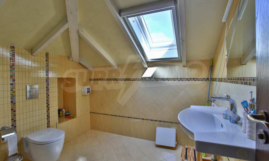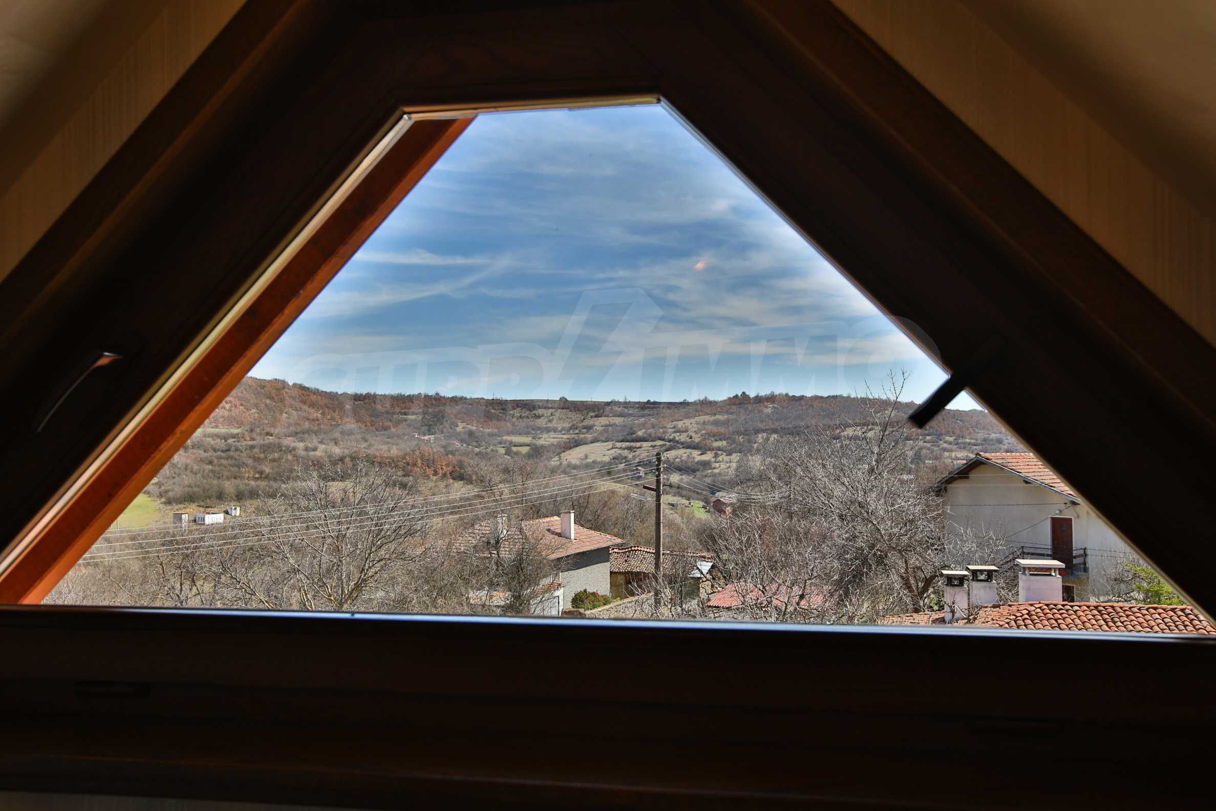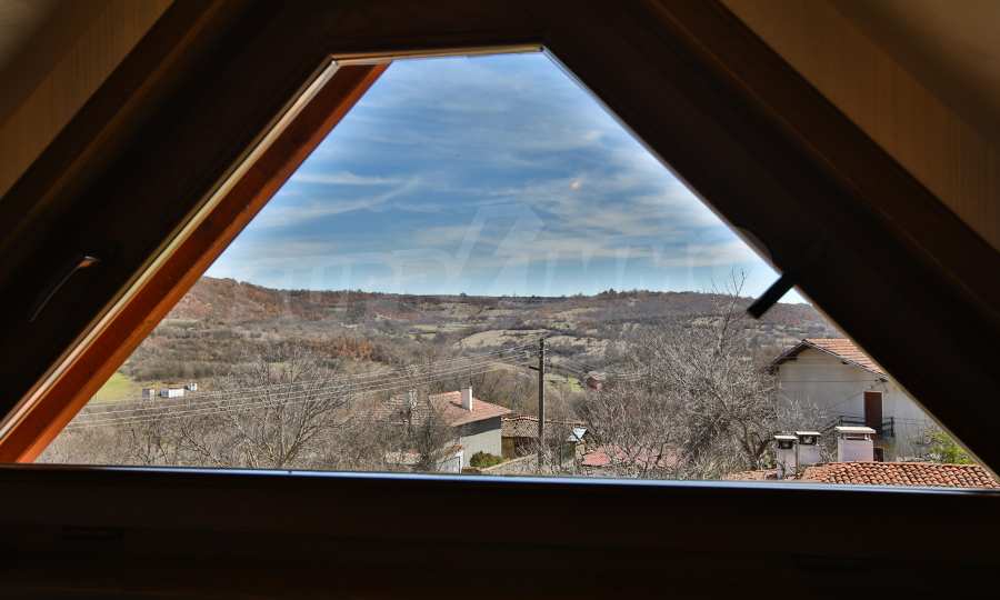 Дограмата е дървен стъклопакет (дъб), покривните прозорци са "Велукс"