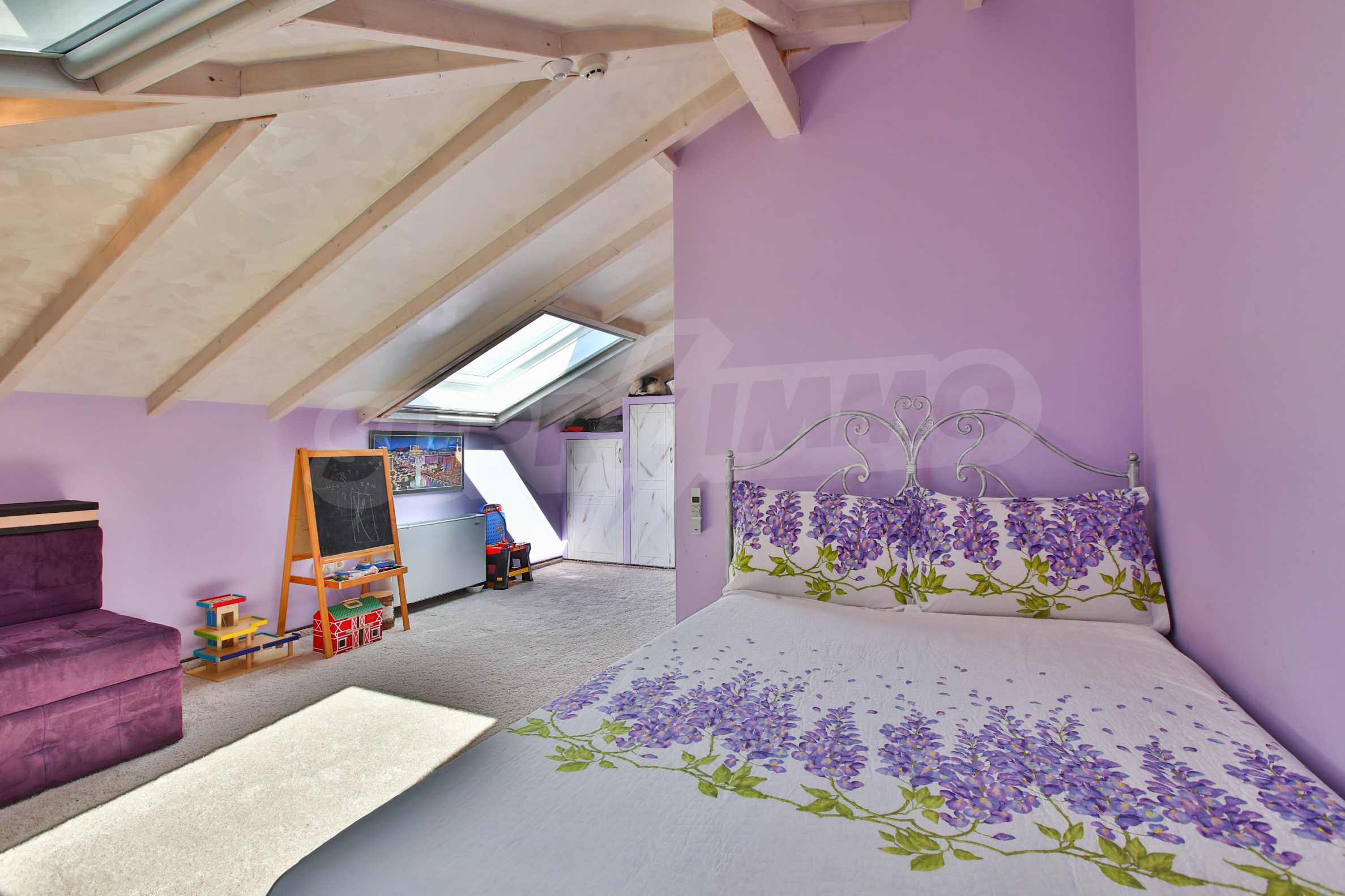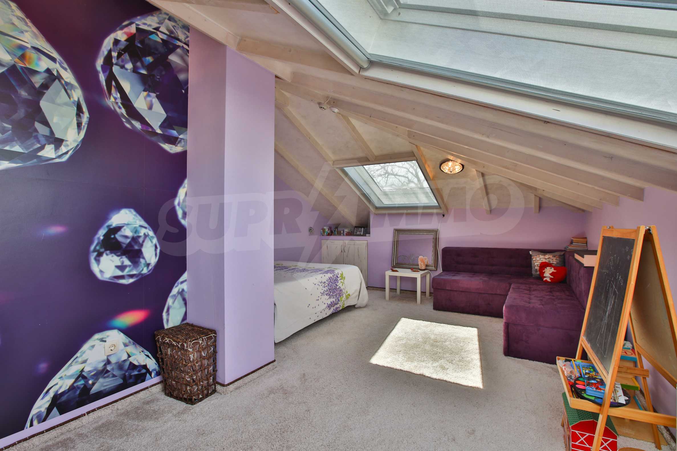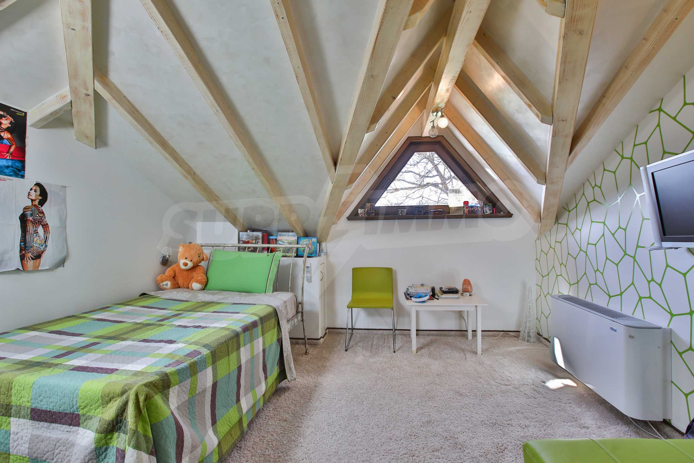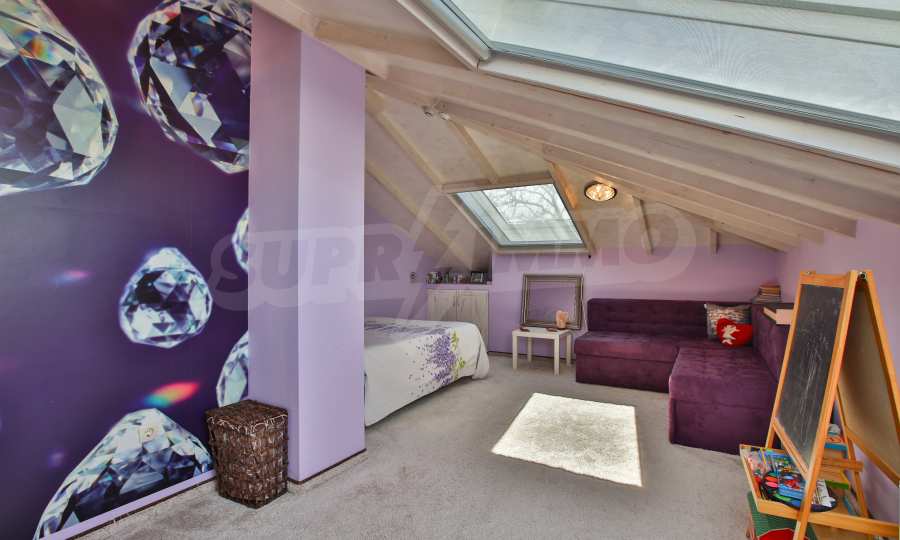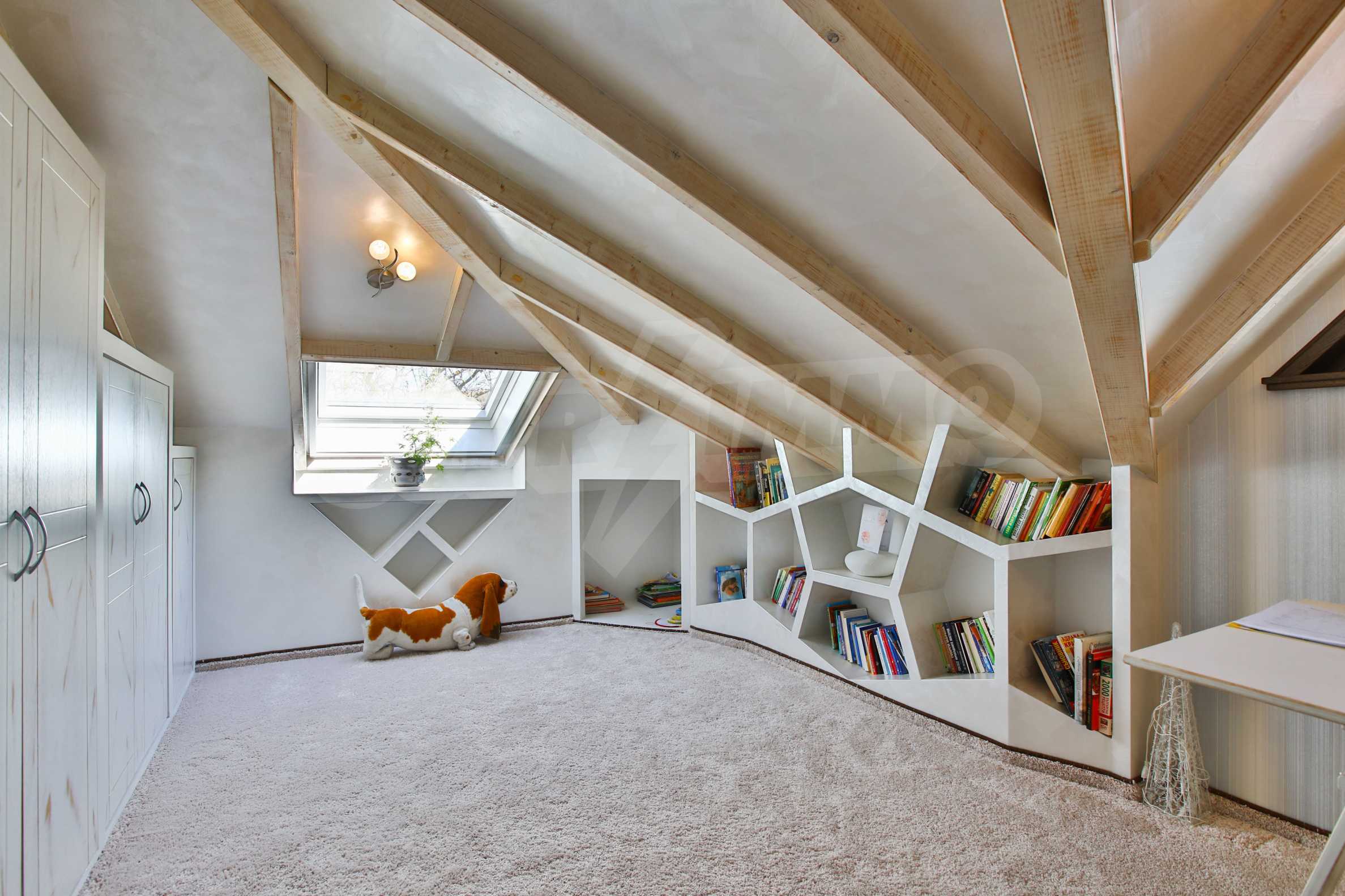 Дограмата е дървен стъклопакет (дъб), покривните прозорци са "Велукс"