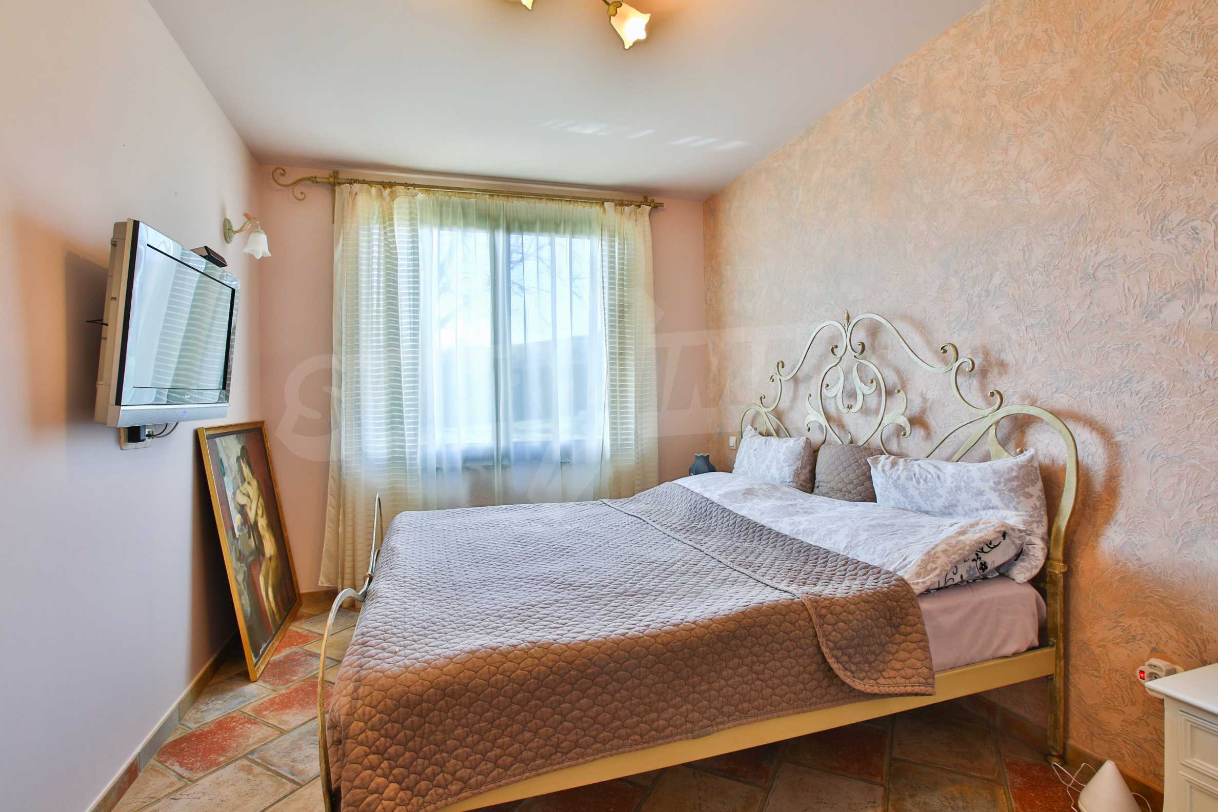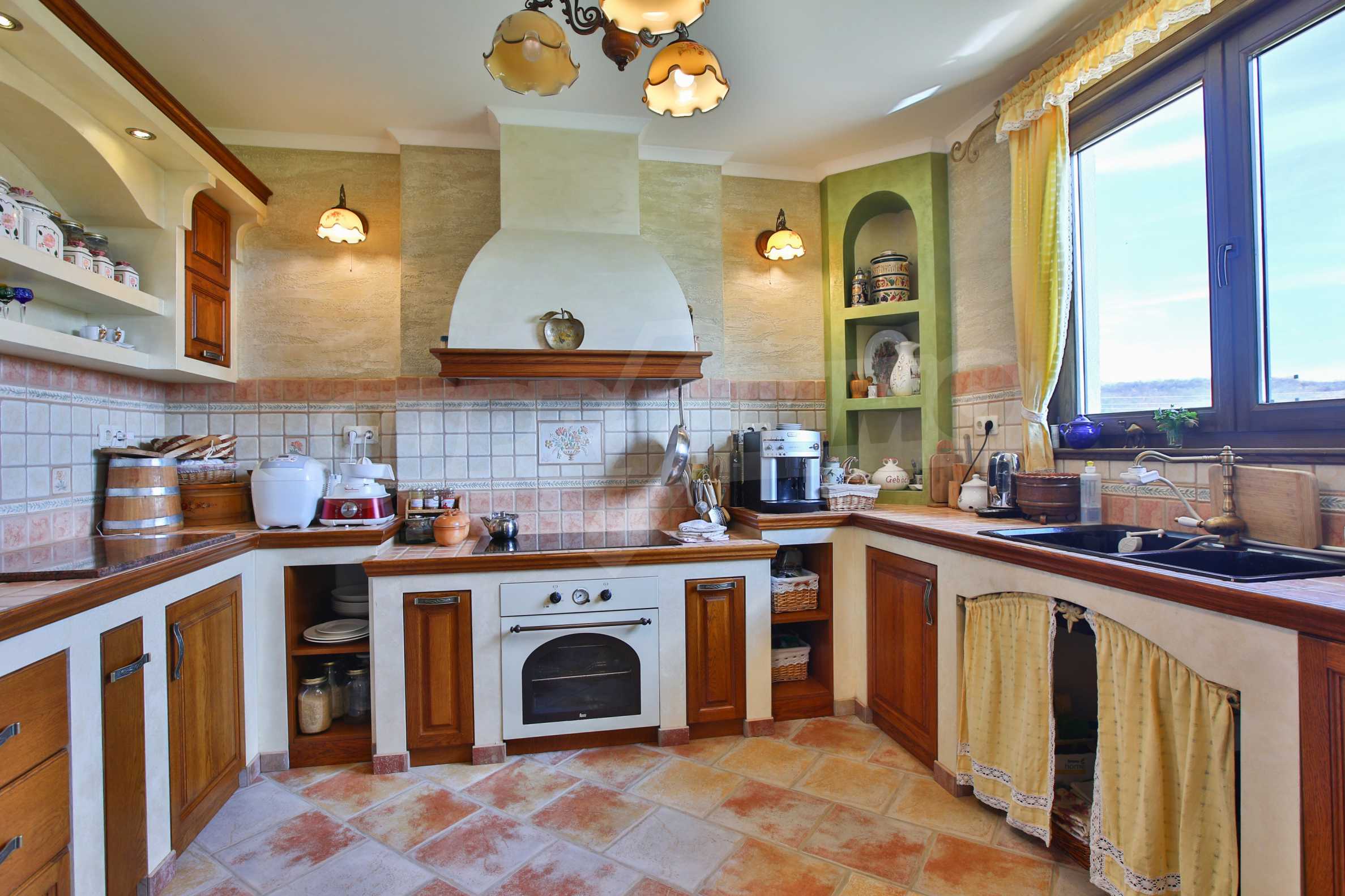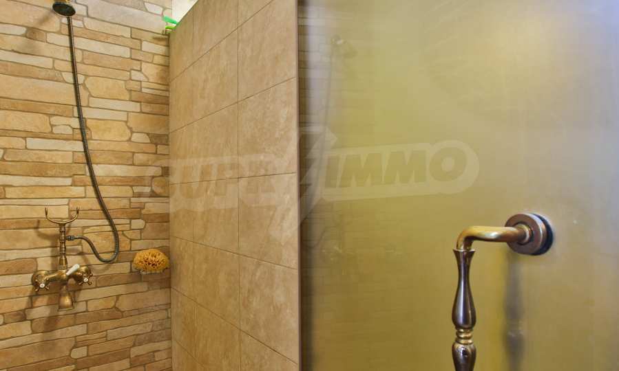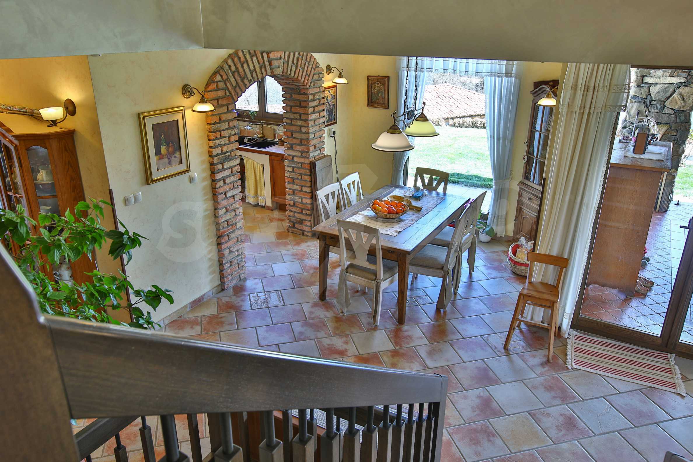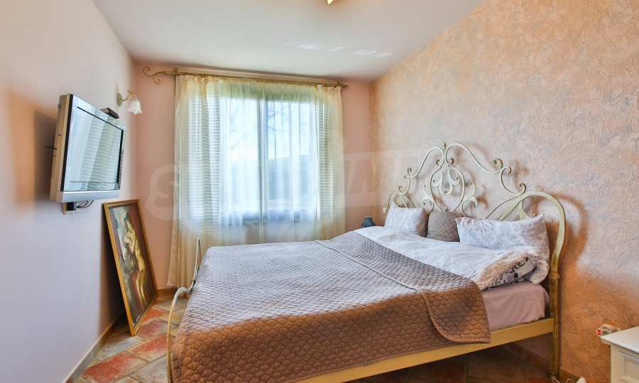 Първи етаж - кухня, трапезария, тоалетна, всекидневна, спалня, гардеробна, баня с тоалетна. От всекидневната се излиза на просторна веранда с облицована с камък и оборудвана с мивка и барбекю.