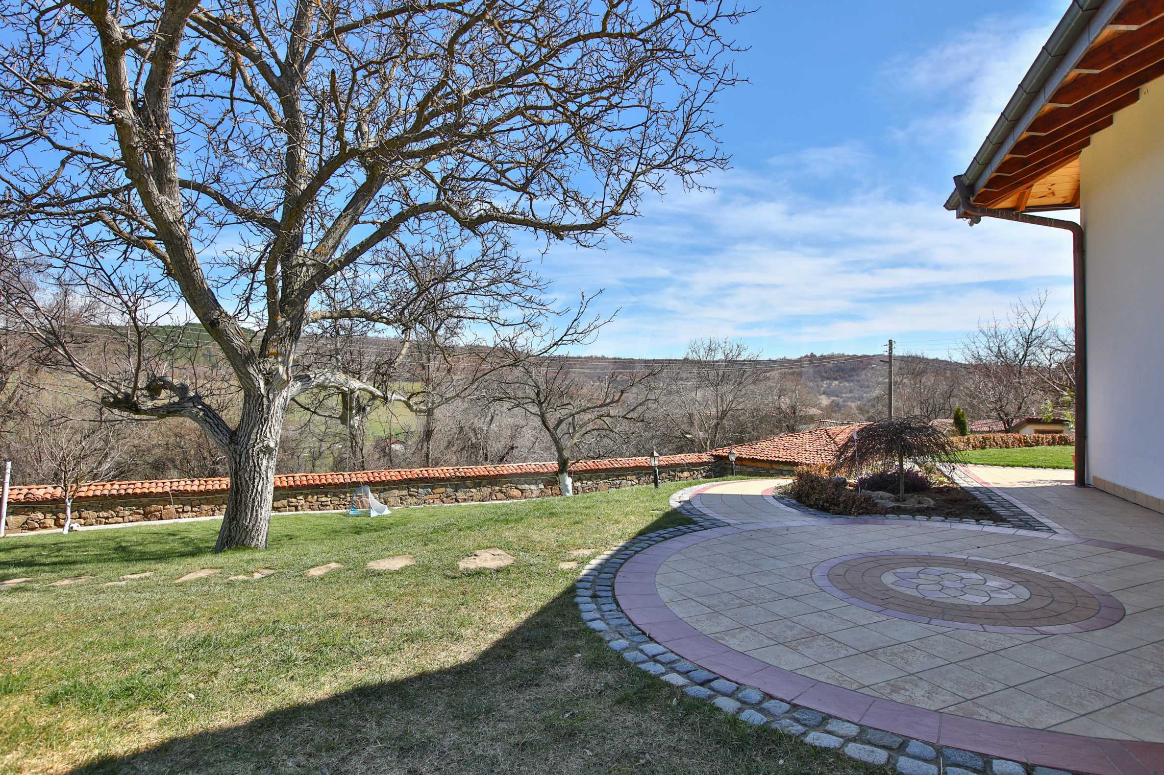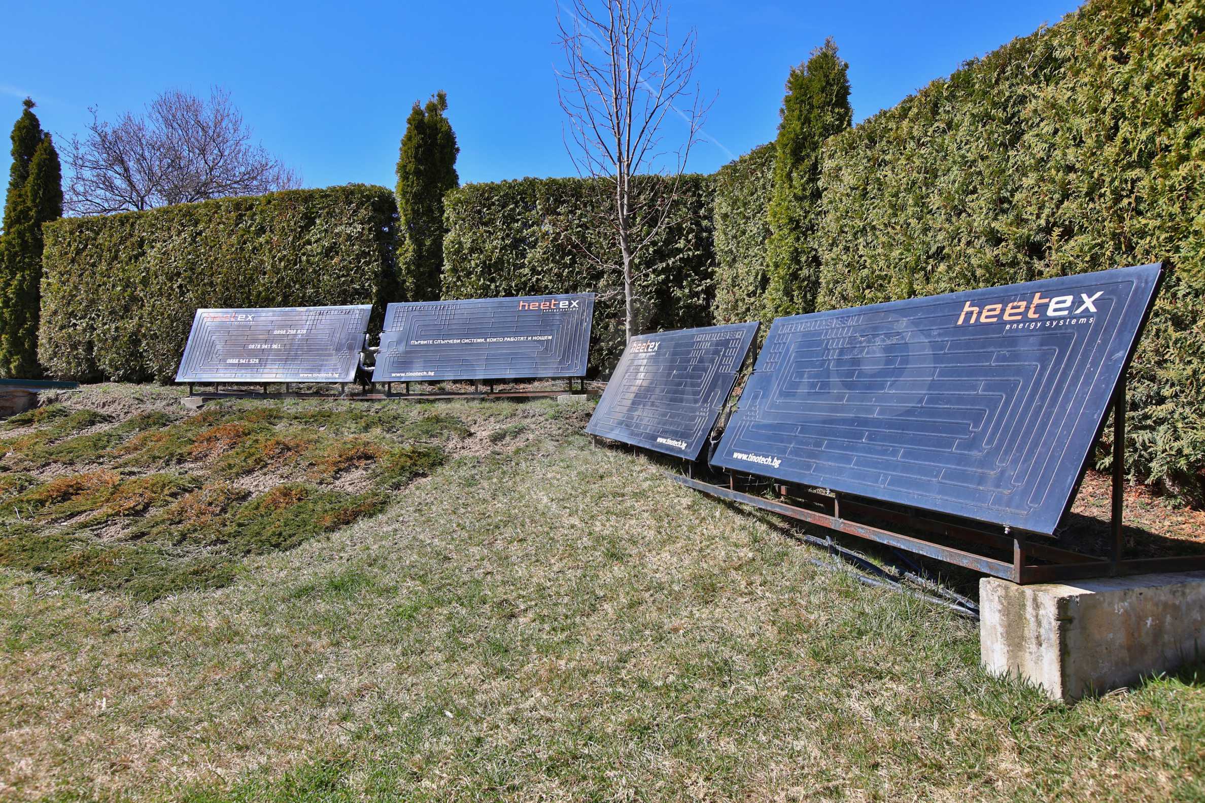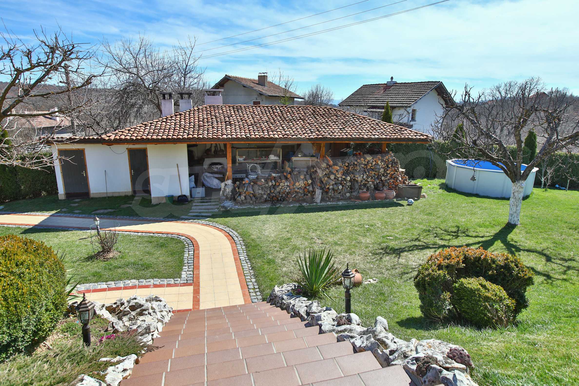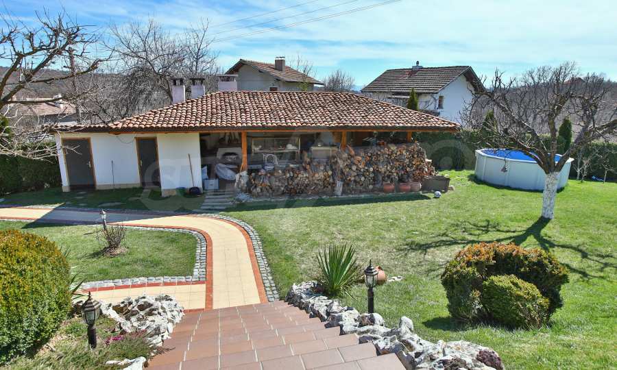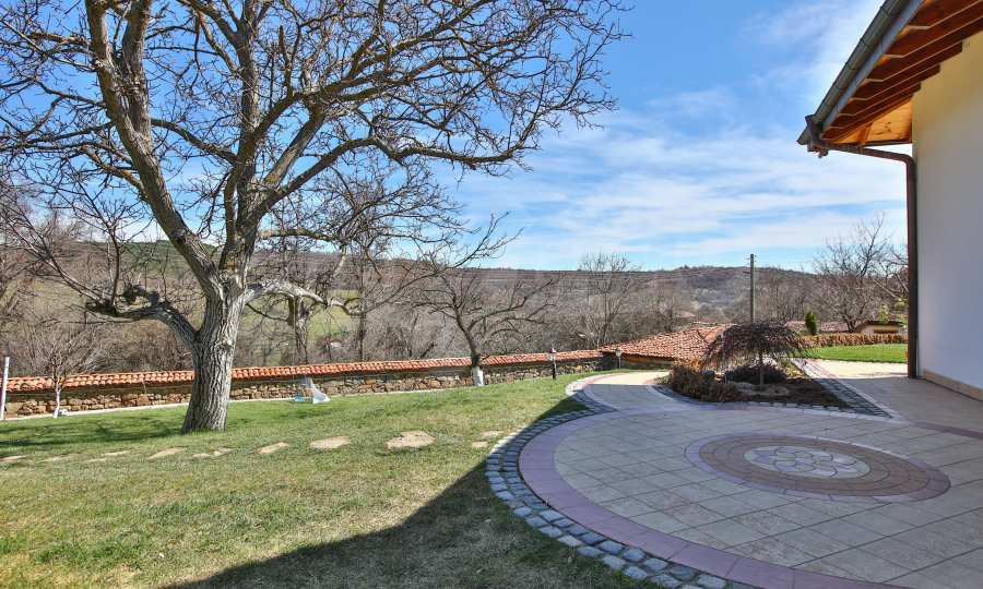 Дворът е 1500 кв.м. озеленен и с изградена поливна система, има навес със пещ и огнище.
