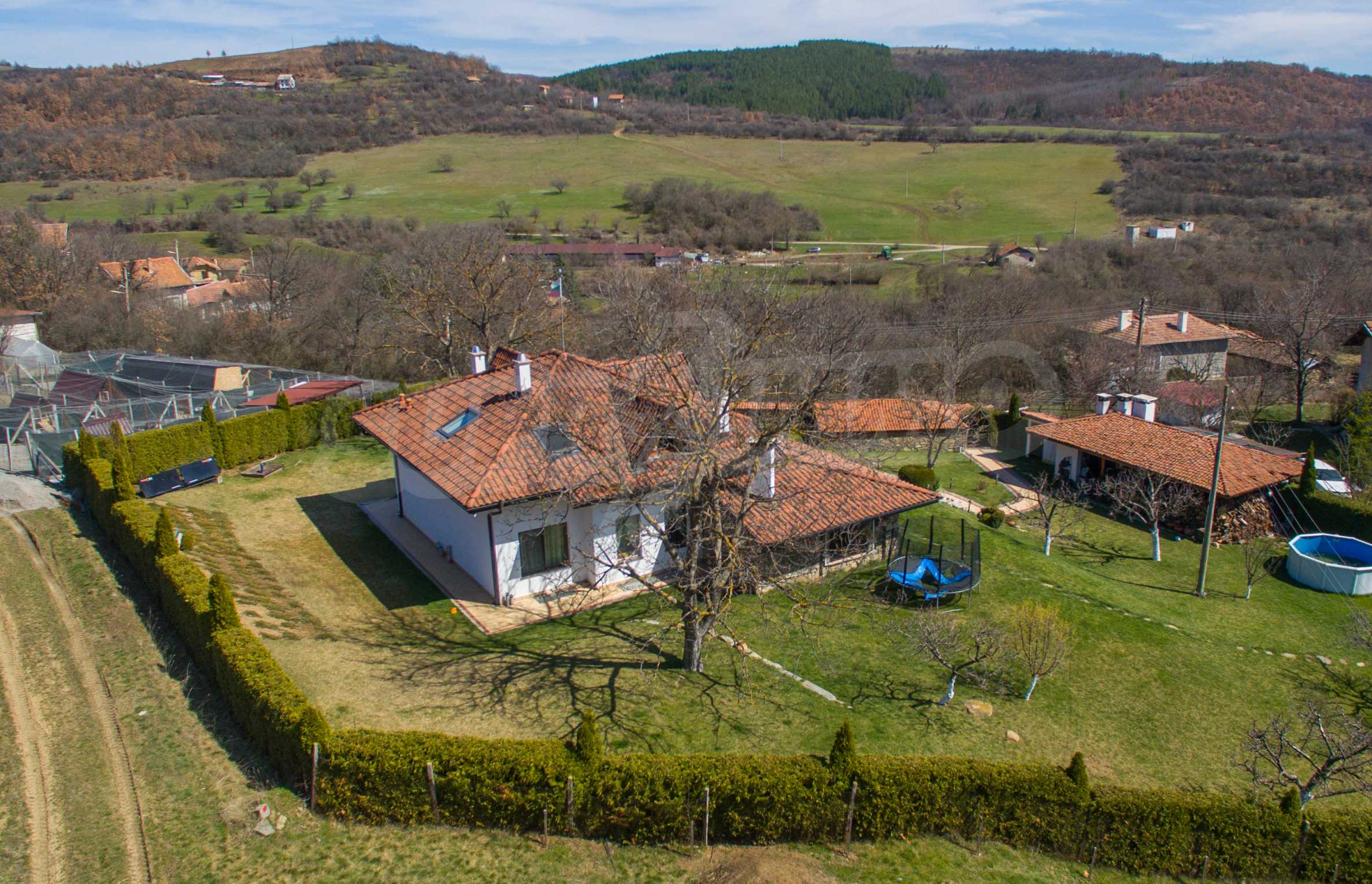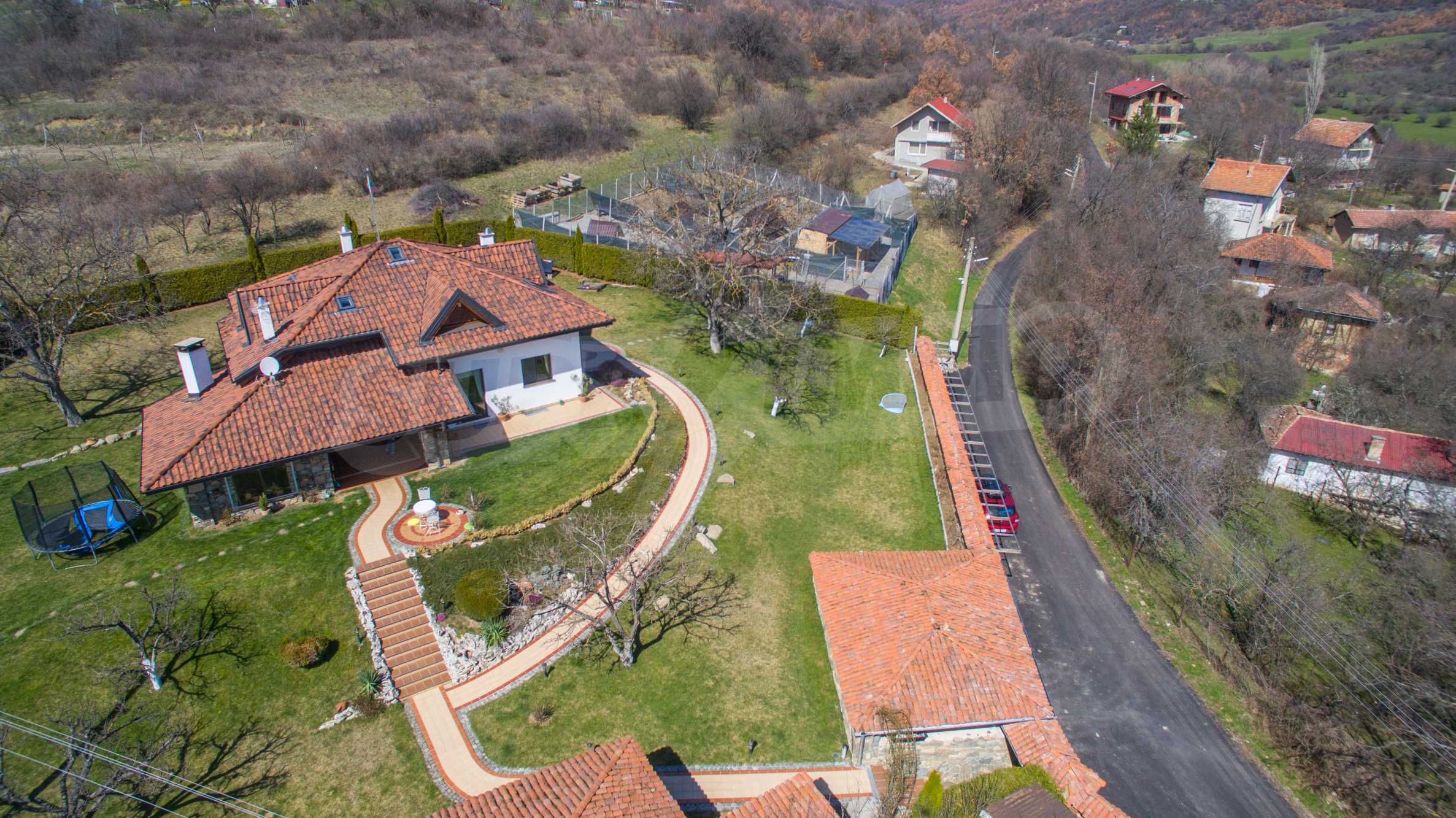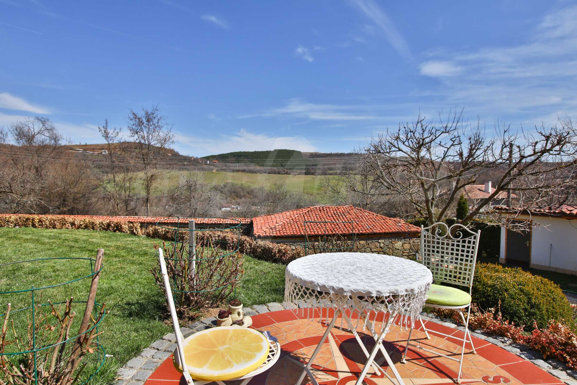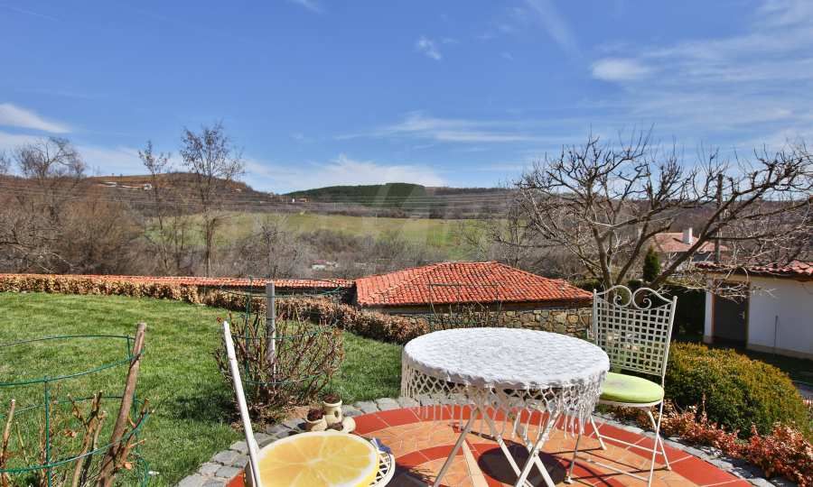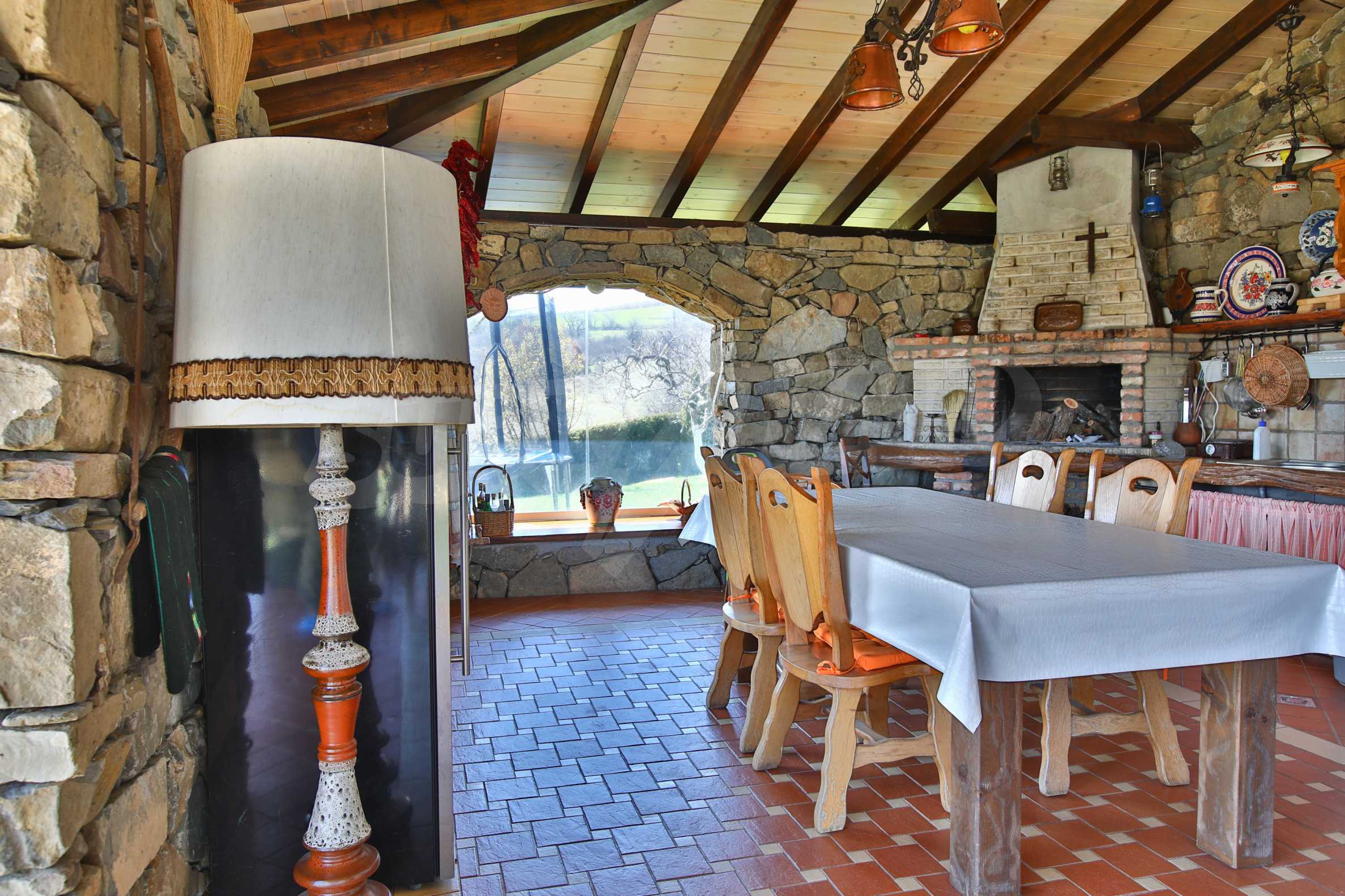 Дворът е 1500 кв.м. озеленен и с изградена поливна система, има навес със пещ и огнище.