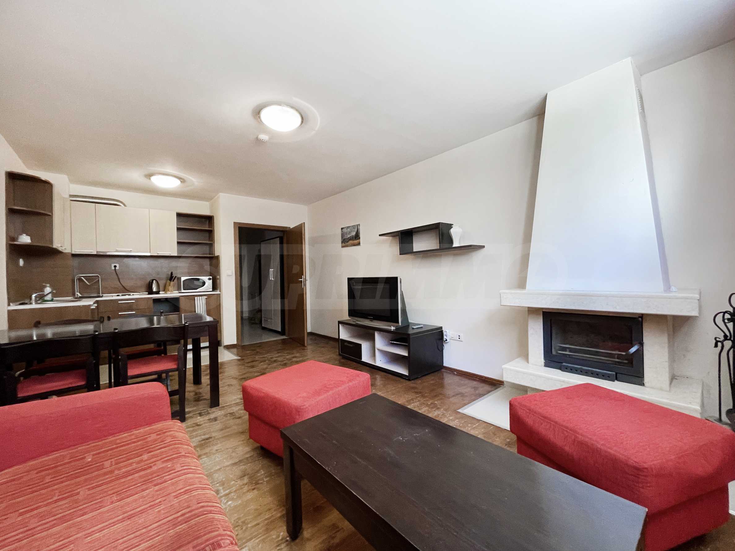 Разпределението на имота е: входно антре, хол с камина и кухненски бокс, две спални и баня с тоалетна.