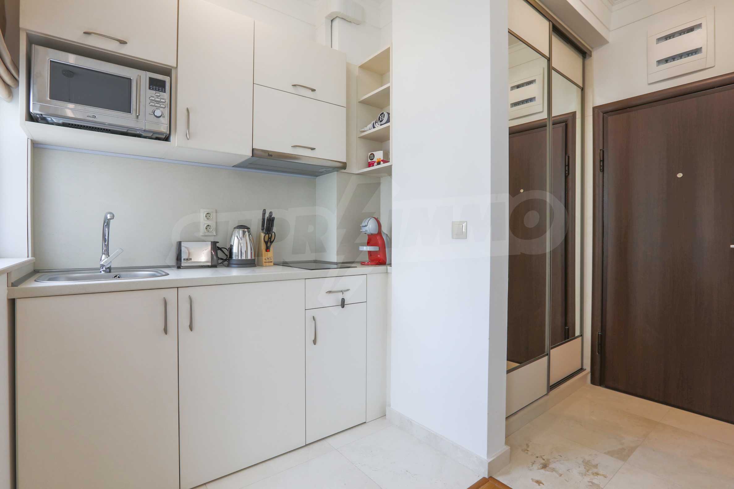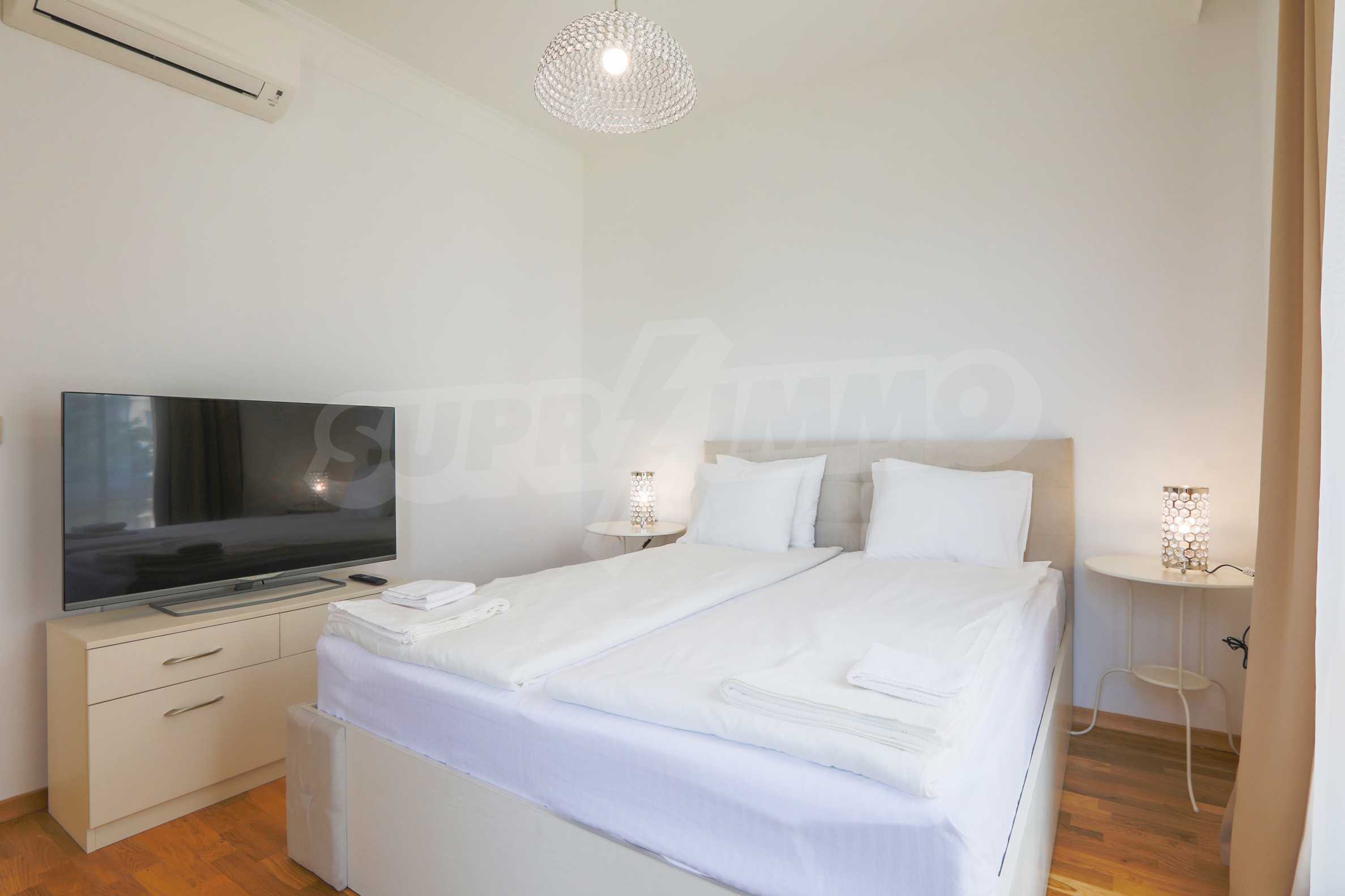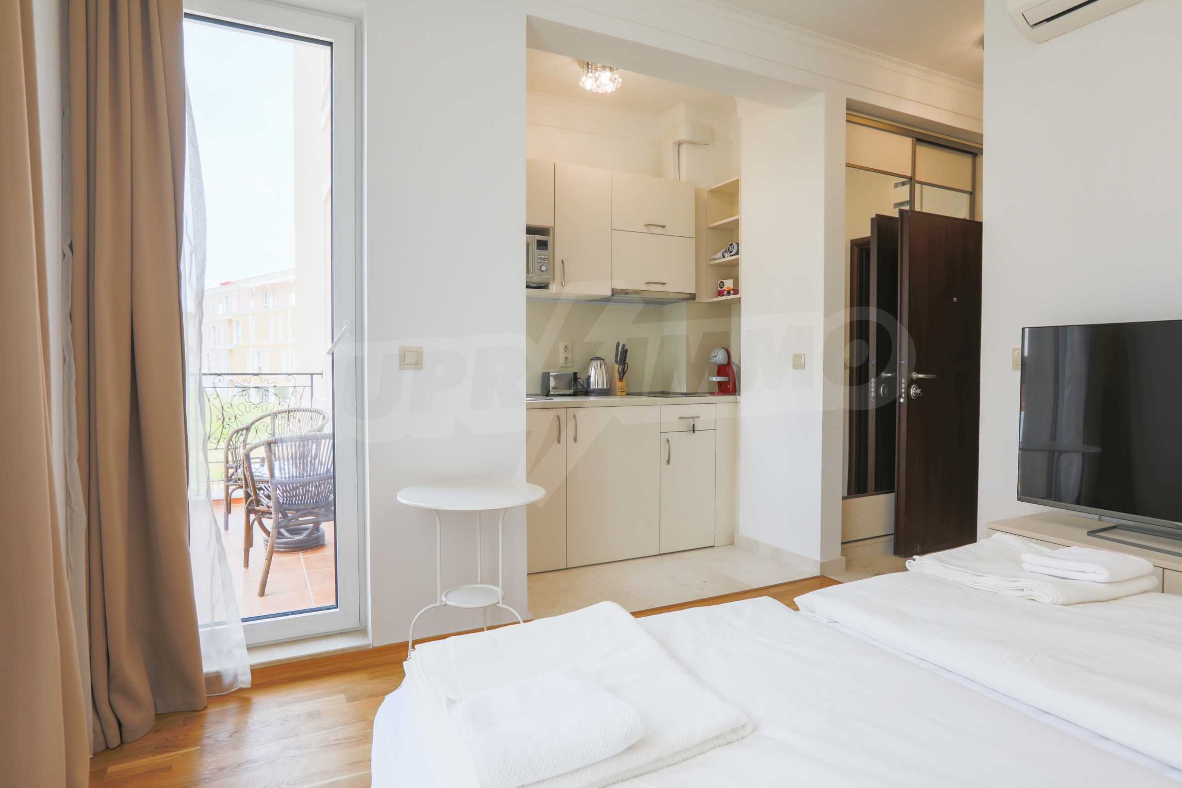 Студиото е с първокласни довършителни работи, което допринася за най-комфортното пребиваване и отдих на метри от пясъчния плаж. Имотът предлага съвременен интериор в светли тонове, комфортна зона-спалня, оборудвана кухня с електроуреди, мебели за съхранение, тераса с градински комплект за отдих и просторна баня.
