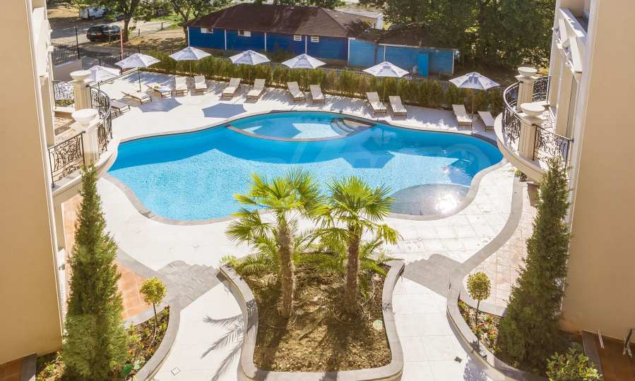 - Открит басейн с луксозни шезлонги, чадъри и балдахинови шатри;