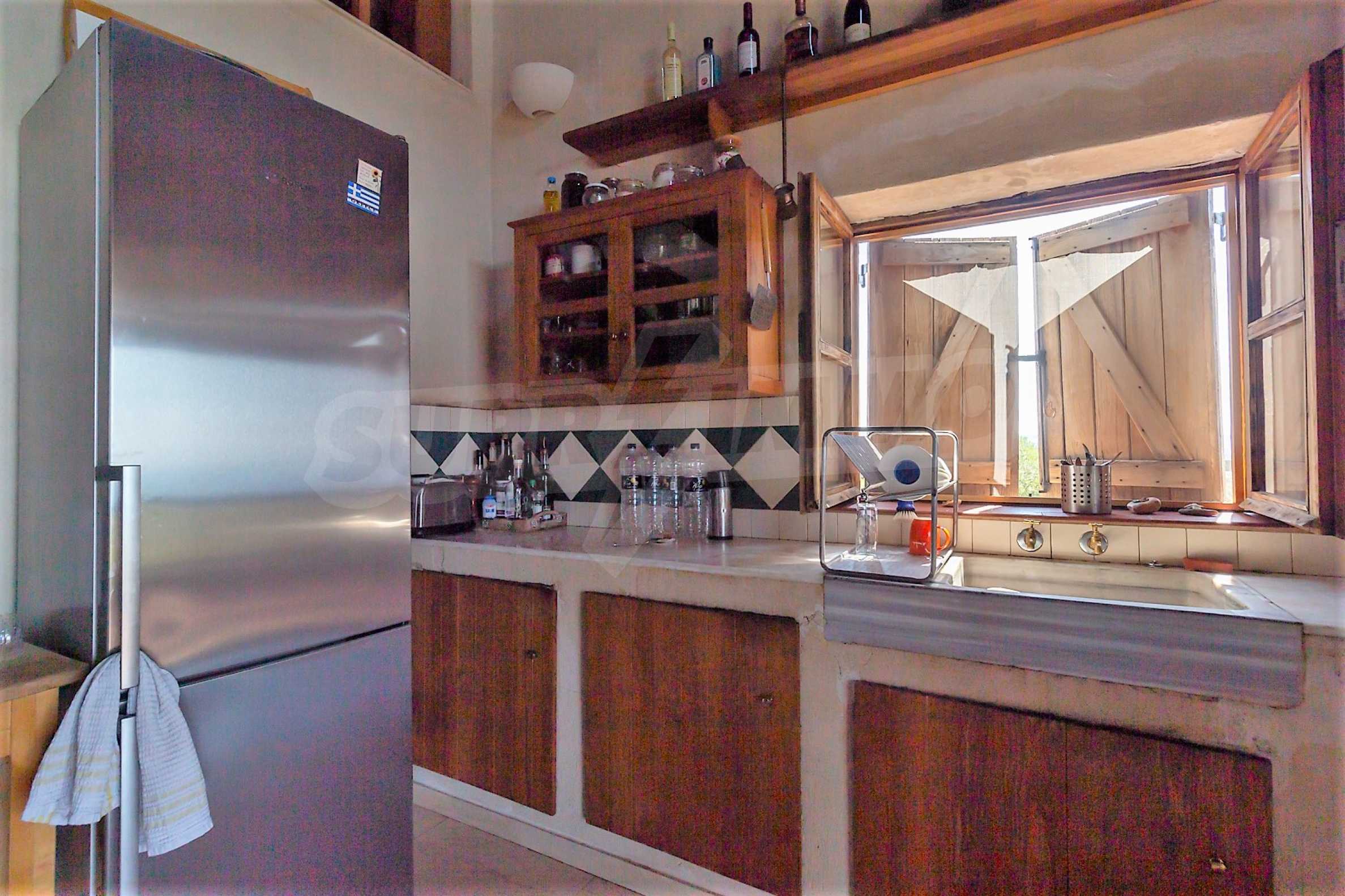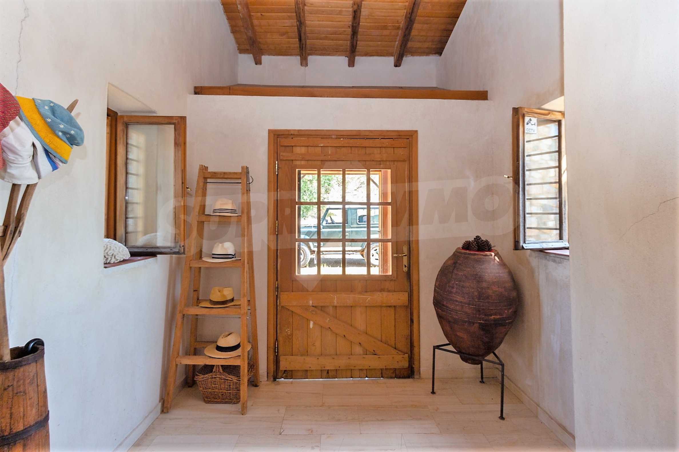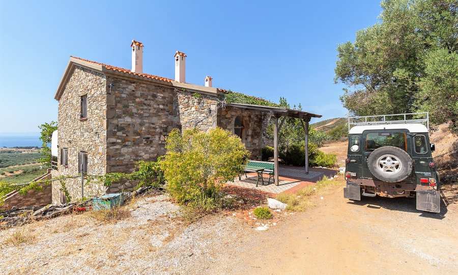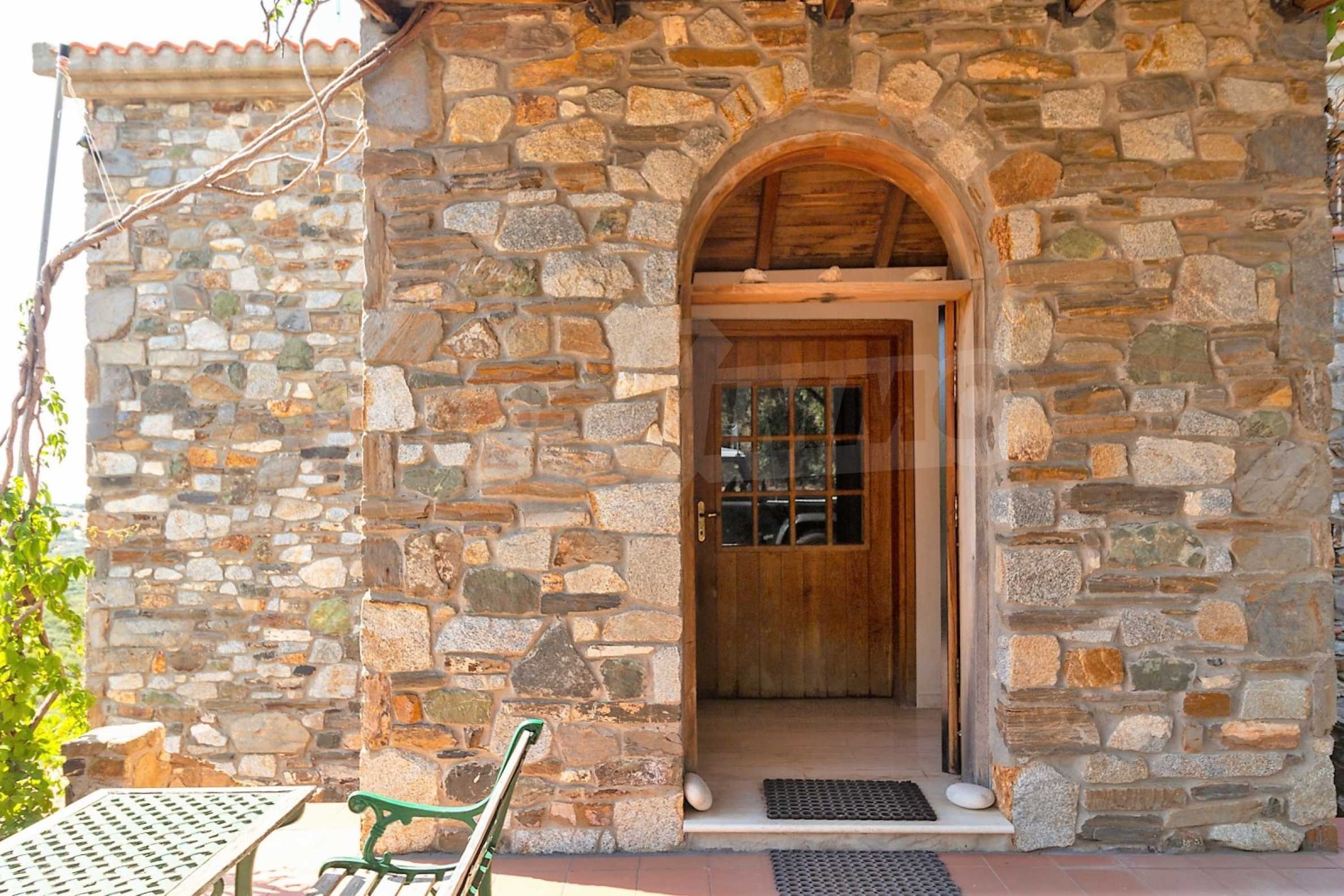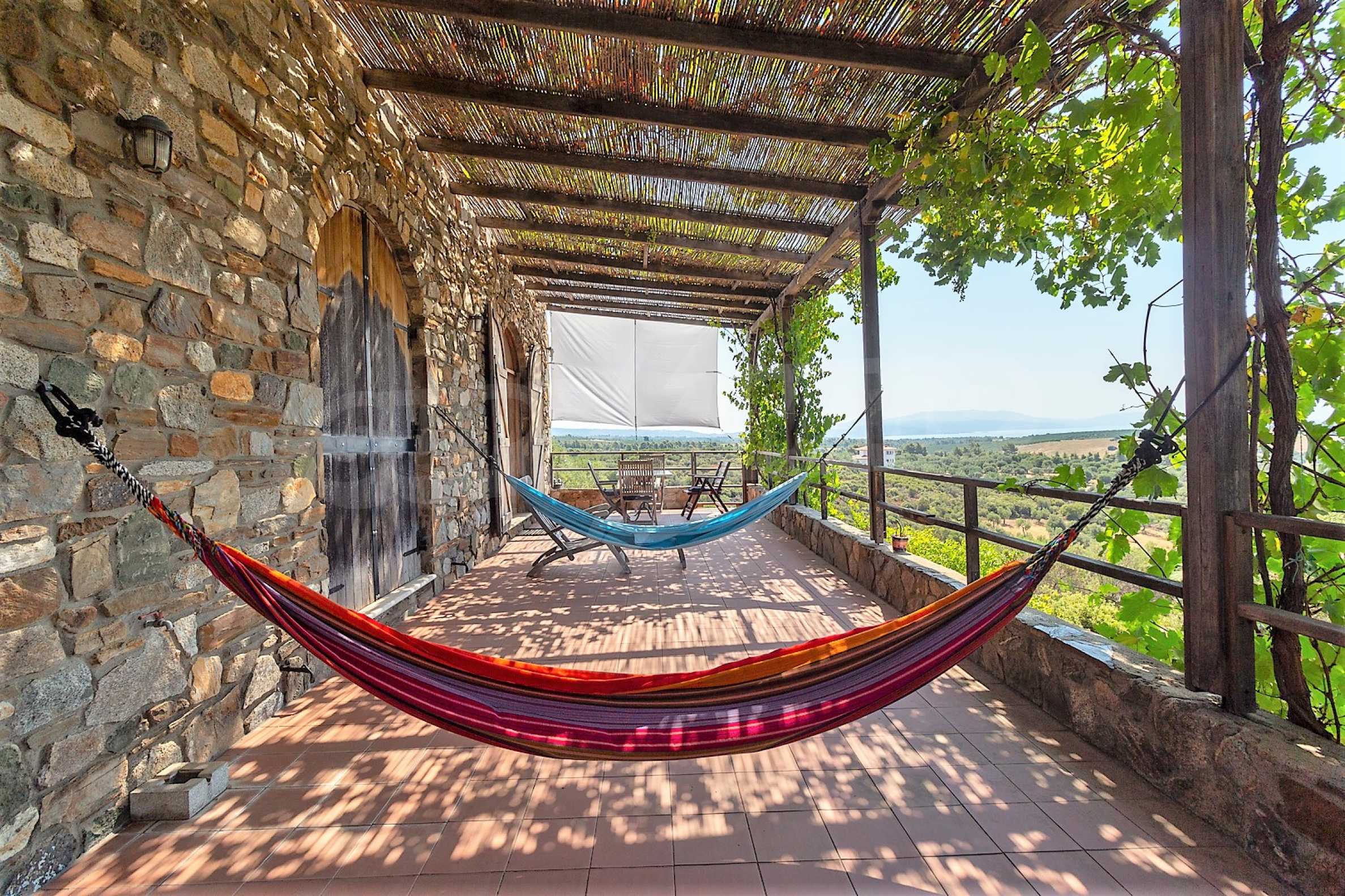 Представяме Ви тази неповторима резиденция в тоскански стил Ситония, Халкидики. Вилата е построена изцяло с естествени материали, камък от Партенонас, кестеново дърво от Света гора-Атон, стените умишлено са измазани с хоросан за да се подсили ефекта за тосканска автентичност, освен това, тези естествени и висококачествени материали действат като естествена излоация, която подържа постоянна температъра във вилата зима и лято. Имота включва и 14 декара земя, 4 от които са маслинова гора.