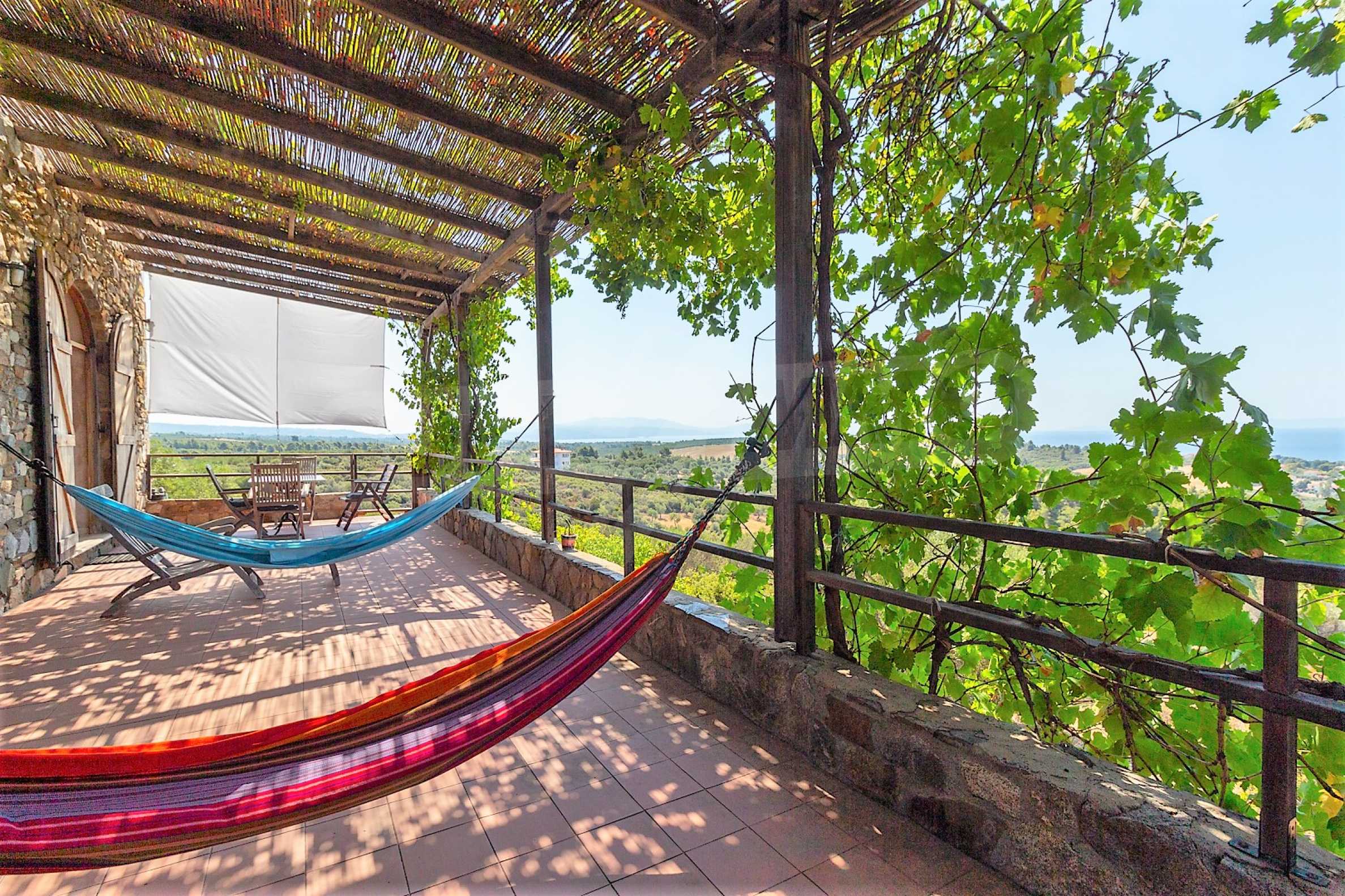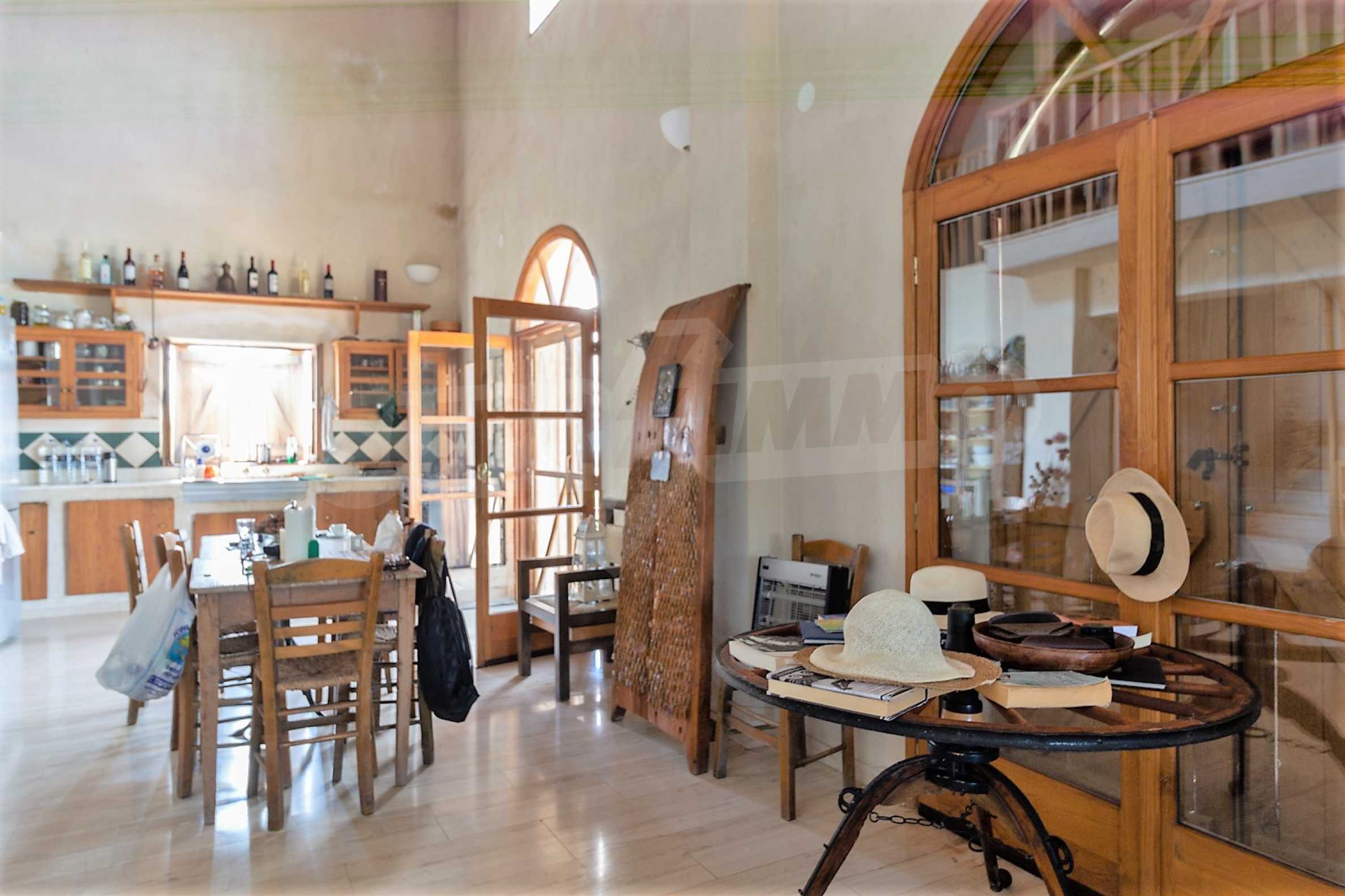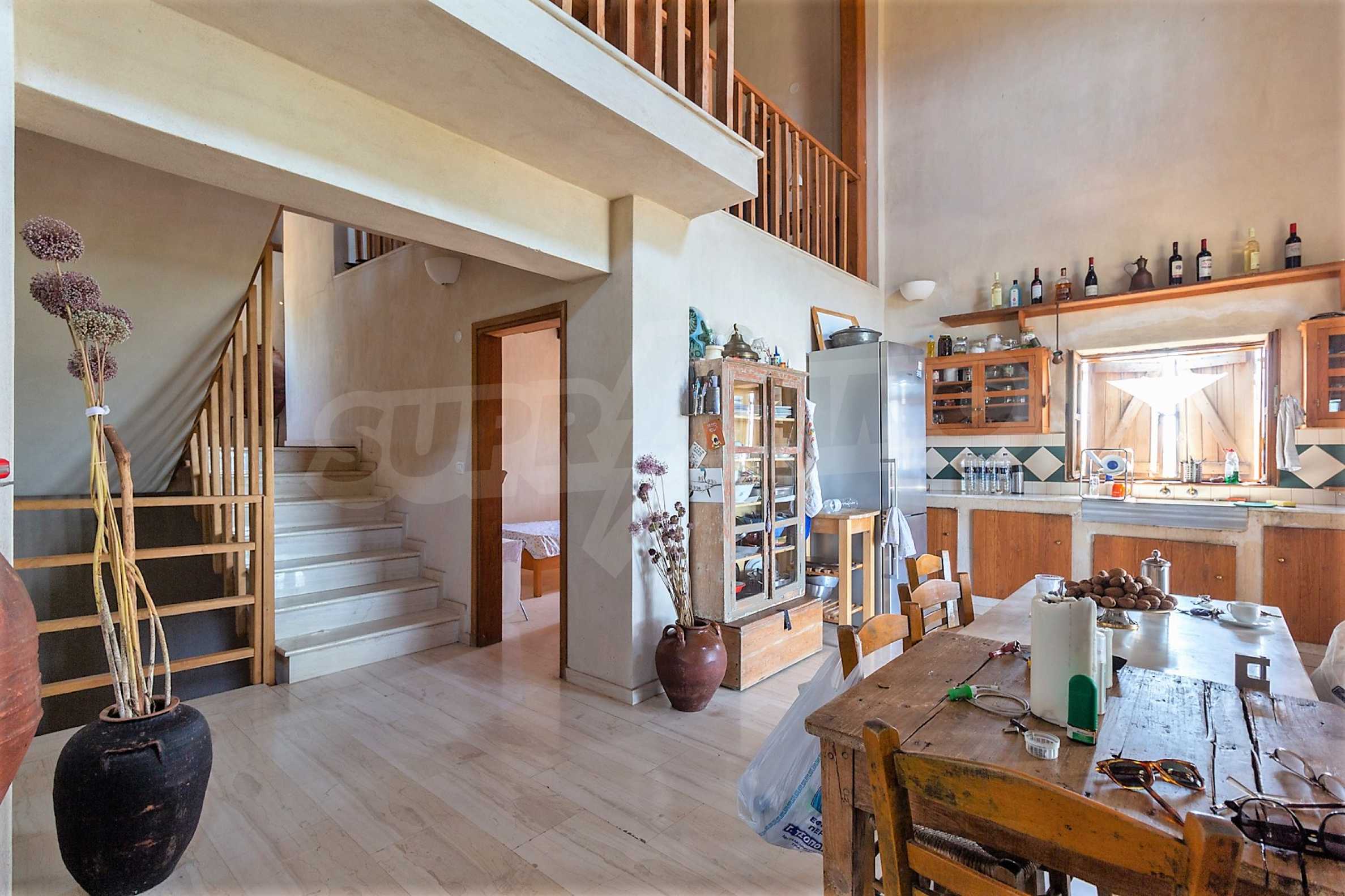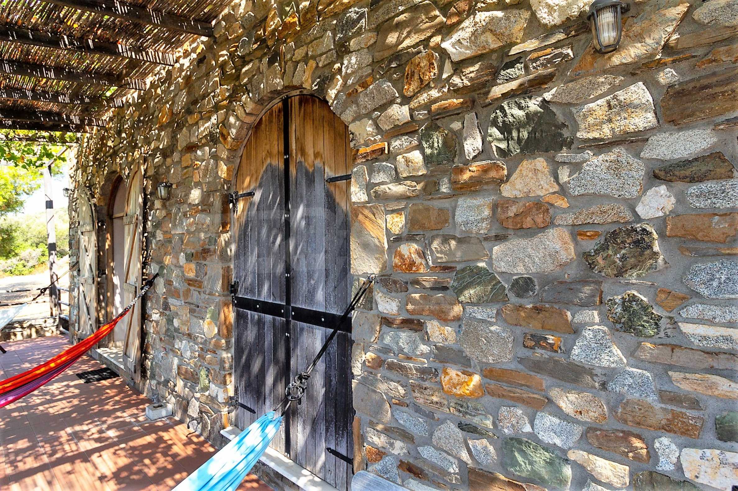 Представяме Ви тази неповторима резиденция в тоскански стил Ситония, Халкидики. Вилата е построена изцяло с естествени материали, камък от Партенонас, кестеново дърво от Света гора-Атон, стените умишлено са измазани с хоросан за да се подсили ефекта за тосканска автентичност, освен това, тези естествени и висококачествени материали действат като естествена излоация, която подържа постоянна температъра във вилата зима и лято. Имота включва и 14 декара земя, 4 от които са маслинова гора.