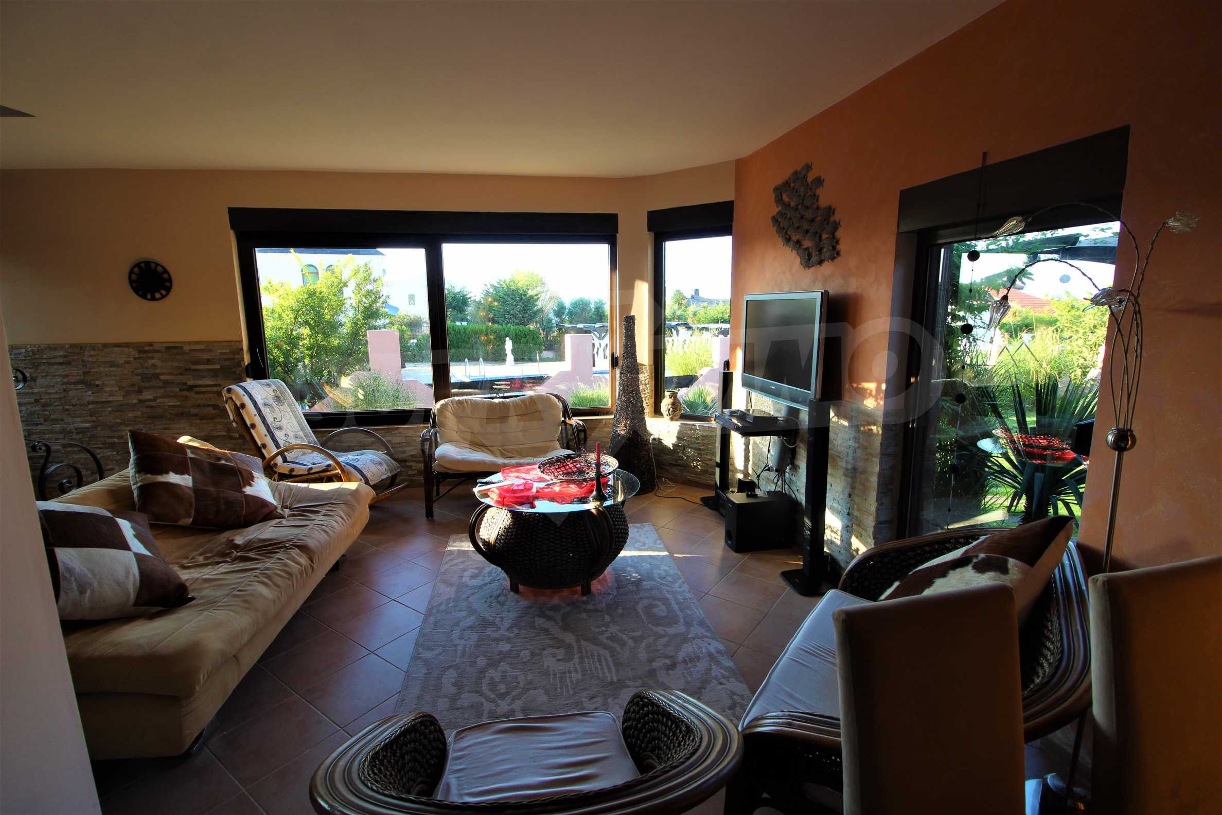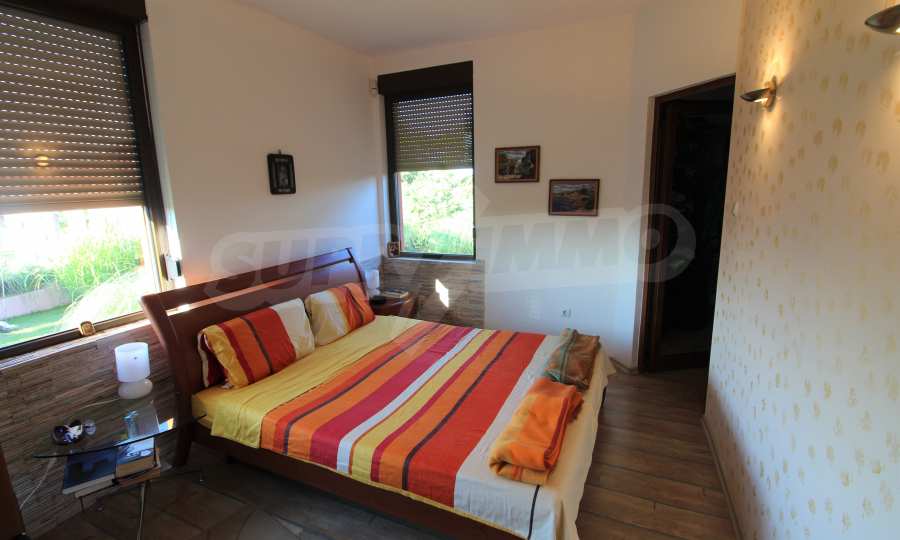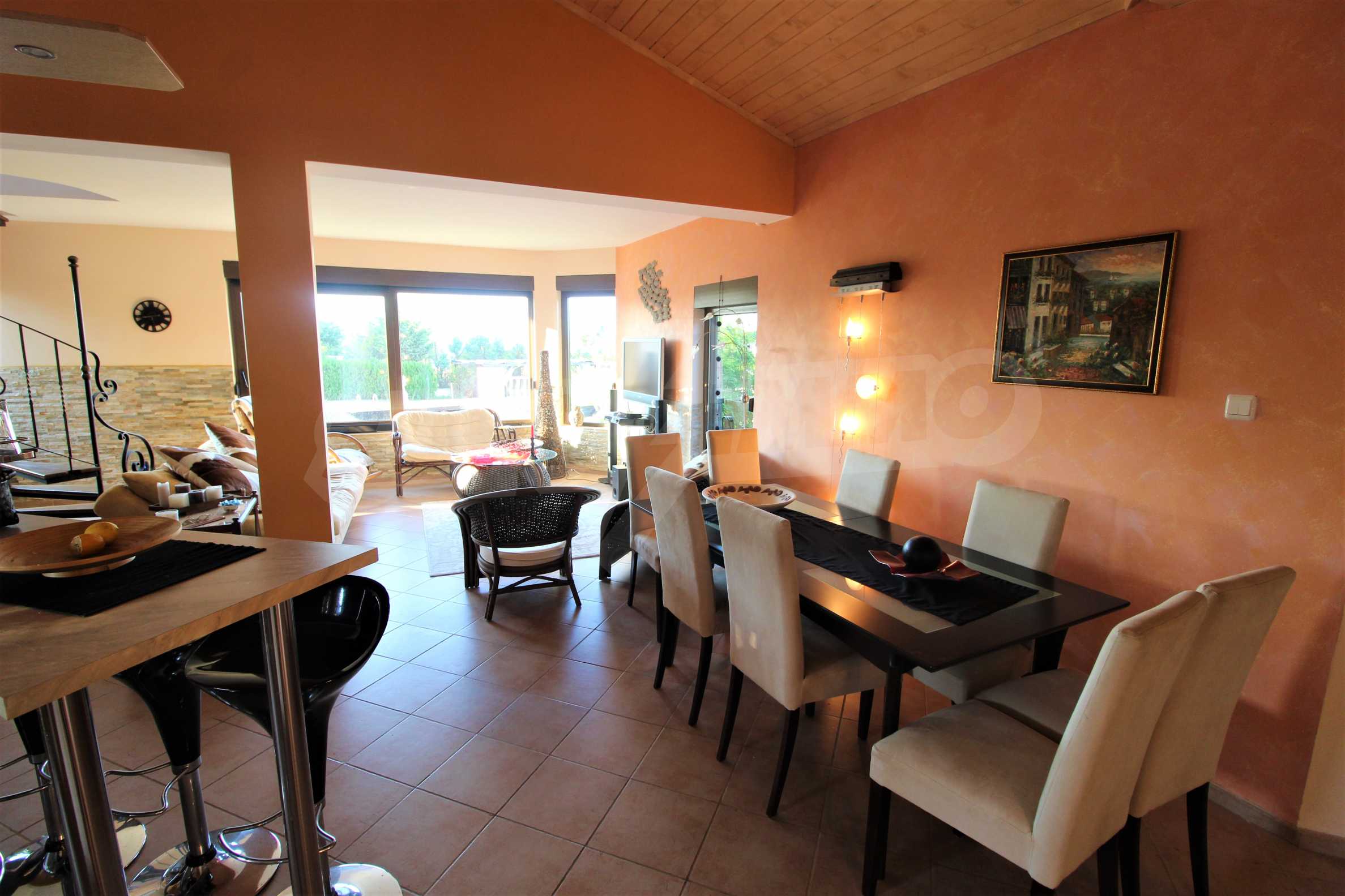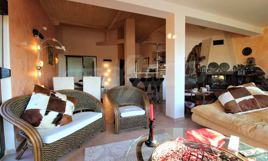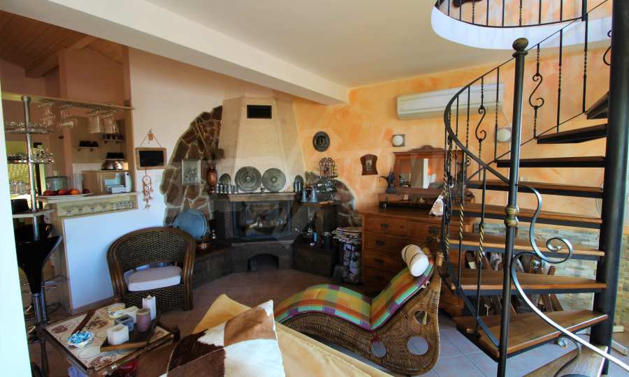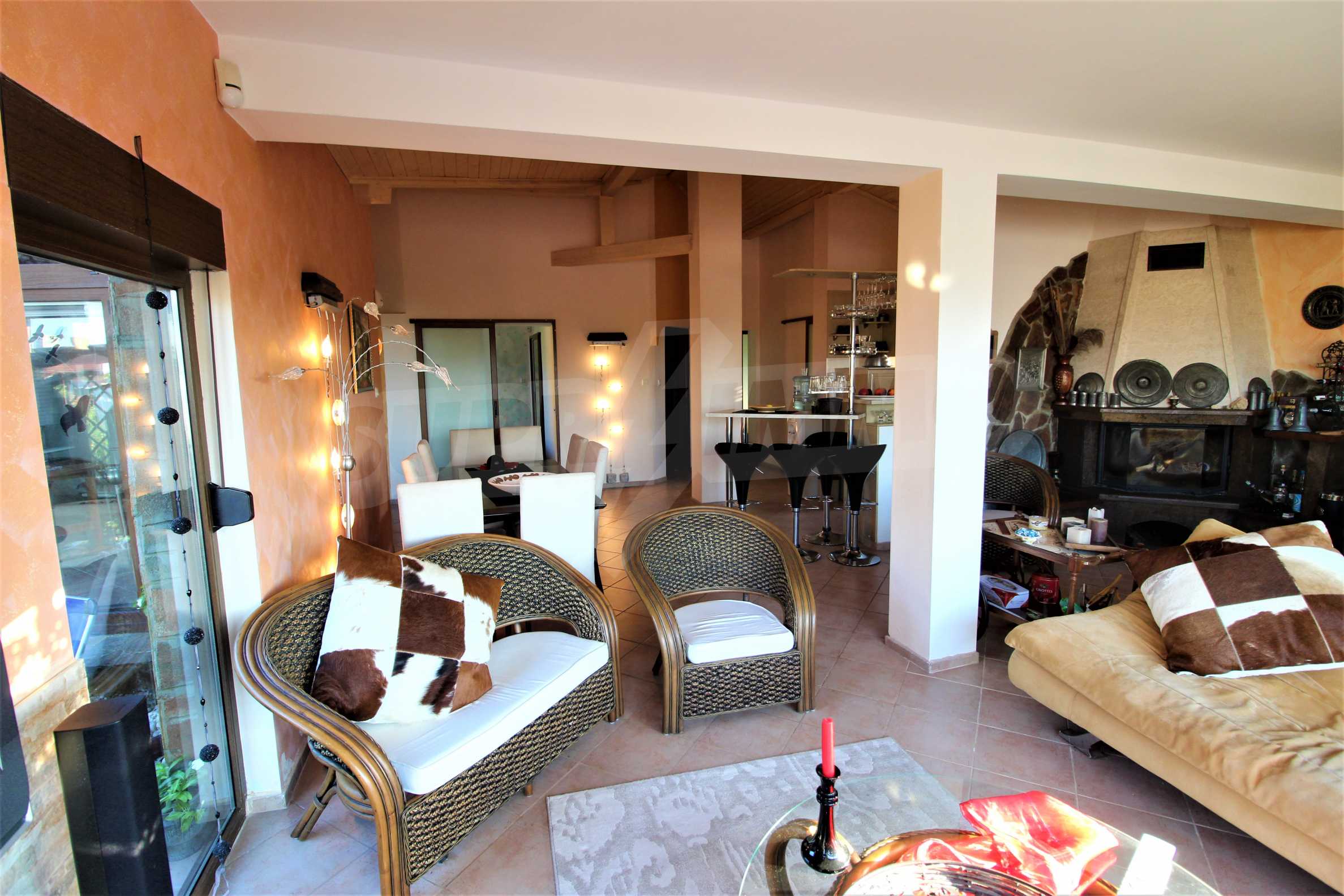 Къщата е качествено и комфортно обзаведена, с атрактивен интериор, решен в топли тонове, от качествени, естествени материали, като камък, дърво, ратан и поръчкови ковани елементи, с декоративни мазилки и ефектни съвременни акценти.
