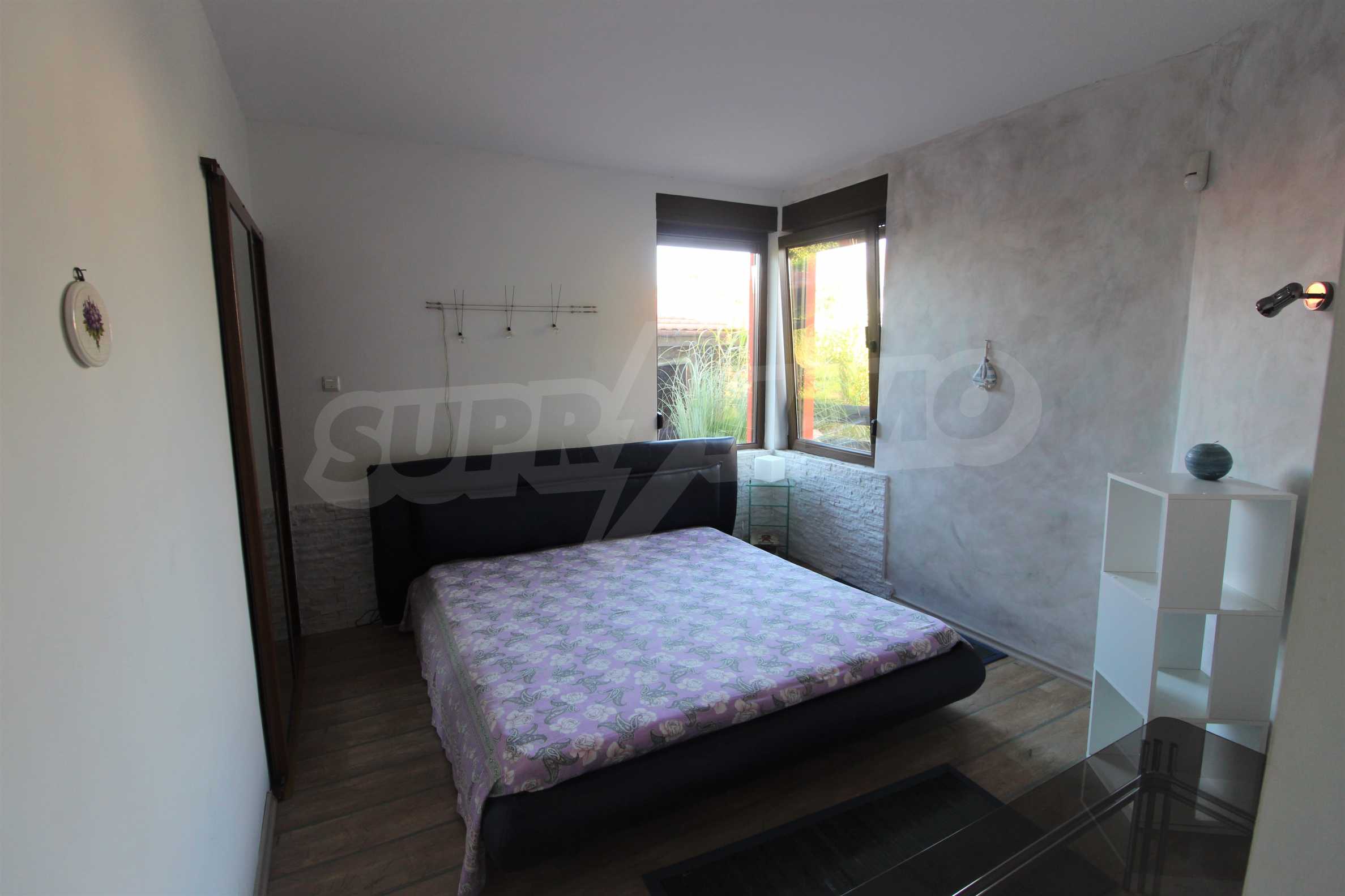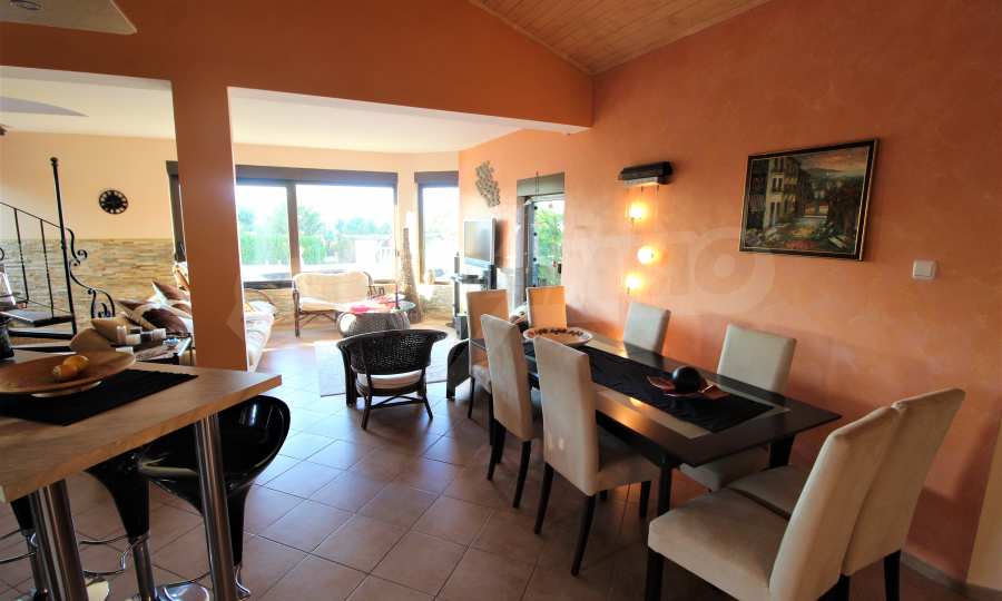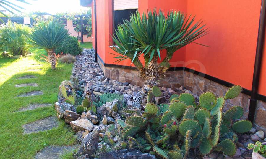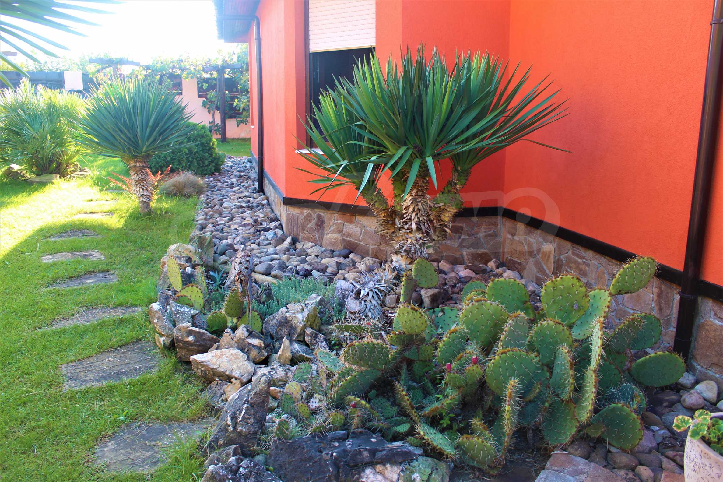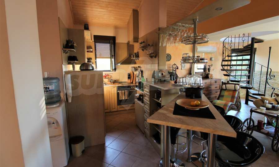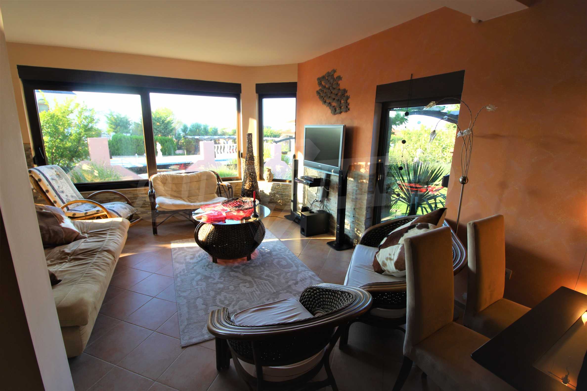 Къщата е качествено и комфортно обзаведена, с атрактивен интериор, решен в топли тонове, от качествени, естествени материали, като камък, дърво, ратан и поръчкови ковани елементи, с декоративни мазилки и ефектни съвременни акценти.